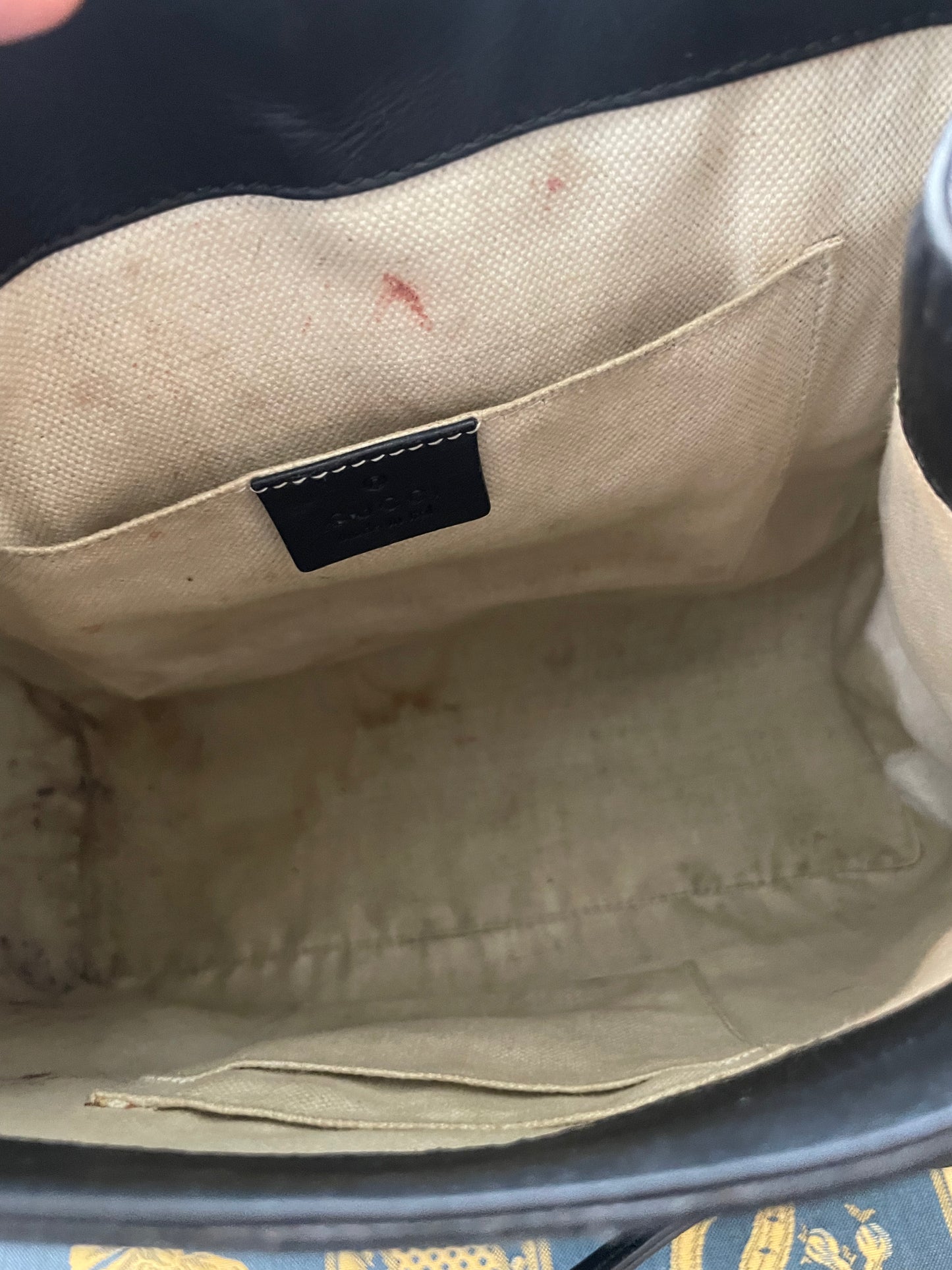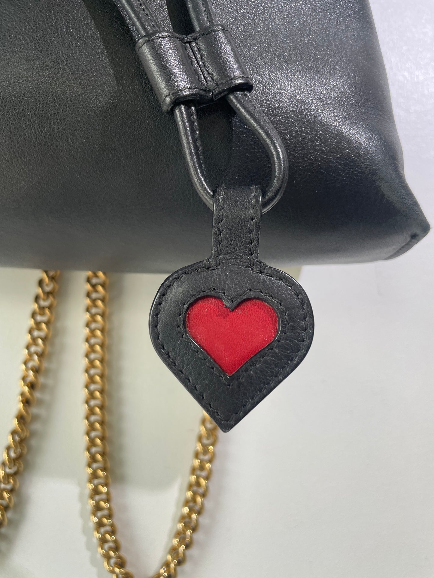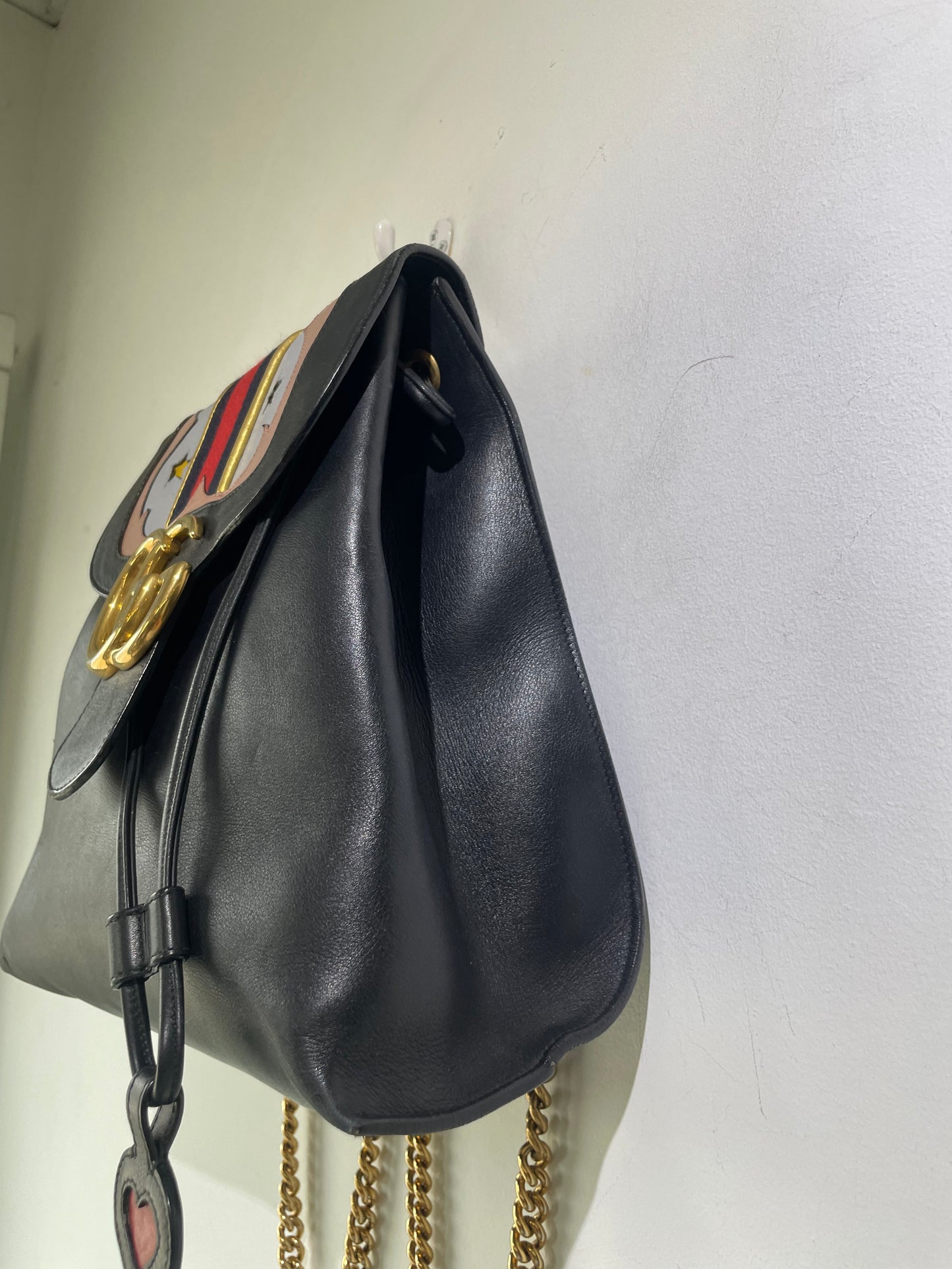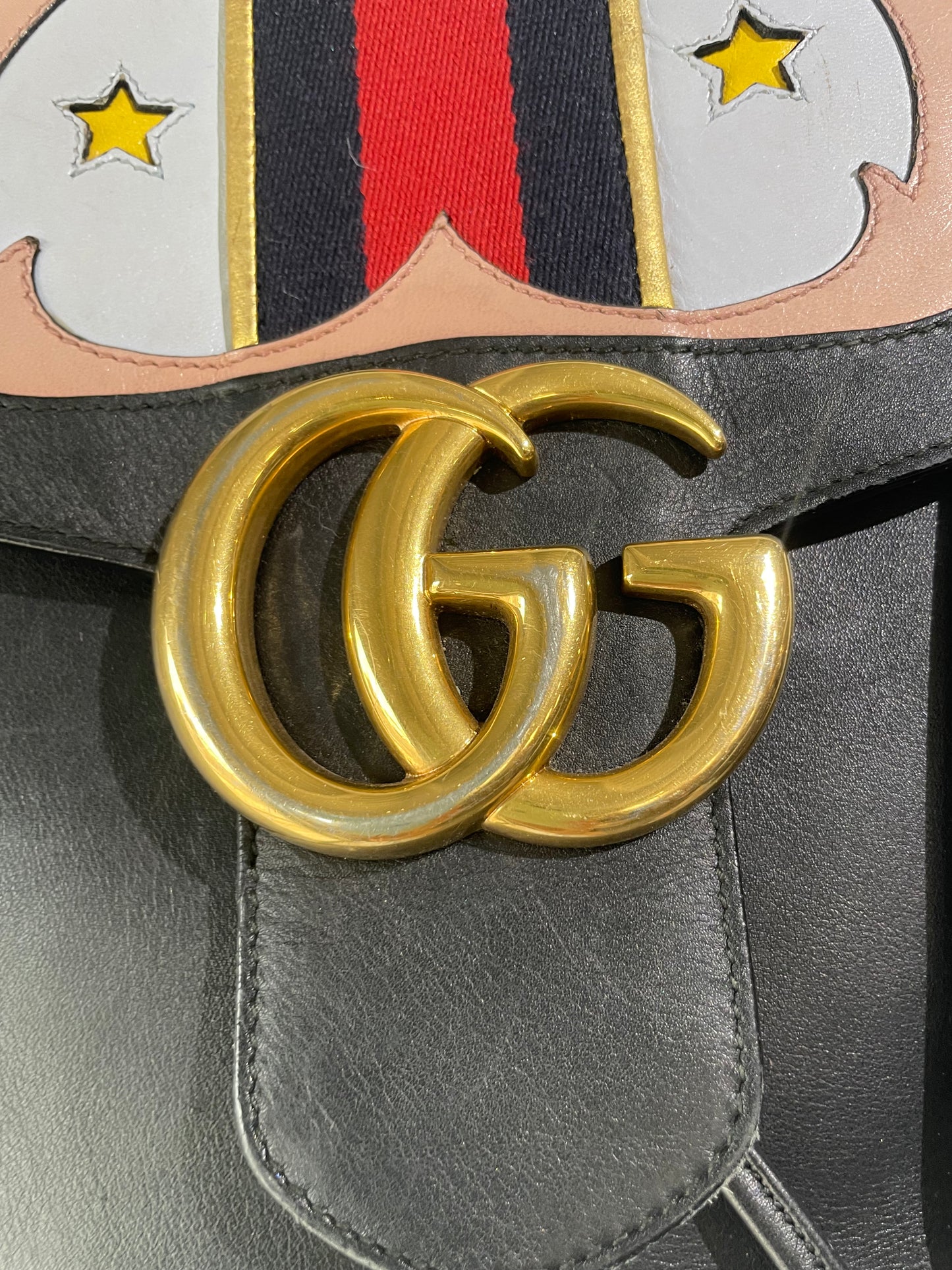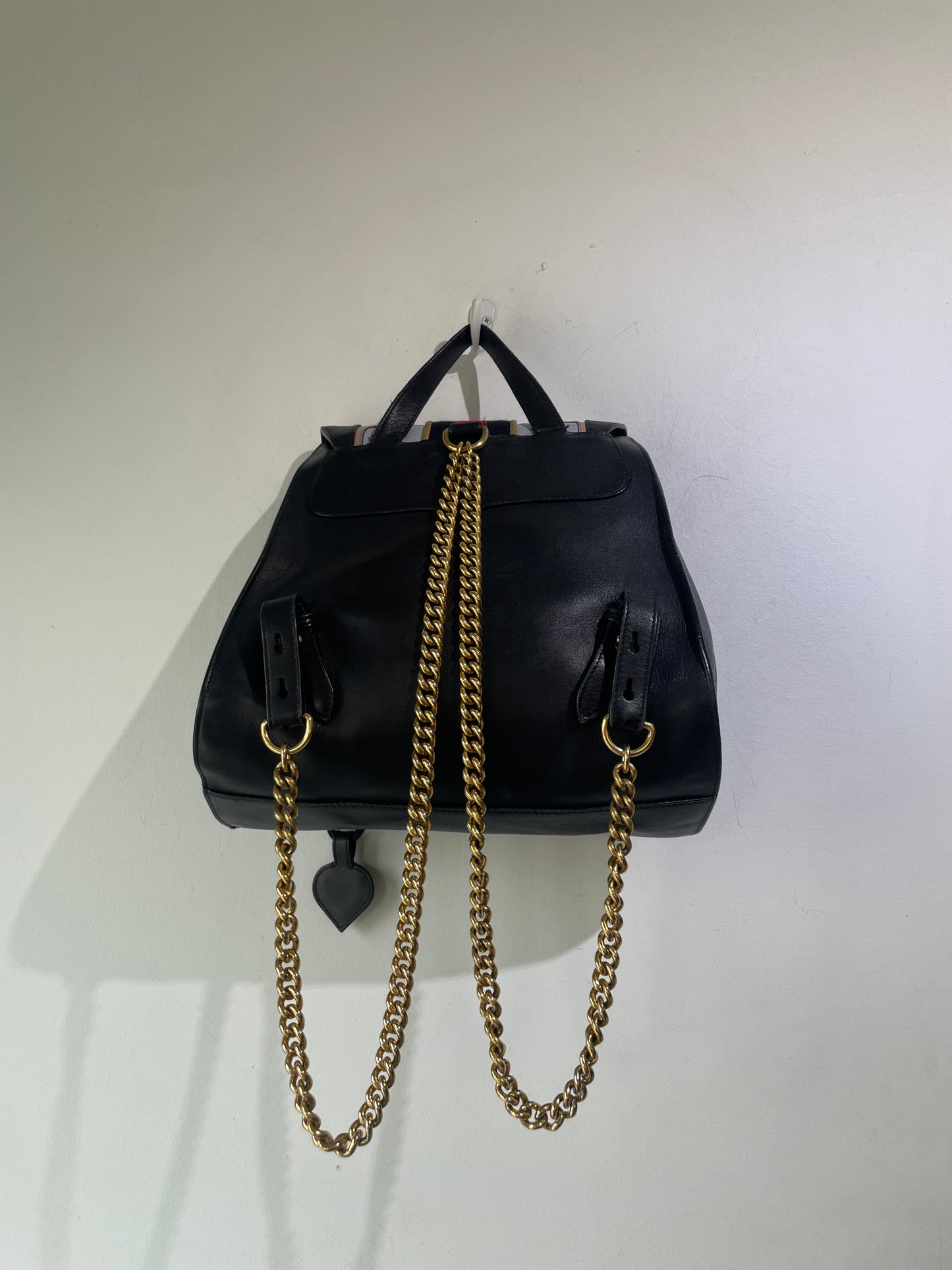 Gucci Marmont Navy Backpack with Heart Charm! A stylish leather backpack with brass chain straps from Gucci. Featuring the iconic double G in gold on front, heart tag, and multicolored leather details. Made in Italy. In very good condition, with some wear on interior from use and minor marks on surface and at corners. Measurements are approx. 11" x 11" at widest.