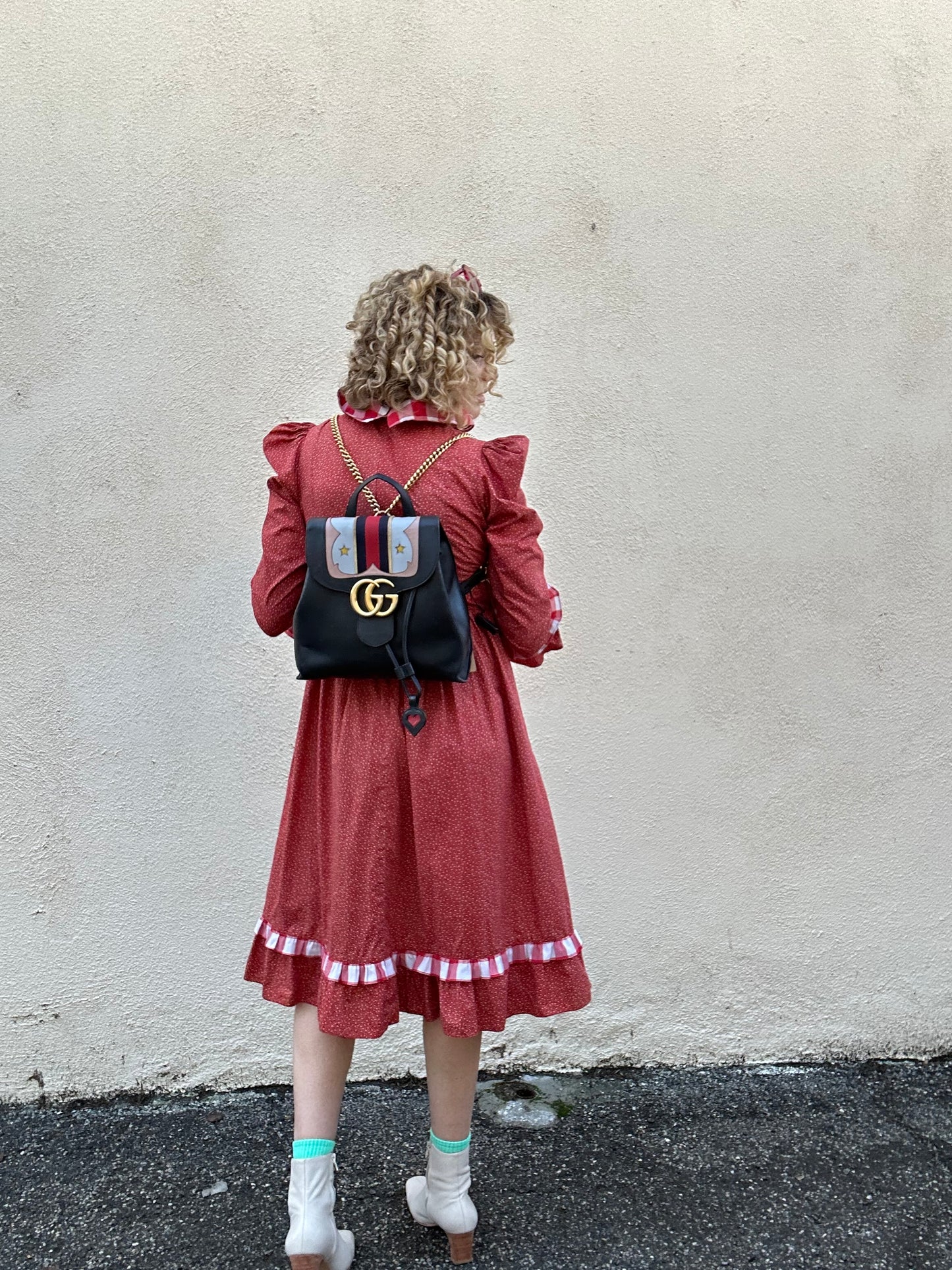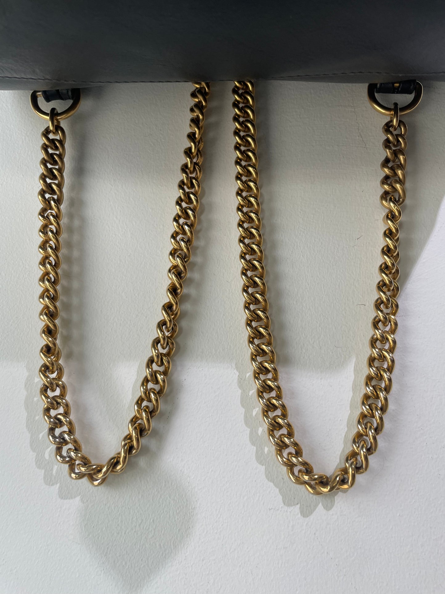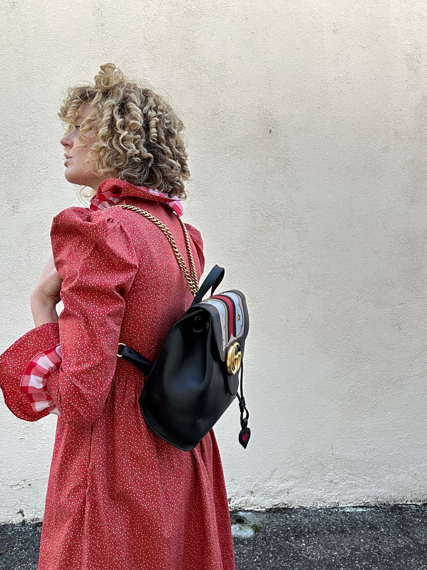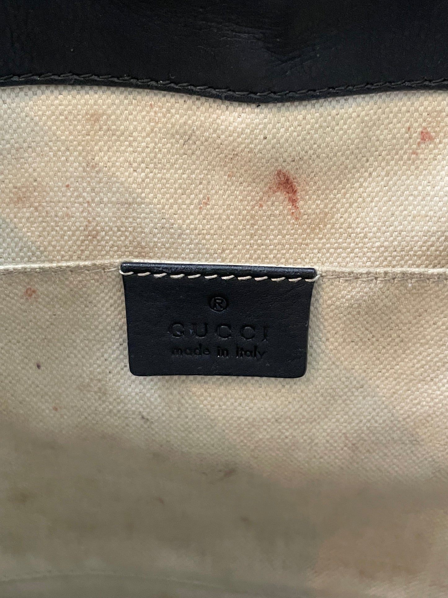 Gucci Marmont Navy Backpack with Heart Charm! A stylish leather backpack with brass chain straps from Gucci. Featuring the iconic double G in gold on front, heart tag, and multicolored leather details. Made in Italy. In very good condition, with some wear on interior from use and minor marks on surface and at corners. Measurements are approx. 11" x 11" at widest.