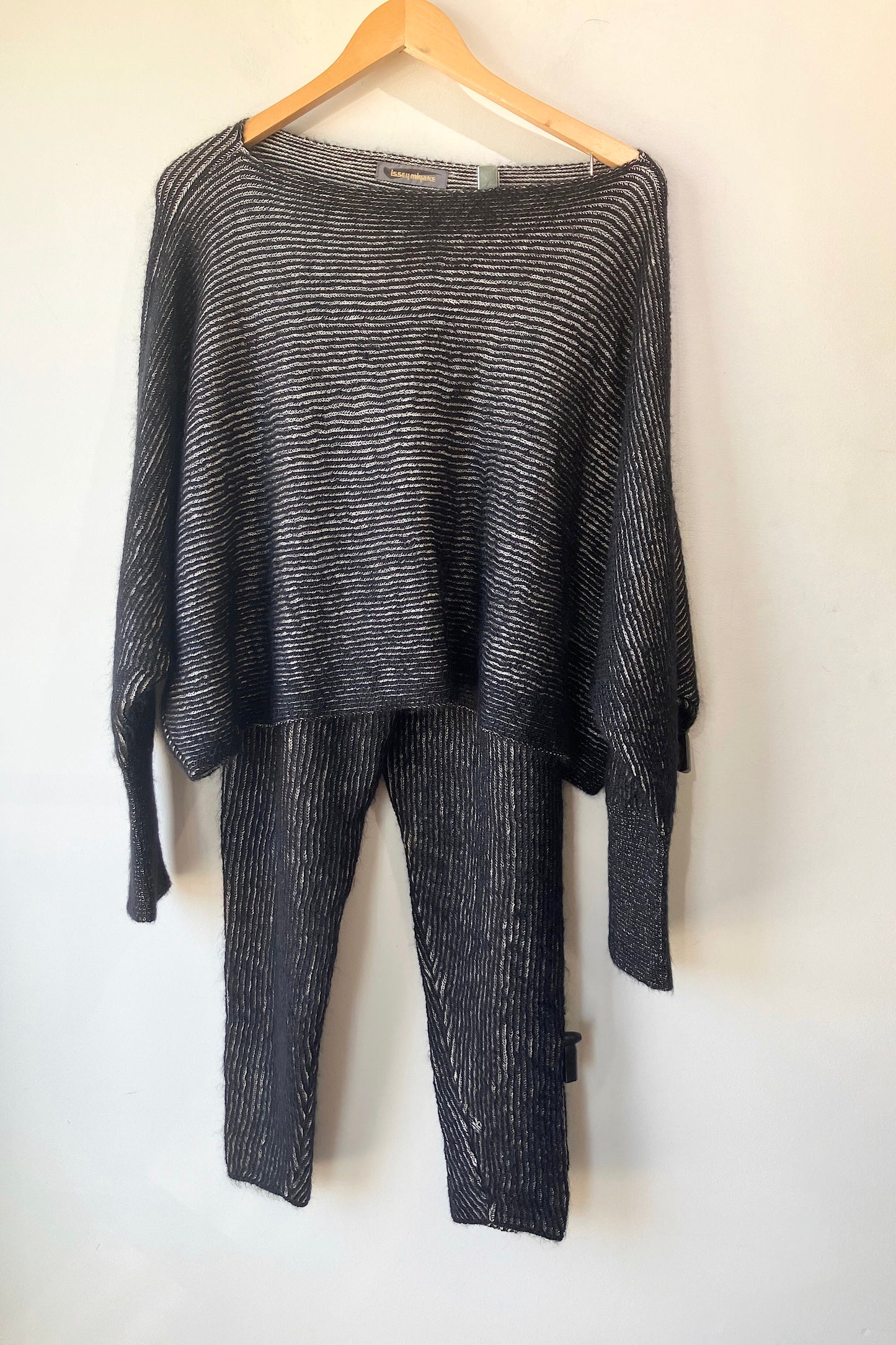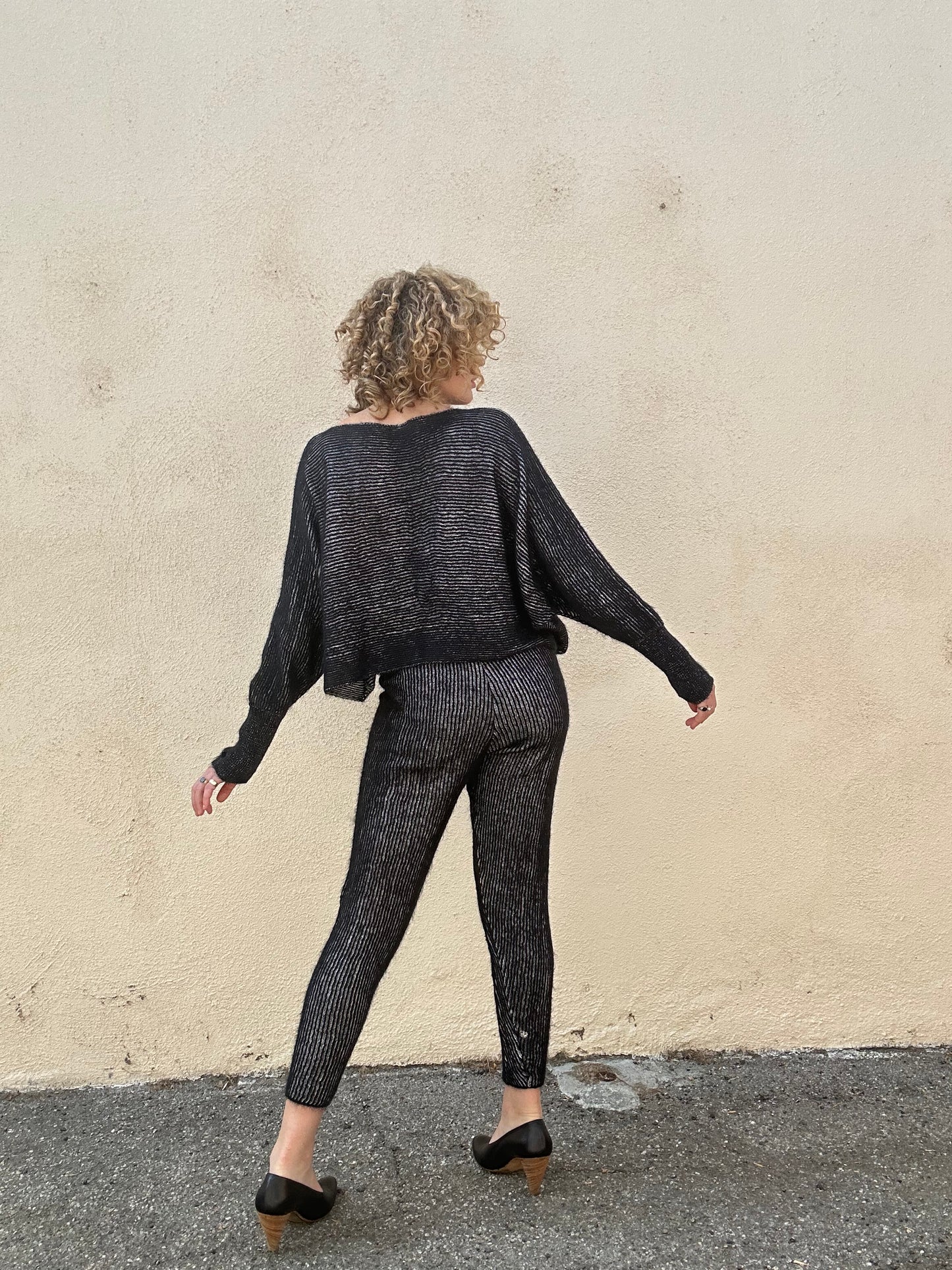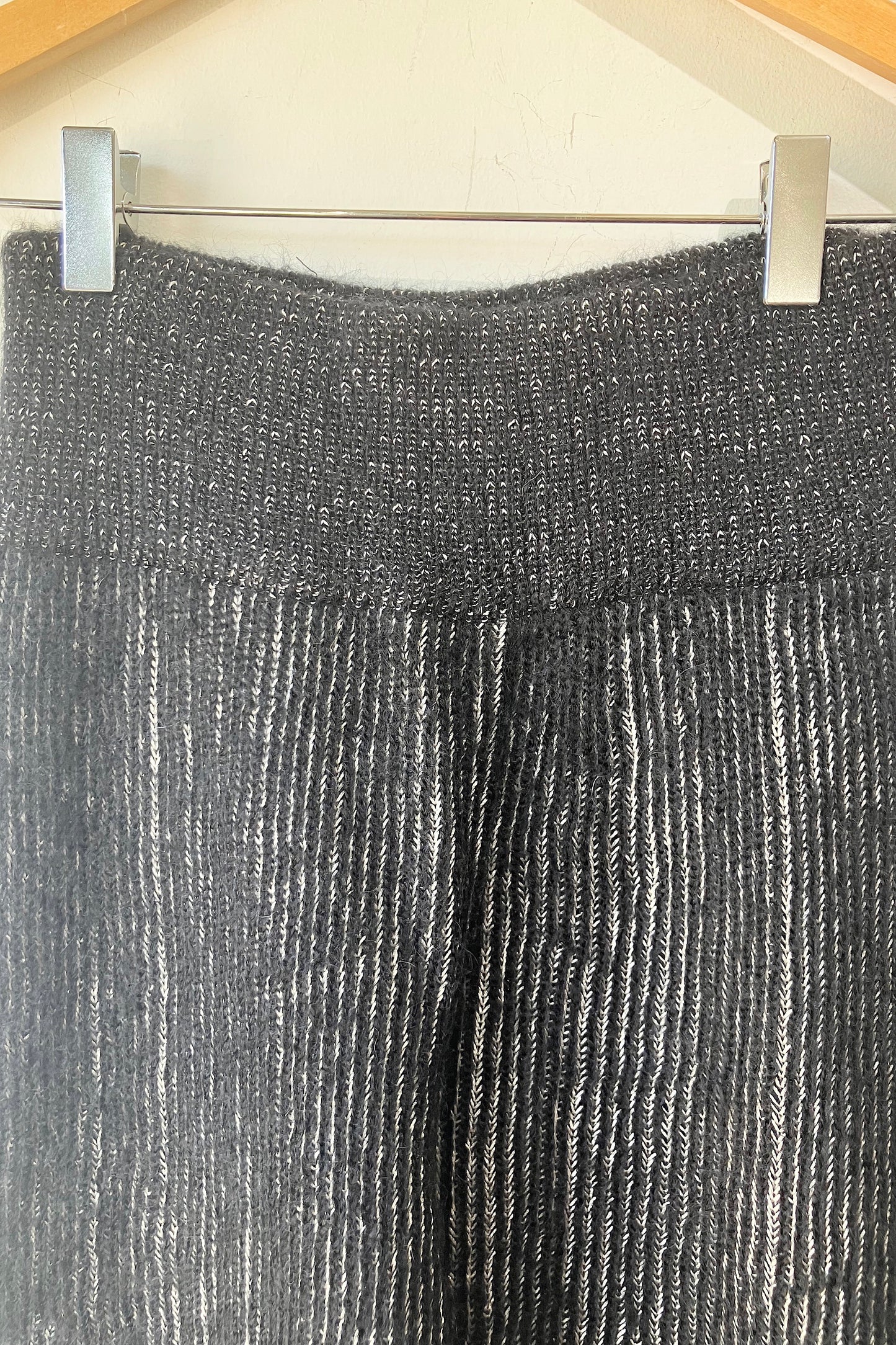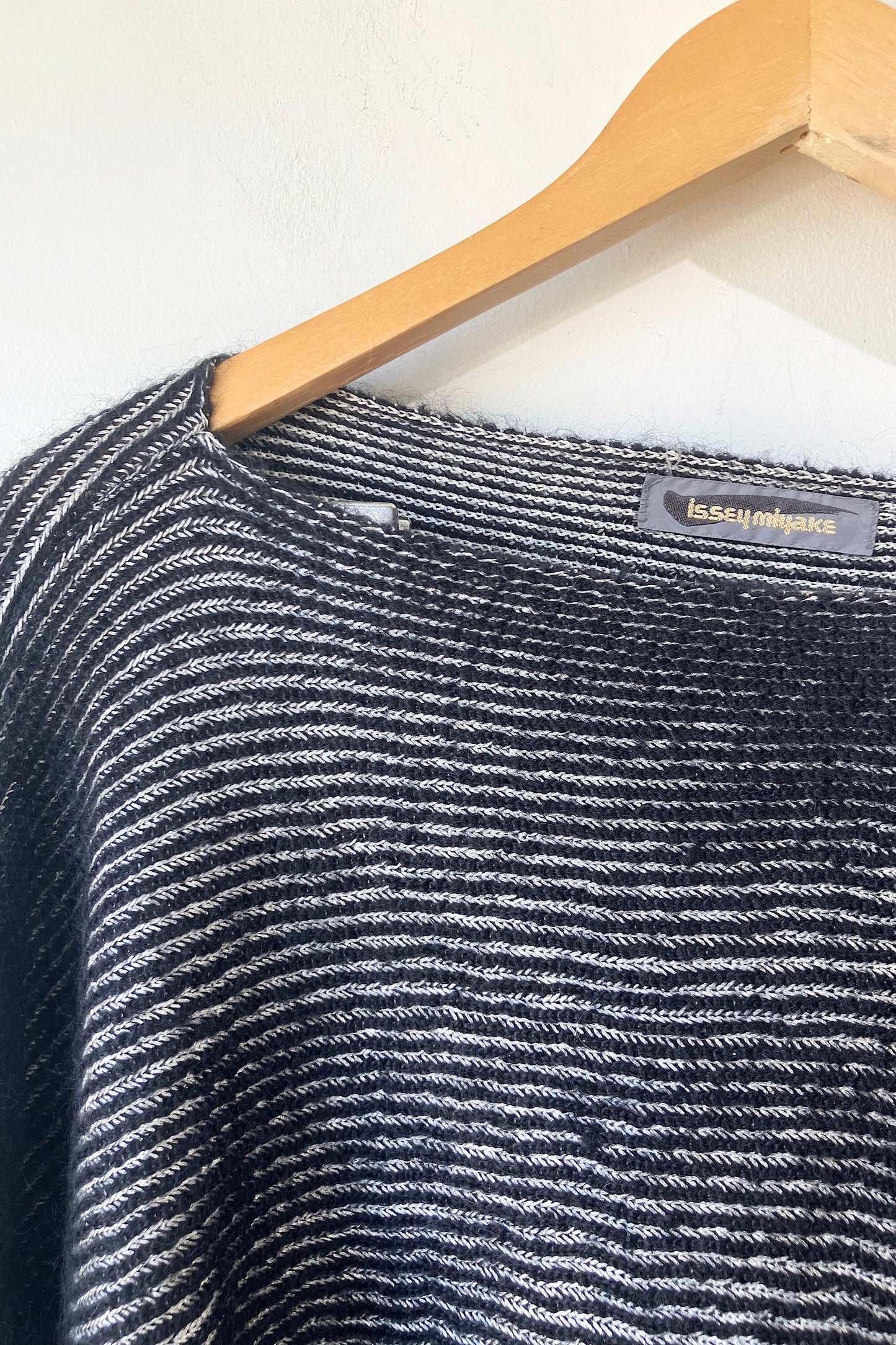 Vintage Issey Miyake Black White Knit Pants Set. Good vintage condition, has a few holes near wearers right pant cuff. Plaited rib soft knit set. Dolman sleeve pullover and easy pull on pants with tapered leg. 50% wool 50% rayon, dry clean only. Marked as size M. Made in Japan.