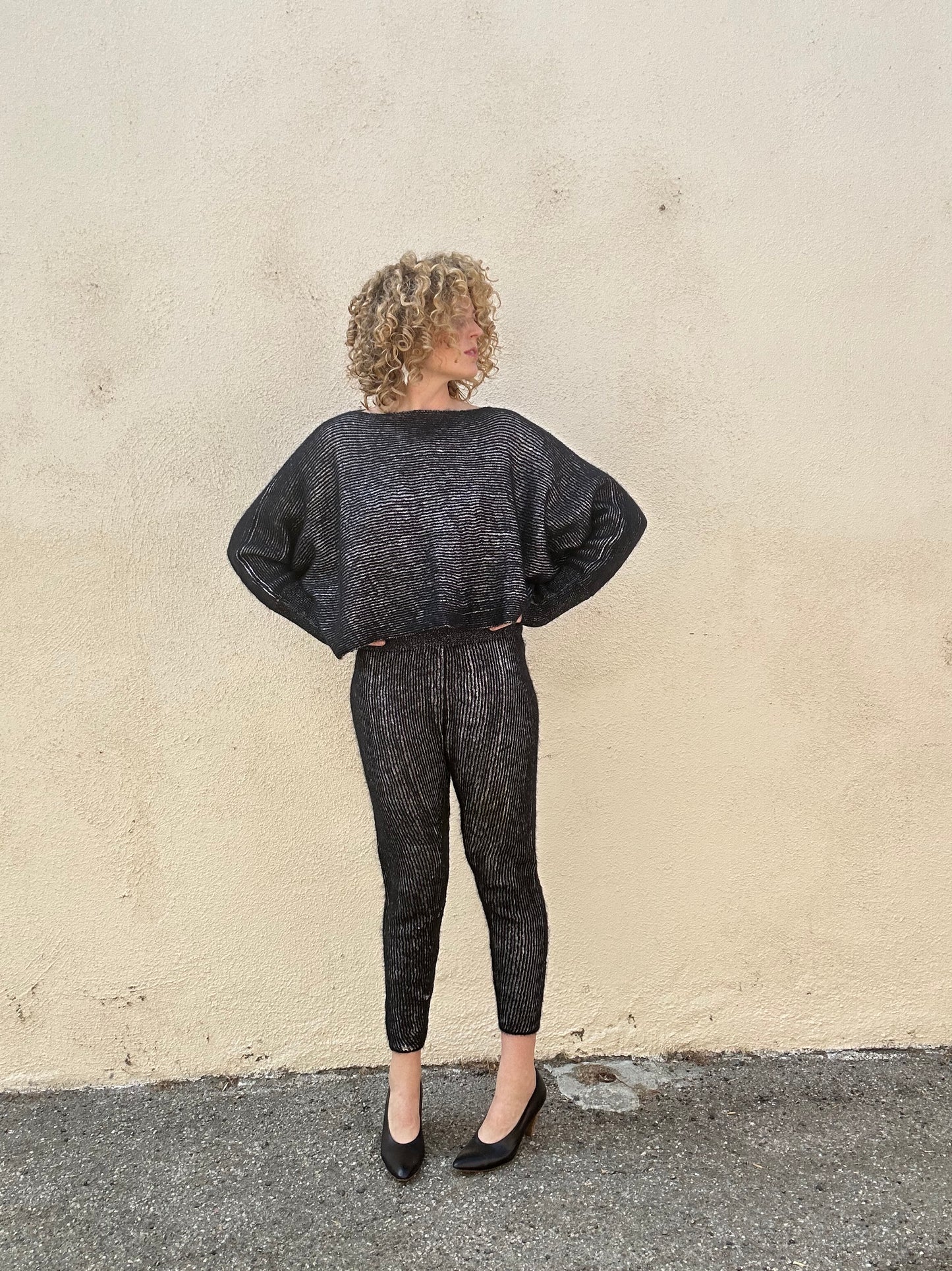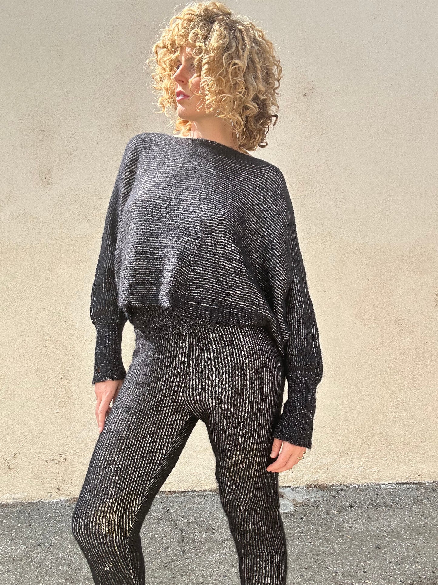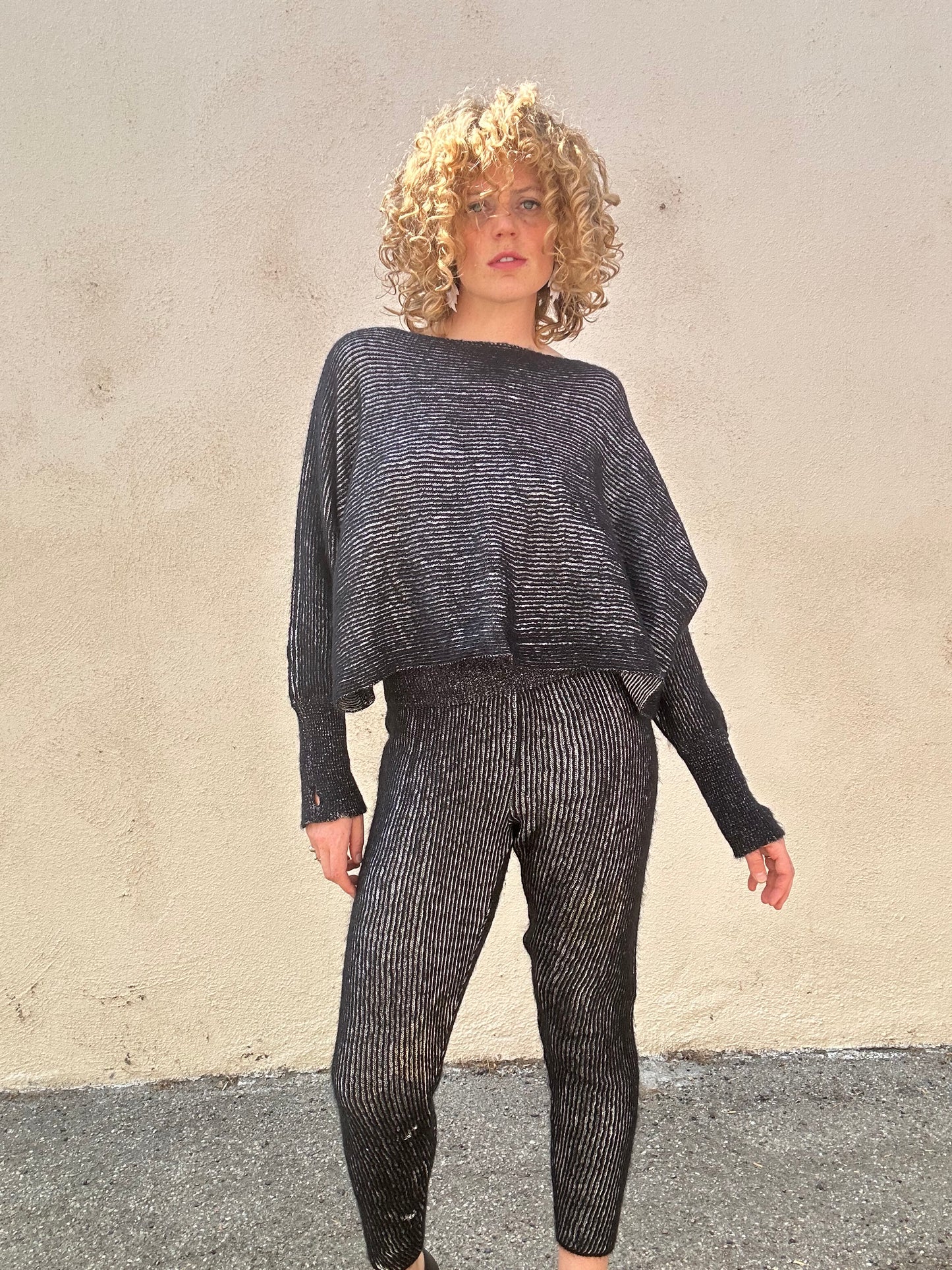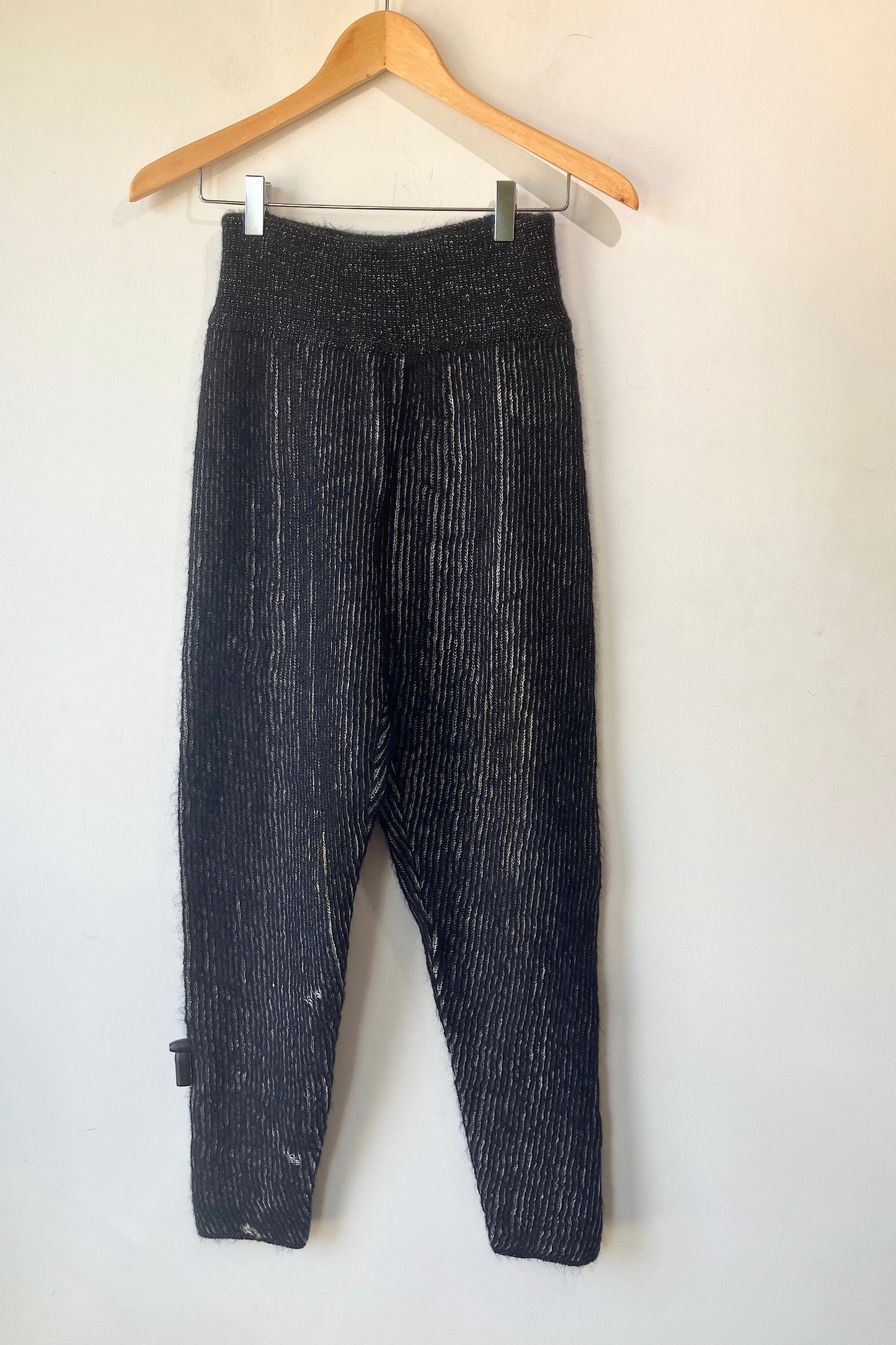 Vintage Issey Miyake Black White Knit Pants Set. Good vintage condition, has a few holes near wearers right pant cuff. Plaited rib soft knit set. Dolman sleeve pullover and easy pull on pants with tapered leg. 50% wool 50% rayon, dry clean only. Marked as size M. Made in Japan.