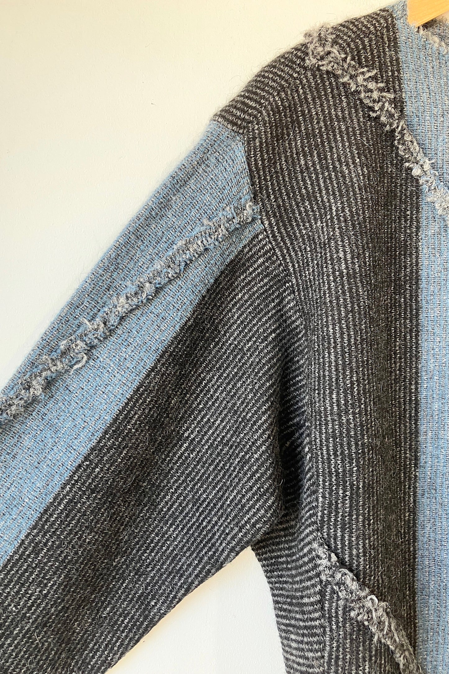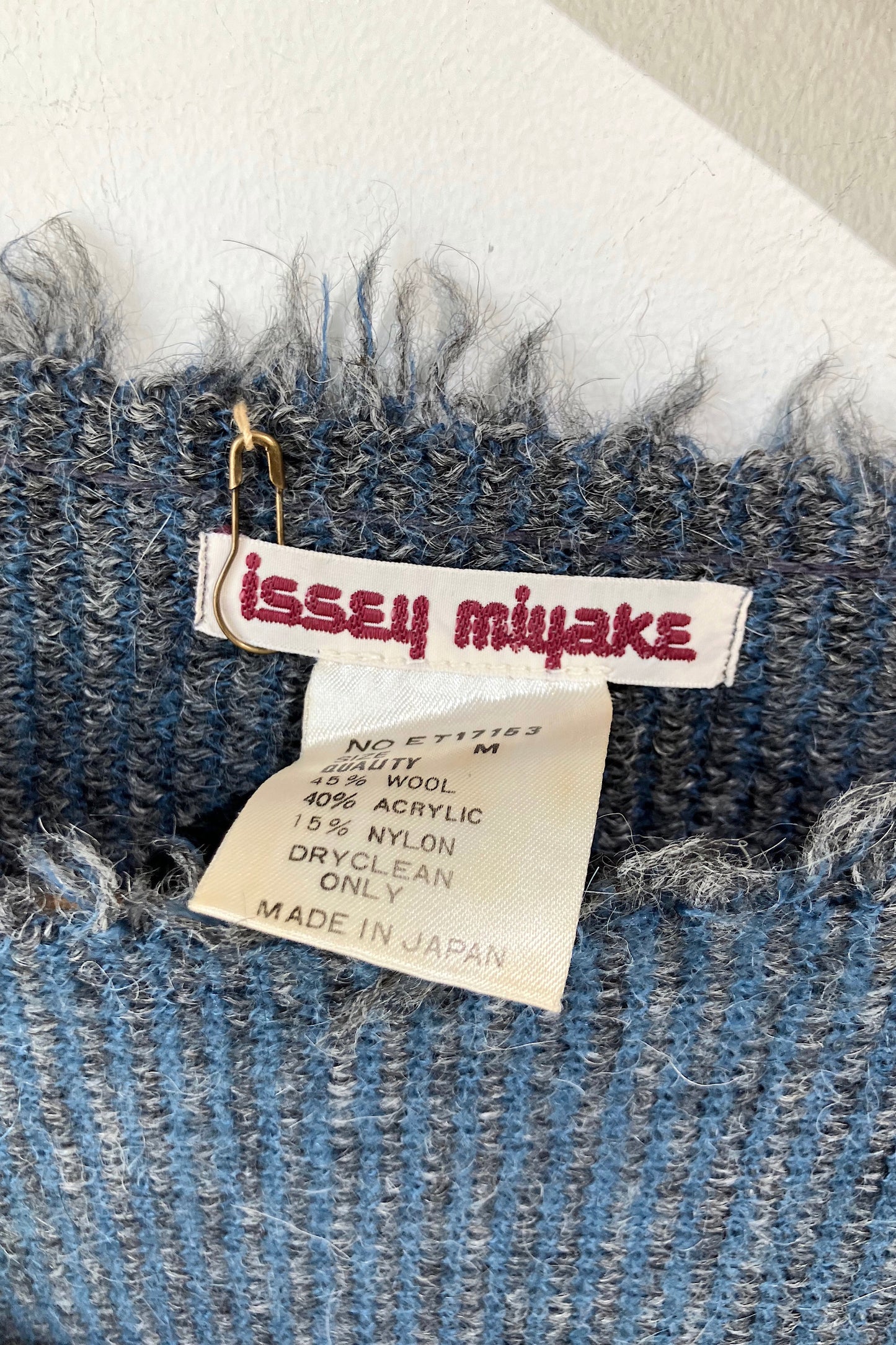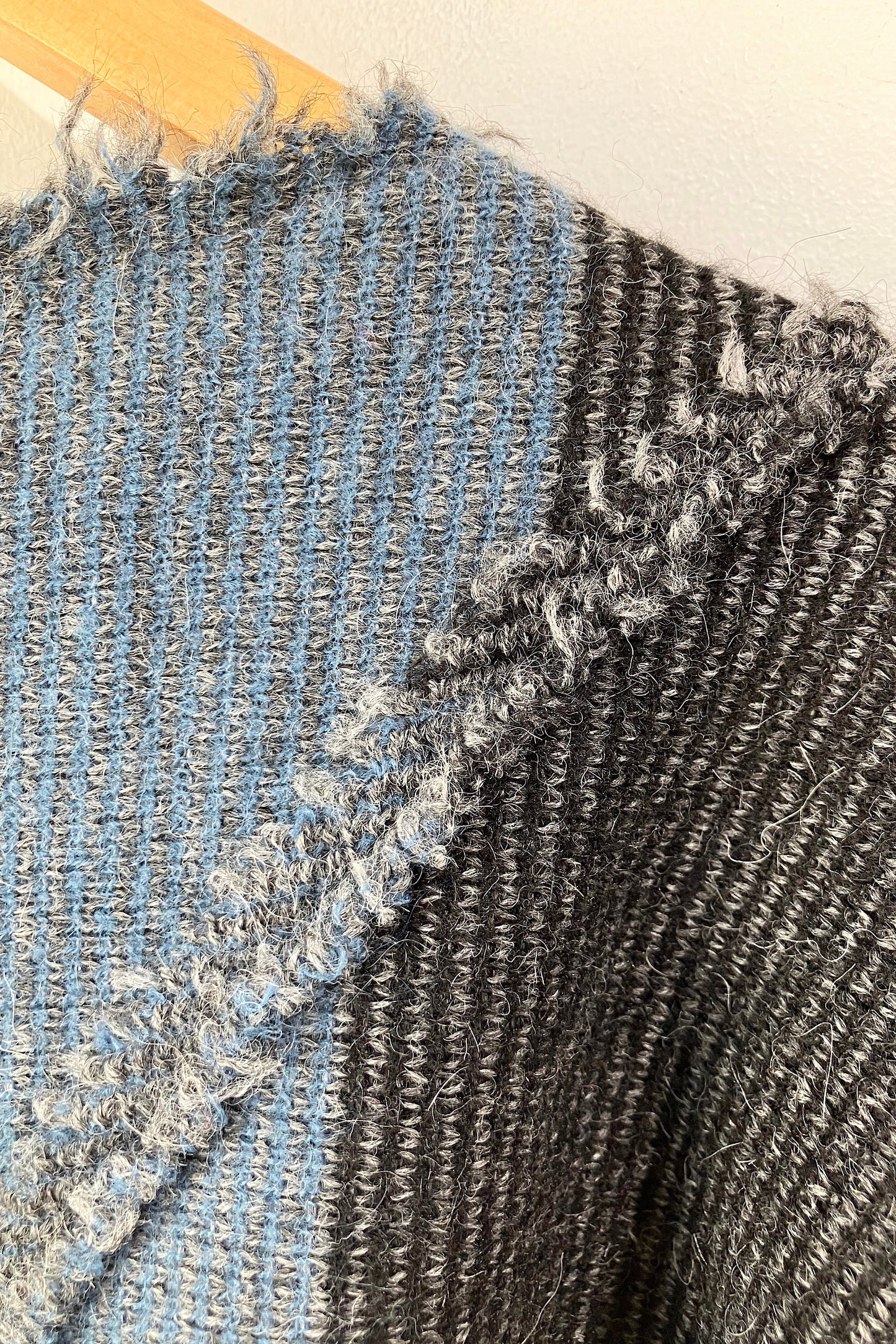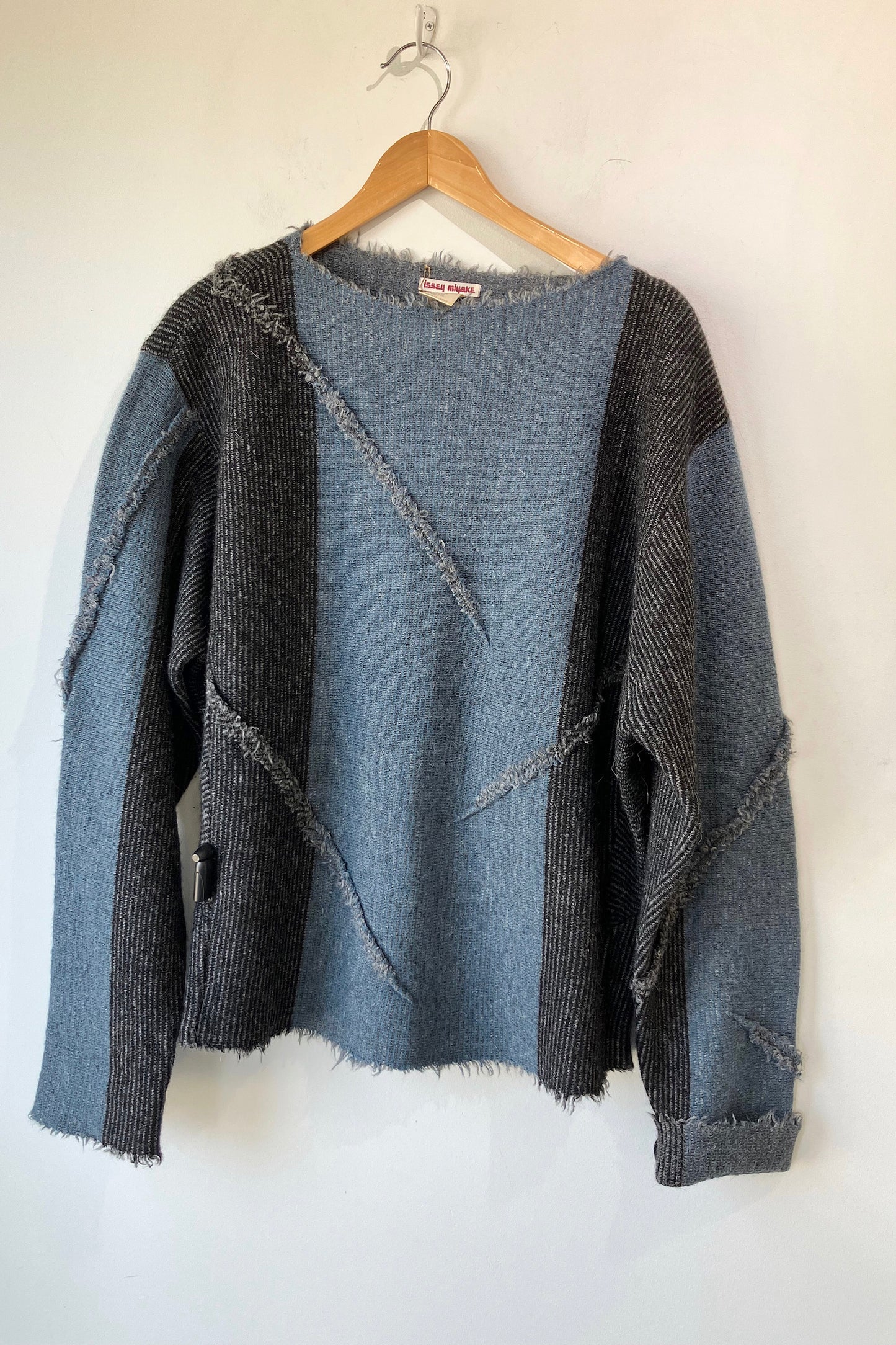 Vintage Issey Miyake Blue Batwing Sweater. 1970s blue and grey pieced pullover sweater. Bateau neckline and oversized fit. 45% wool 40% acrylic 15% nylon, dry clean only. Marked as size M. Made in japan.