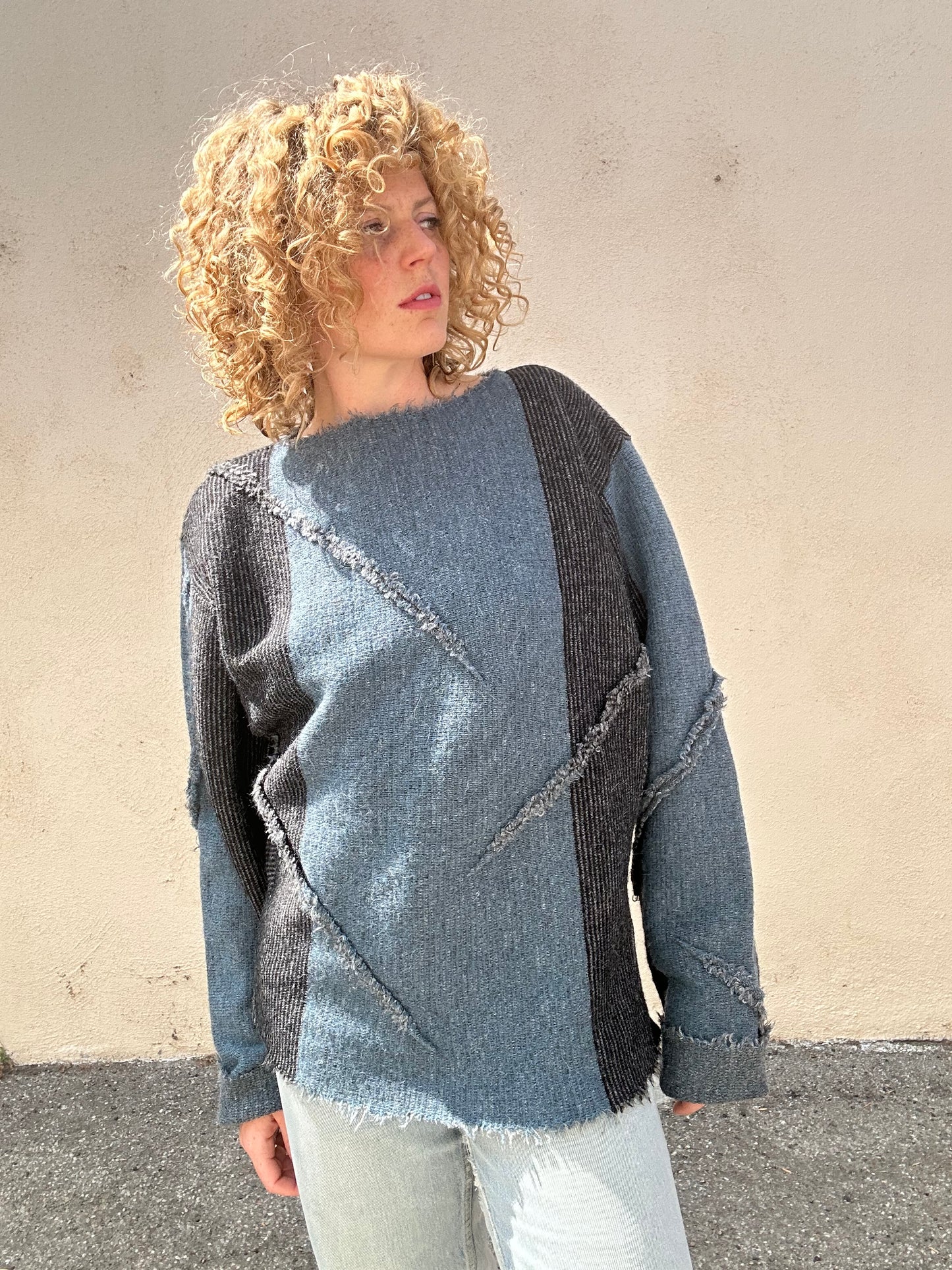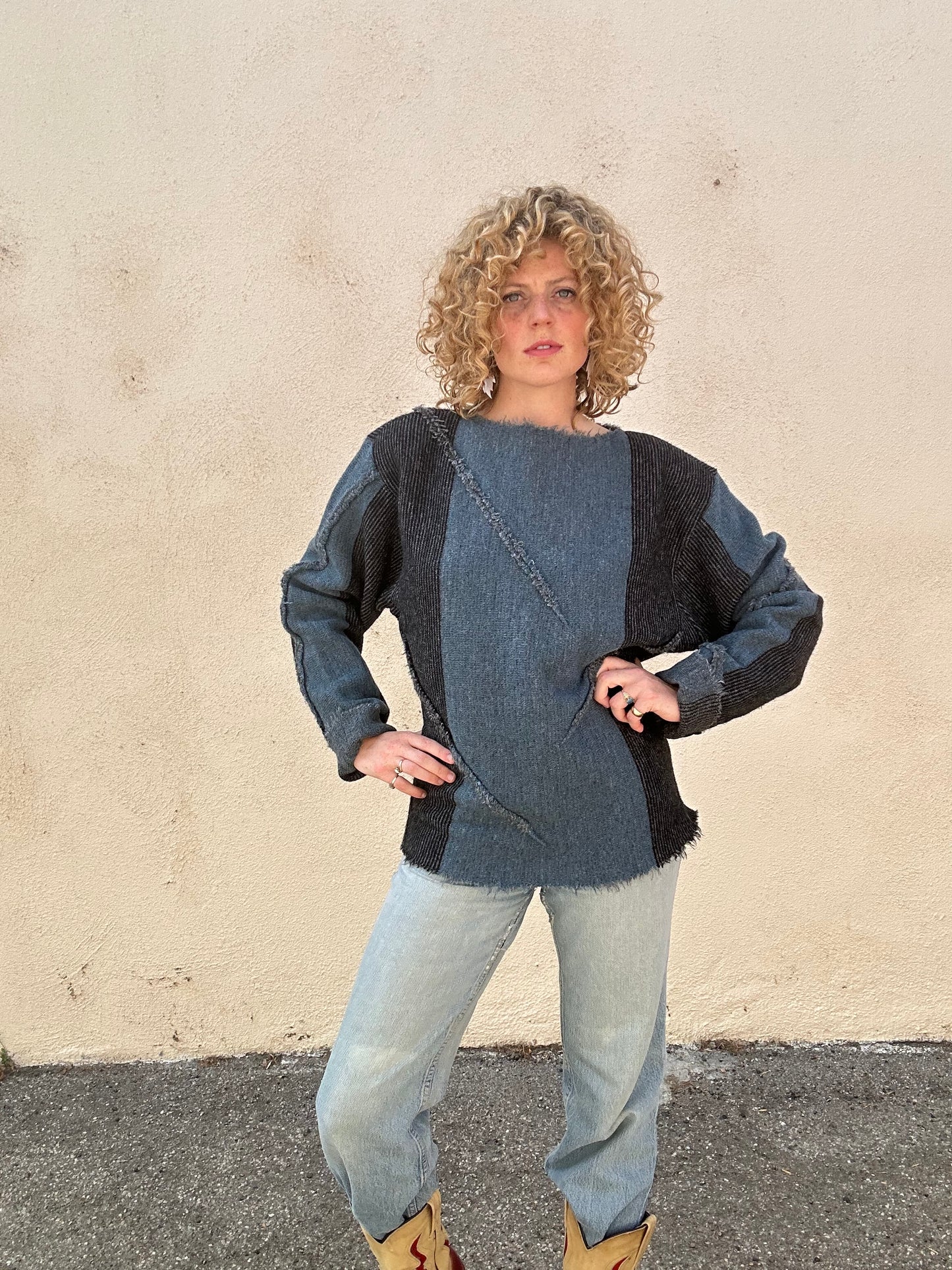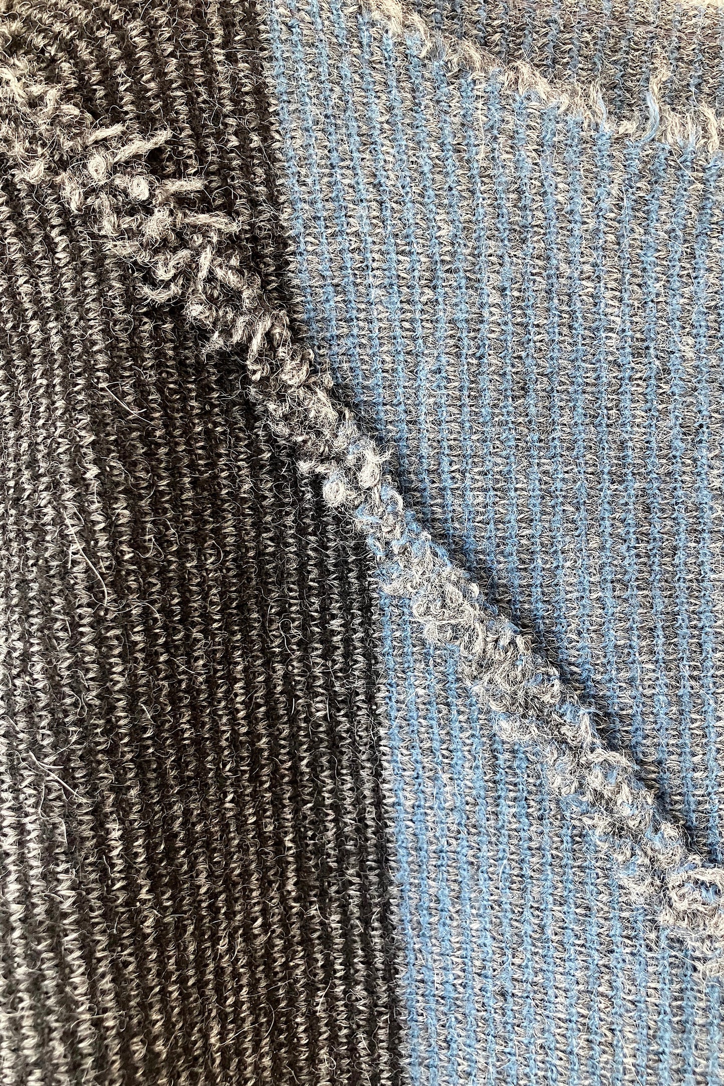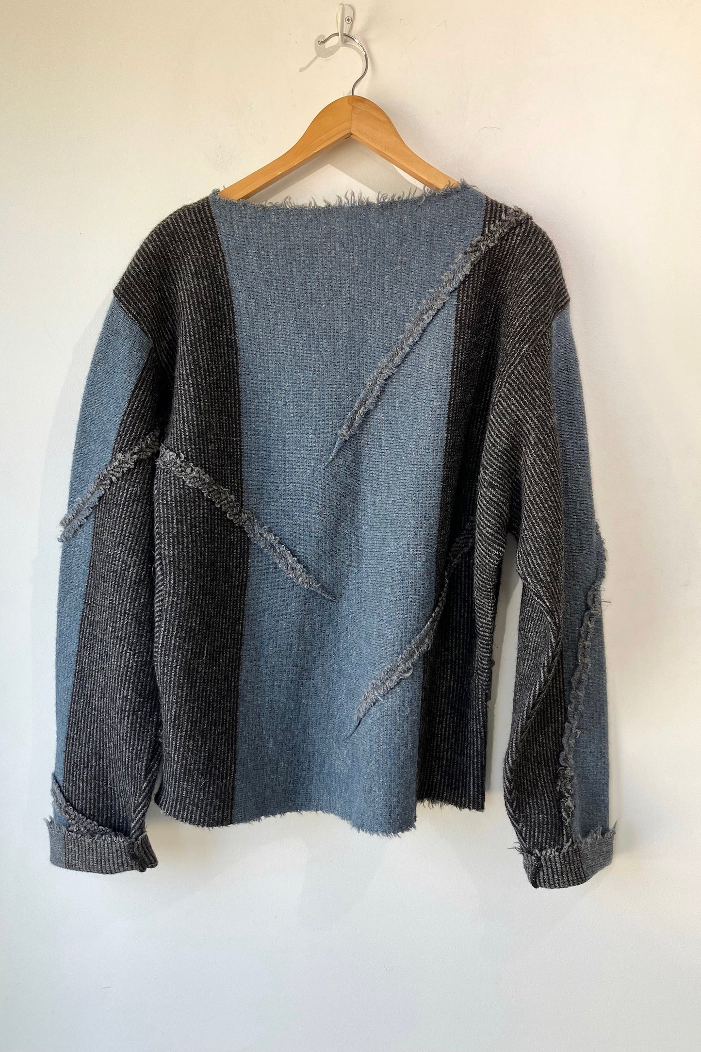 Vintage Issey Miyake Blue Batwing Sweater. 1970s blue and grey pieced pullover sweater. Bateau neckline and oversized fit. 45% wool 40% acrylic 15% nylon, dry clean only. Marked as size M. Made in japan.