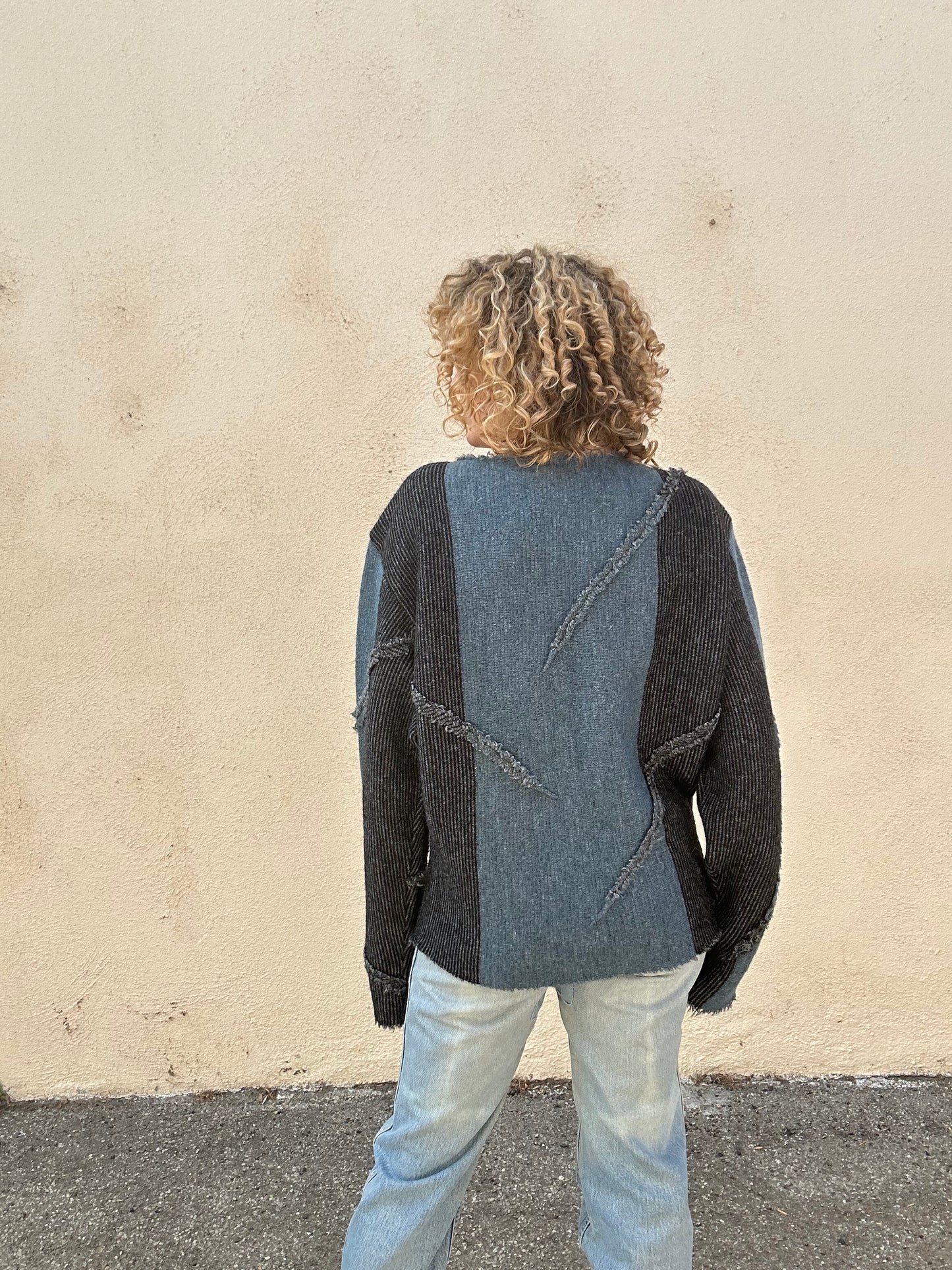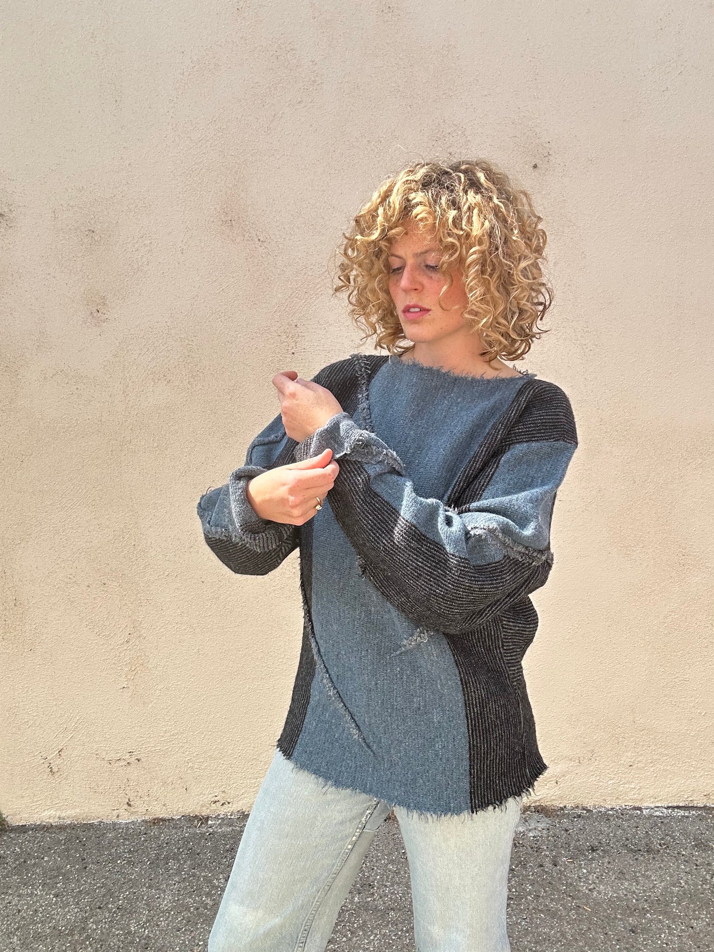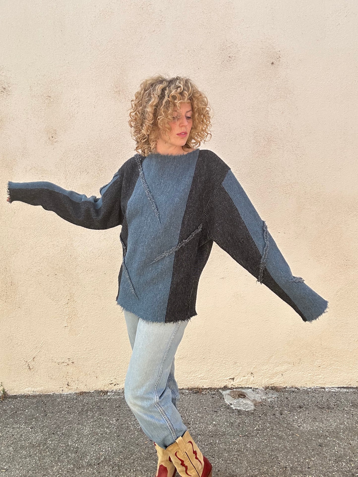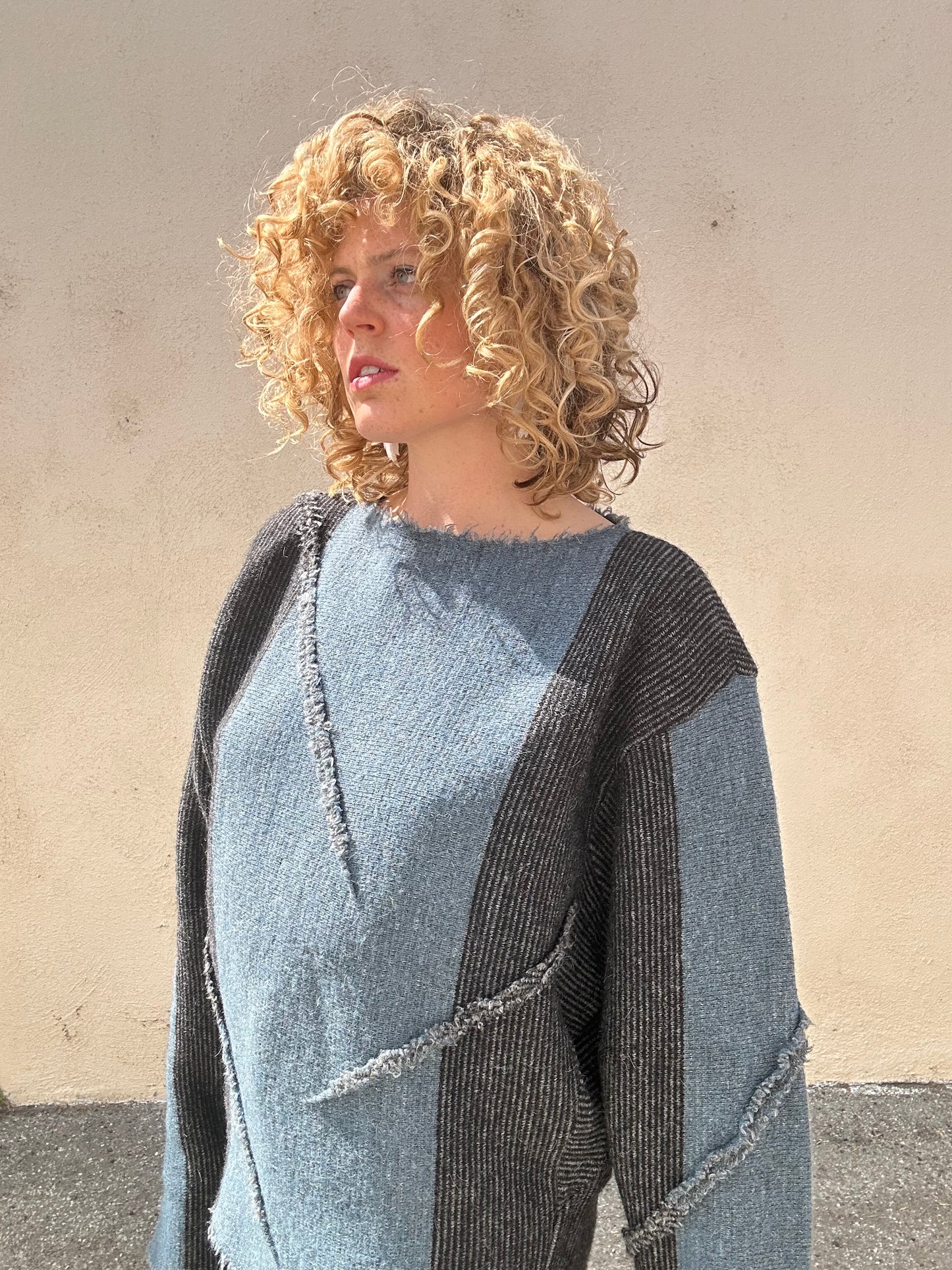 Vintage Issey Miyake Blue Batwing Sweater. 1970s blue and grey pieced pullover sweater. Bateau neckline and oversized fit. 45% wool 40% acrylic 15% nylon, dry clean only. Marked as size M. Made in japan.