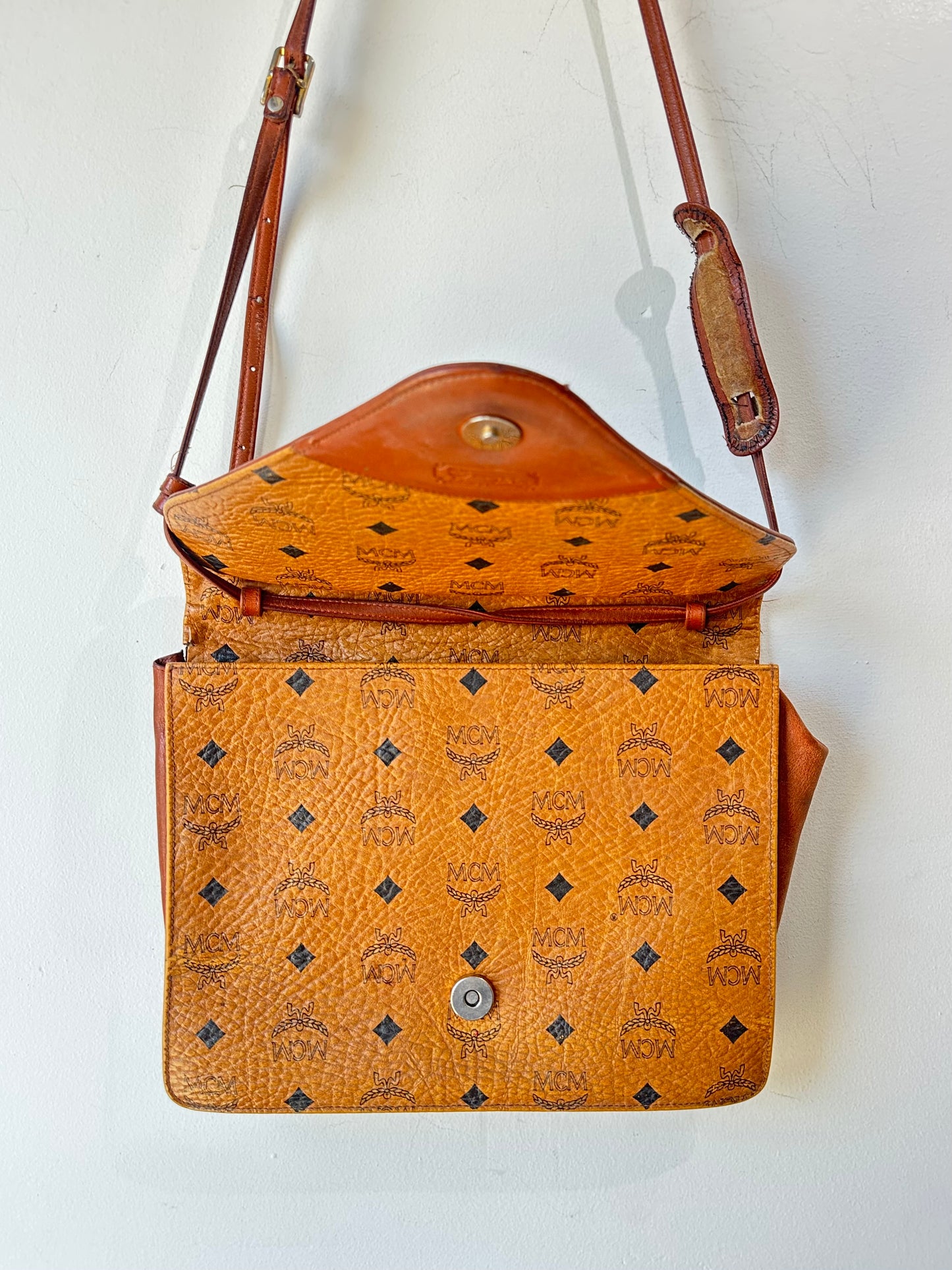 Vintage MCM Crossbody Purse in a camel leather with brown trim, a button snap closure, and adjustable length strap. With two interior pockets, one with a zipper and one without, this purse is both functional and classic. Great condition, some minor fraying at the seams on the strap, front trim, and interior lining.