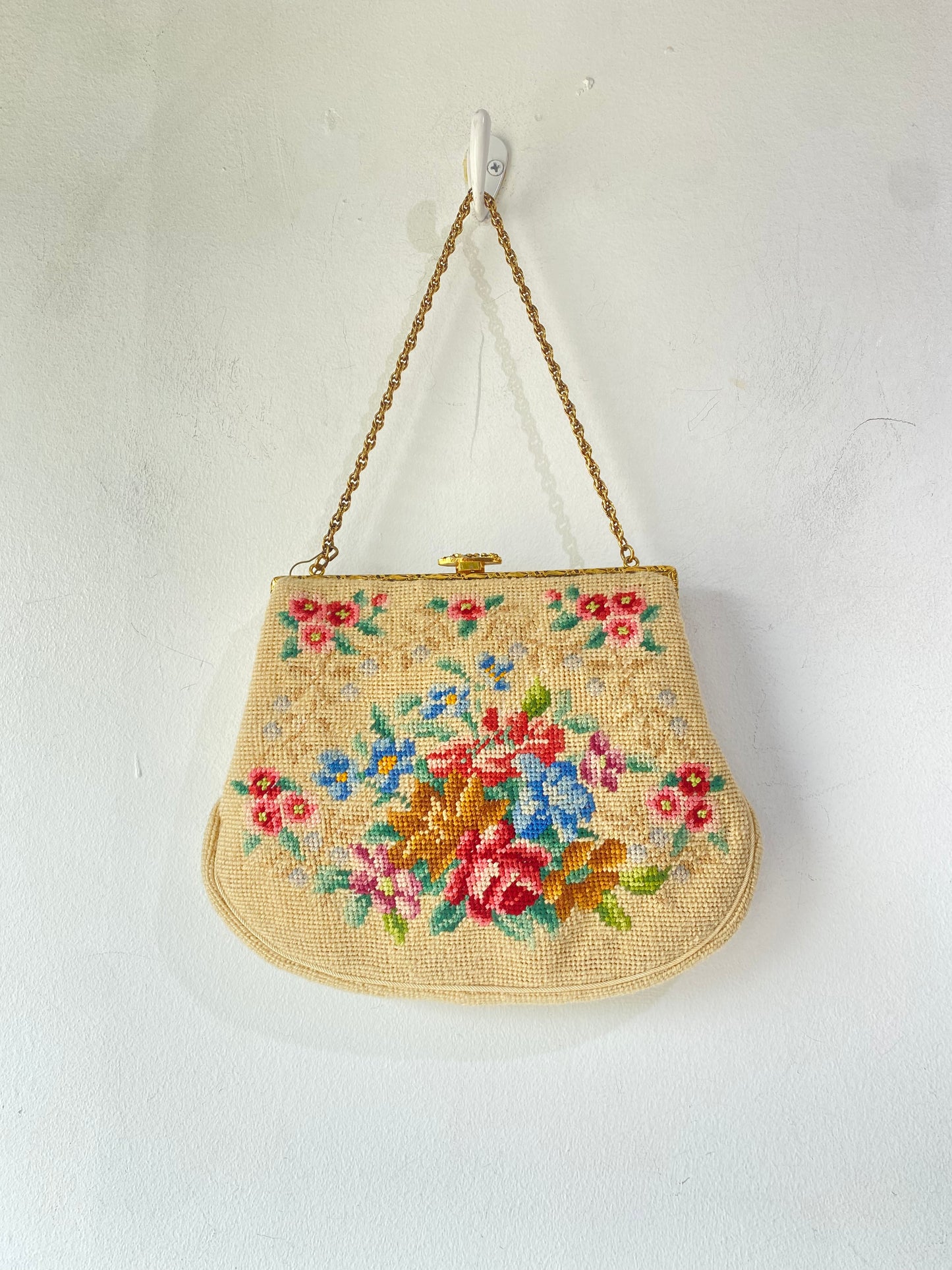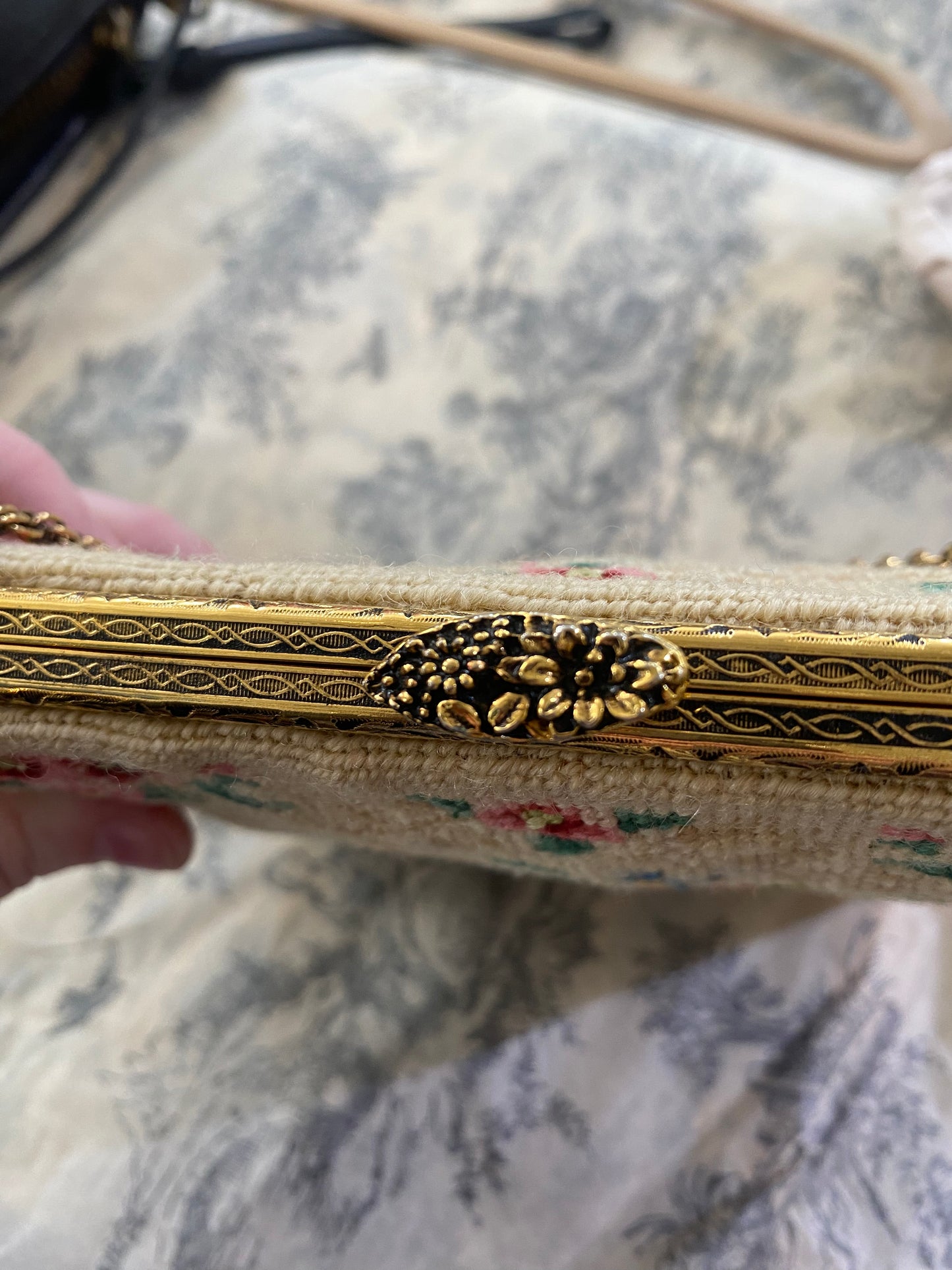 Martha Klein Vintage Needlepoint Pastel Purse! So precious! Your granny would be totally jealous. Features a beige base with pastel floral needlepoint work on the front and back, gold-toned metal clasp closure on the top, and a matching chain. Fully lined. In excellent condition.