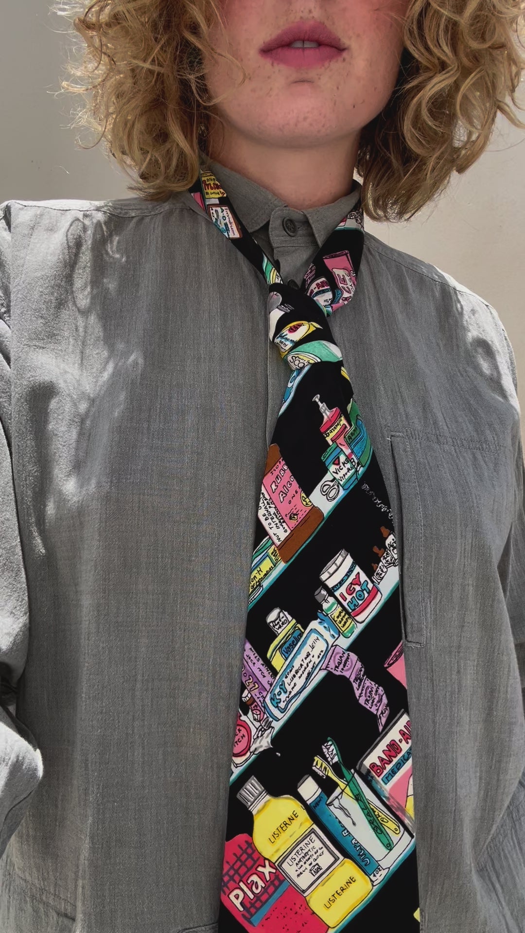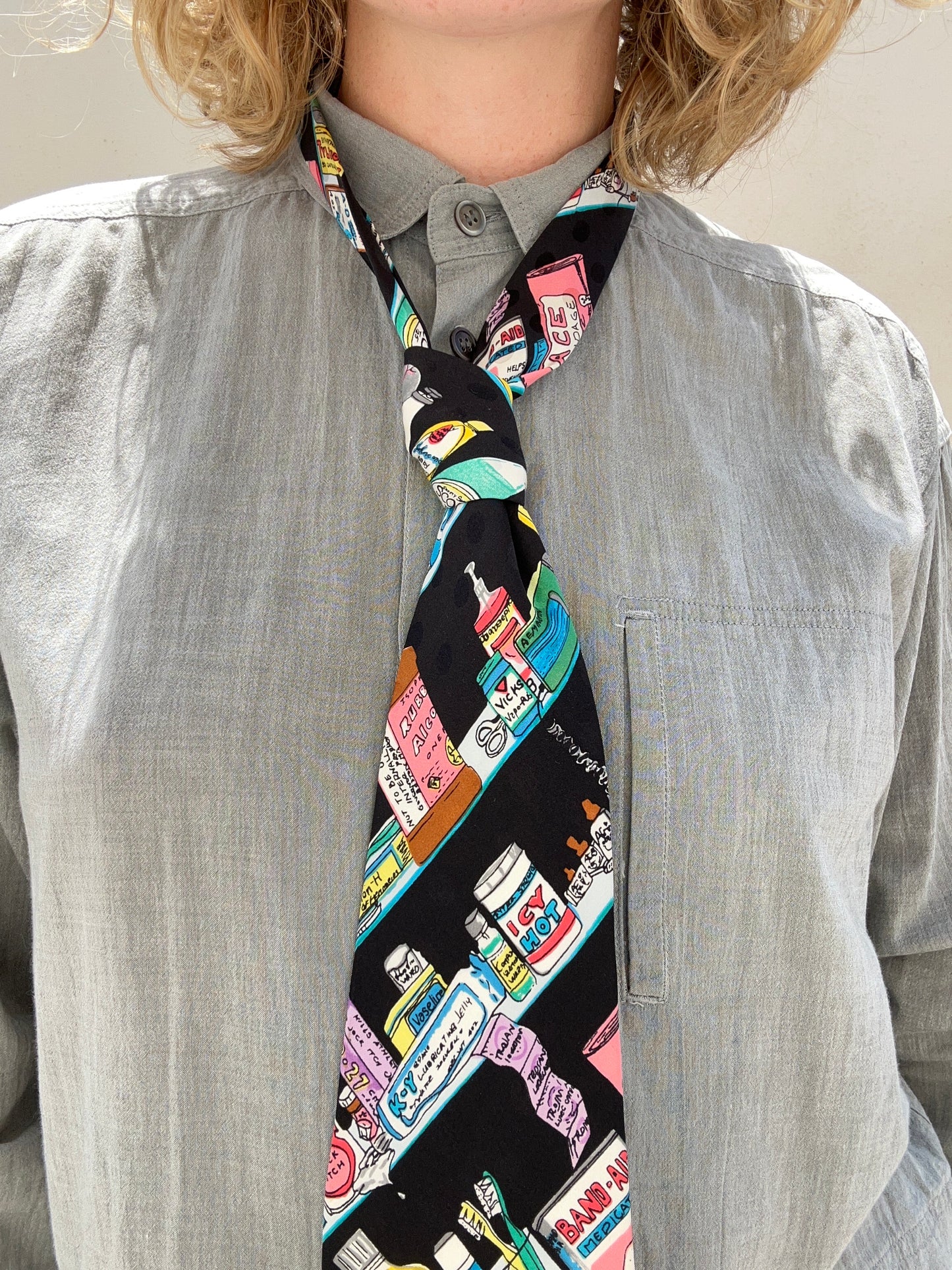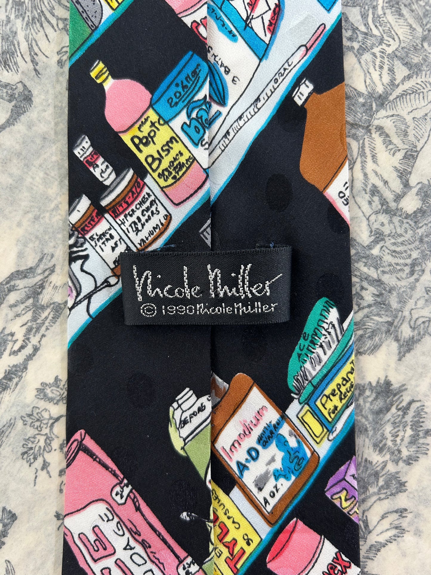 Vintage Nichole Miller Silk Medicine Cabinet Pattern Tie. A fun and kitschy tie featuring a colorful illustrated pattern of the contents of a medicine cabinet. Featuring all of the heavy hitters: Icy Hot, Band-Aids, Vaseline, and more! Perfect for the medical professional in your life! 100% silk. In excellent vintage condition.