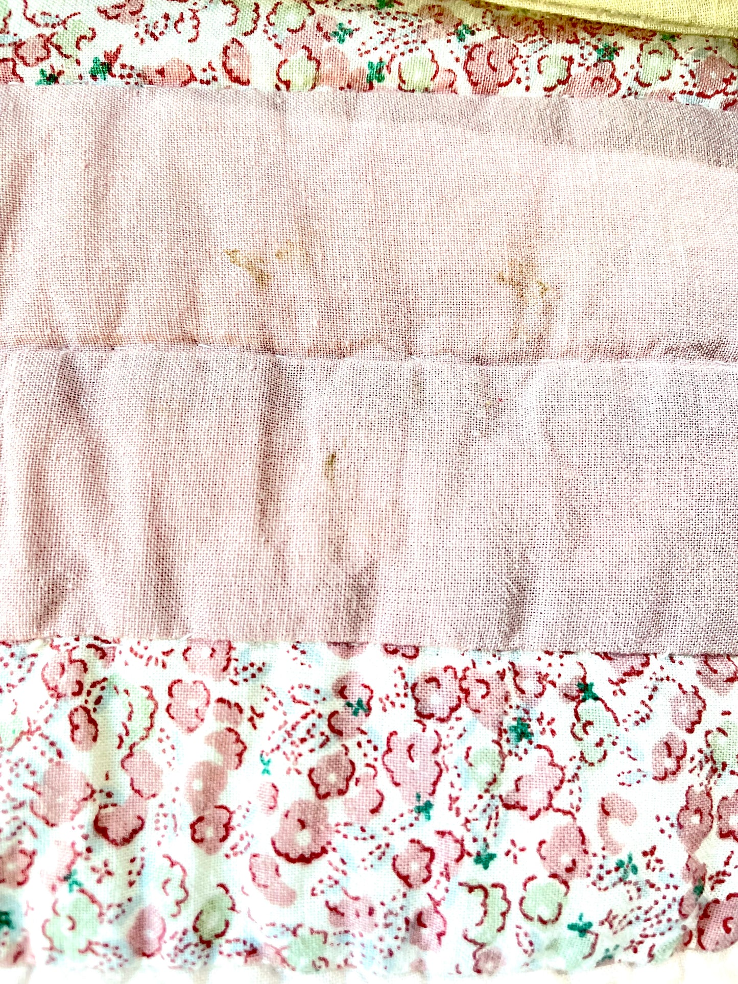 Vintage Pink and Blue Quilted Jacket, One Size. Pastel patchwork dream in shades of pink, blue, and tiny florals. Soft, lightweight quilt construction with a relaxed fit and open front. No label present. Sold as is. Imperfections noted: light staining and a small seam rip on side seam, easy repair and priced accordingly.