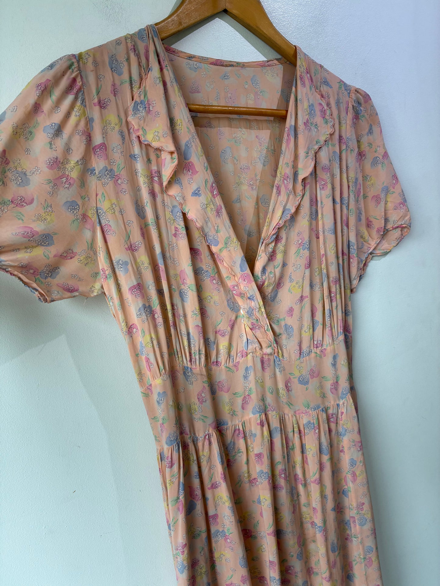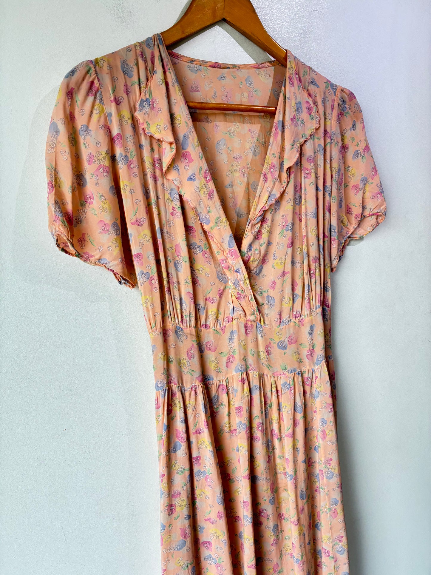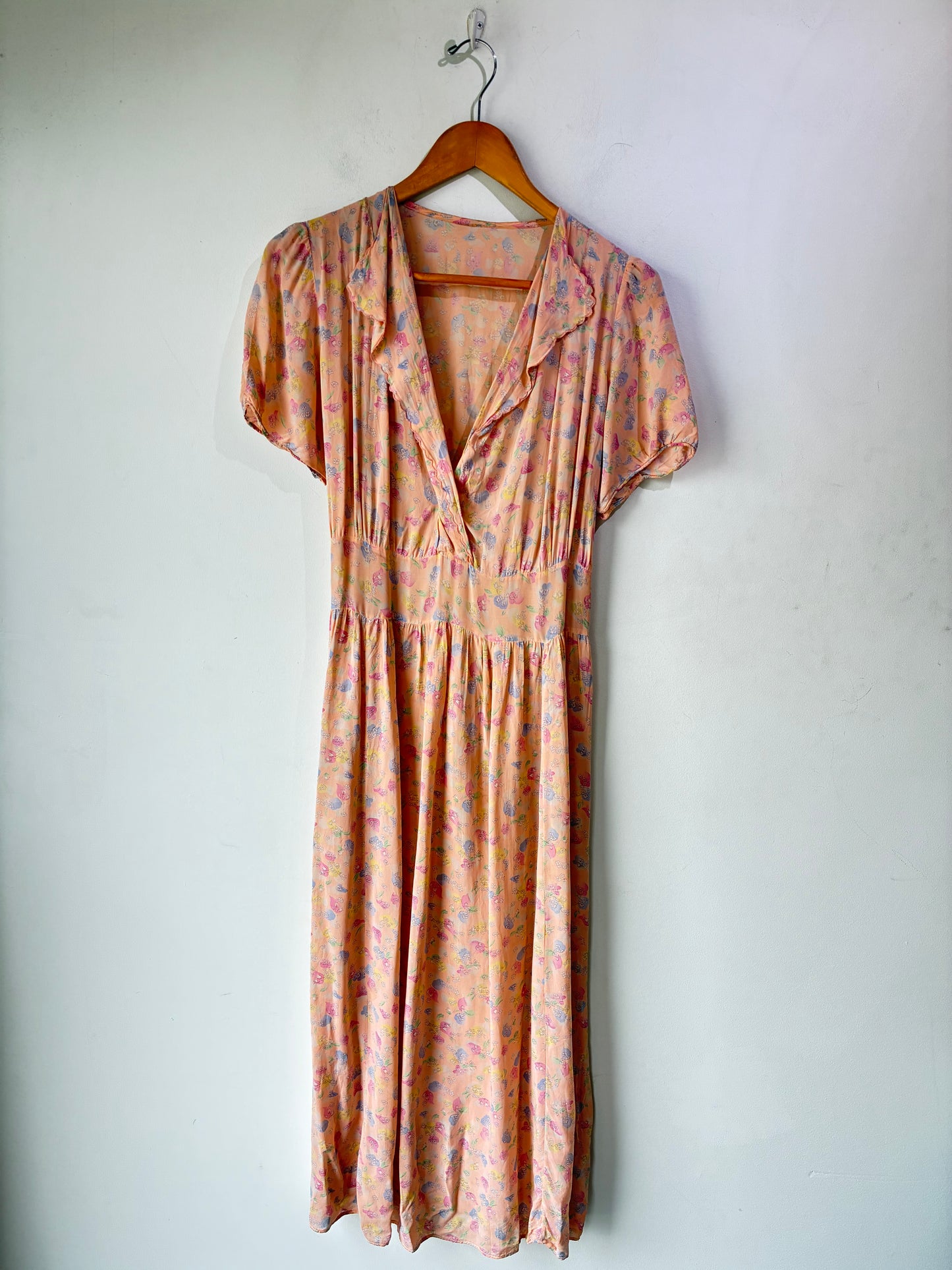 Vintage Pink Silk Flutter Sleeve Maxi Dress. Just the prettiest little thing, this airy and lightweight silk dress features a delicate floral pattern, a scalloped collar and neckline and short, fluttery sleeves. She is a real stunner! In excellent vintage condition, dress shows only minor signs of age. Sold as-is, there are a few faint scattered spots and dart seams have been added and/or repaired.
