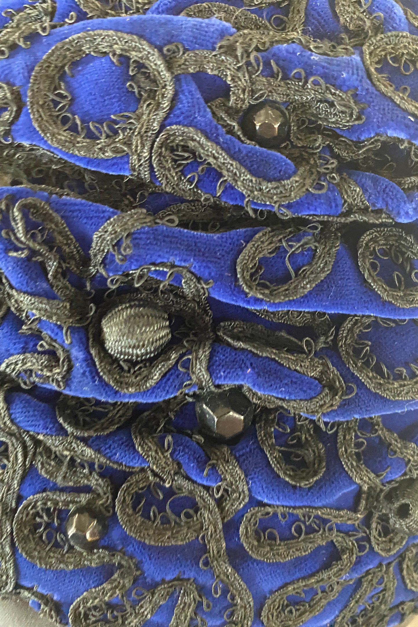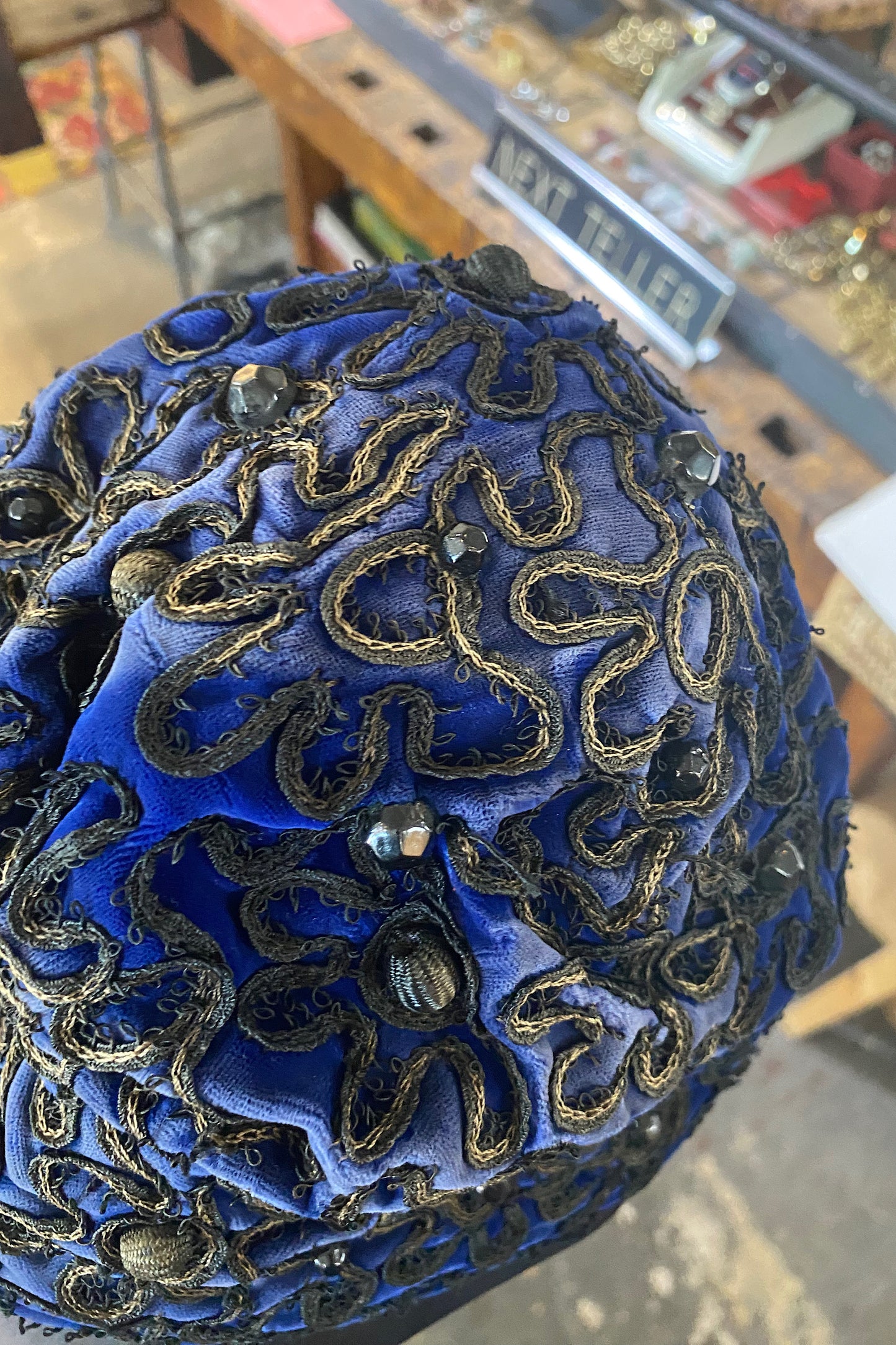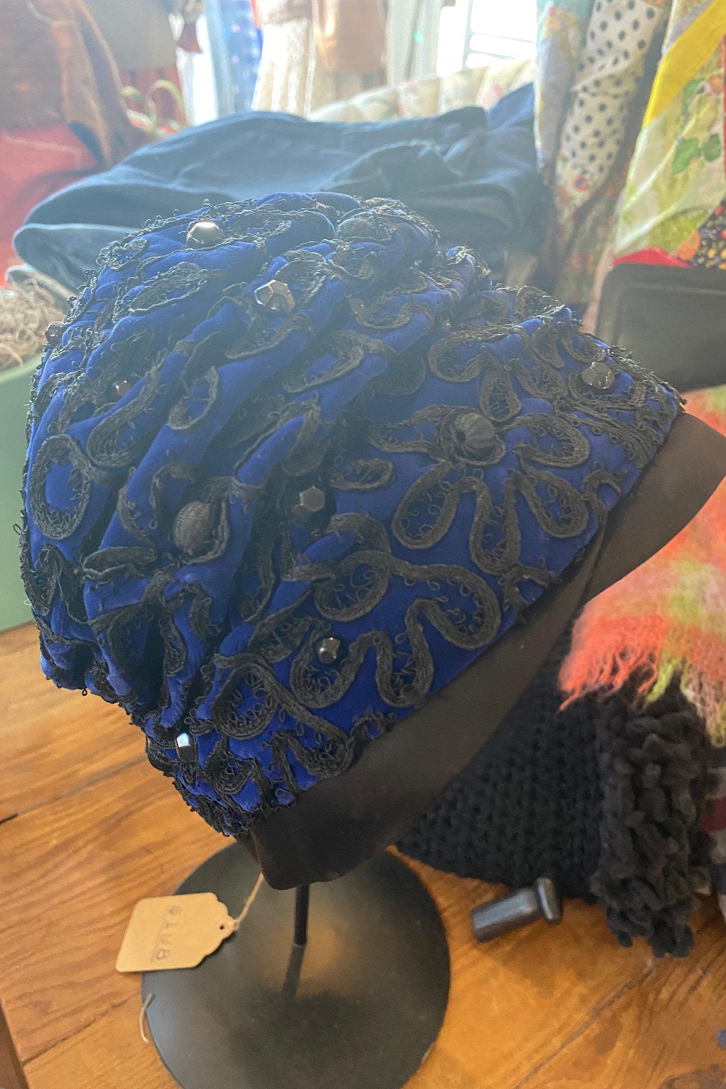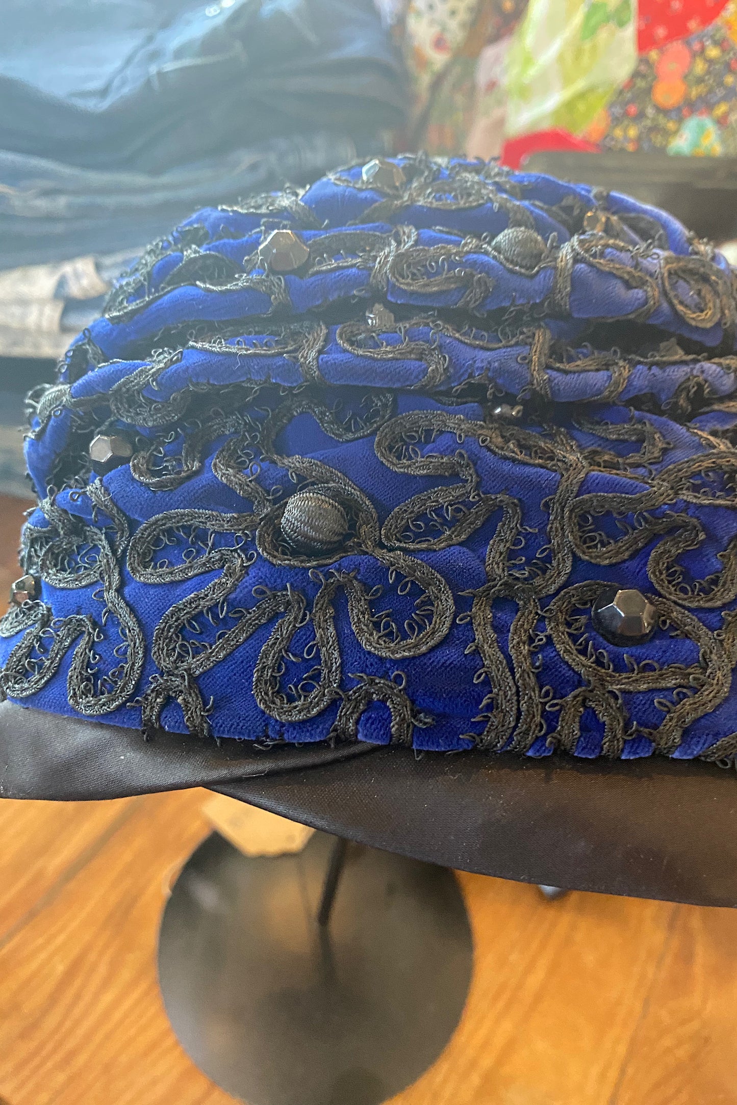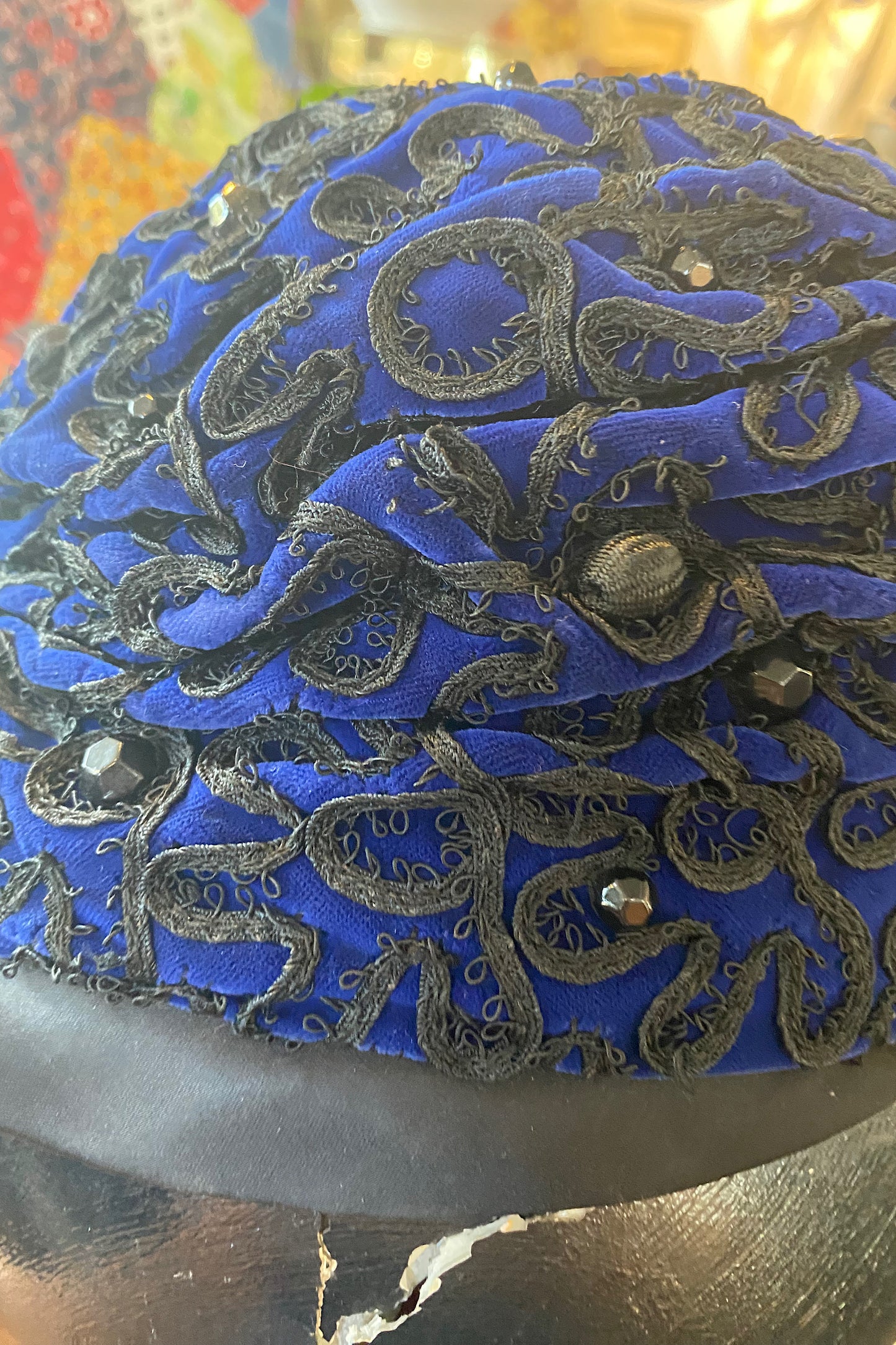 Vintage Schiaparelli Blue Black Appliqué Hat. Has some discoloration and fading. Soutache trimmed and beaded velvet hat with black satin band. Spot clean only. Made in Paris.