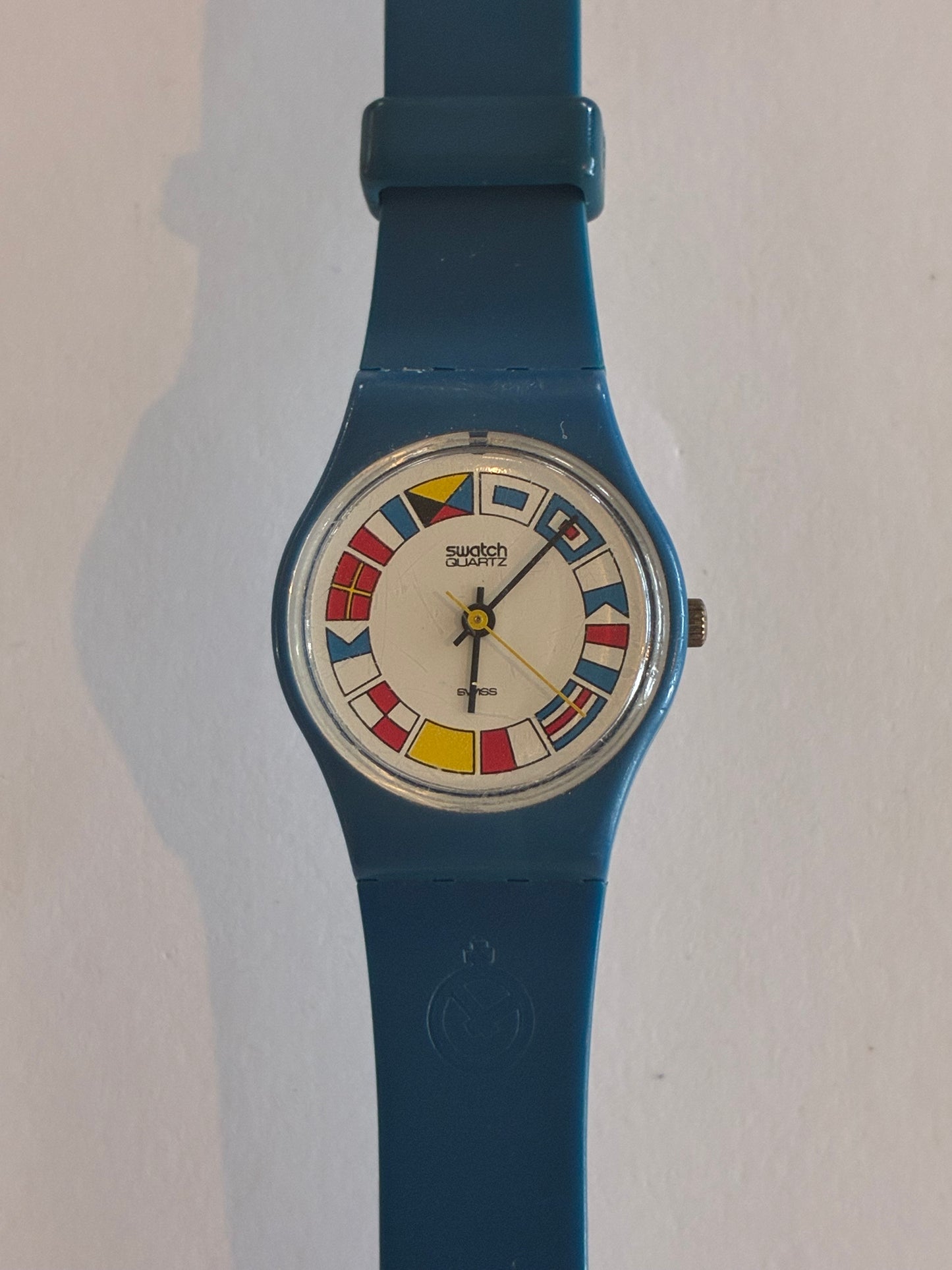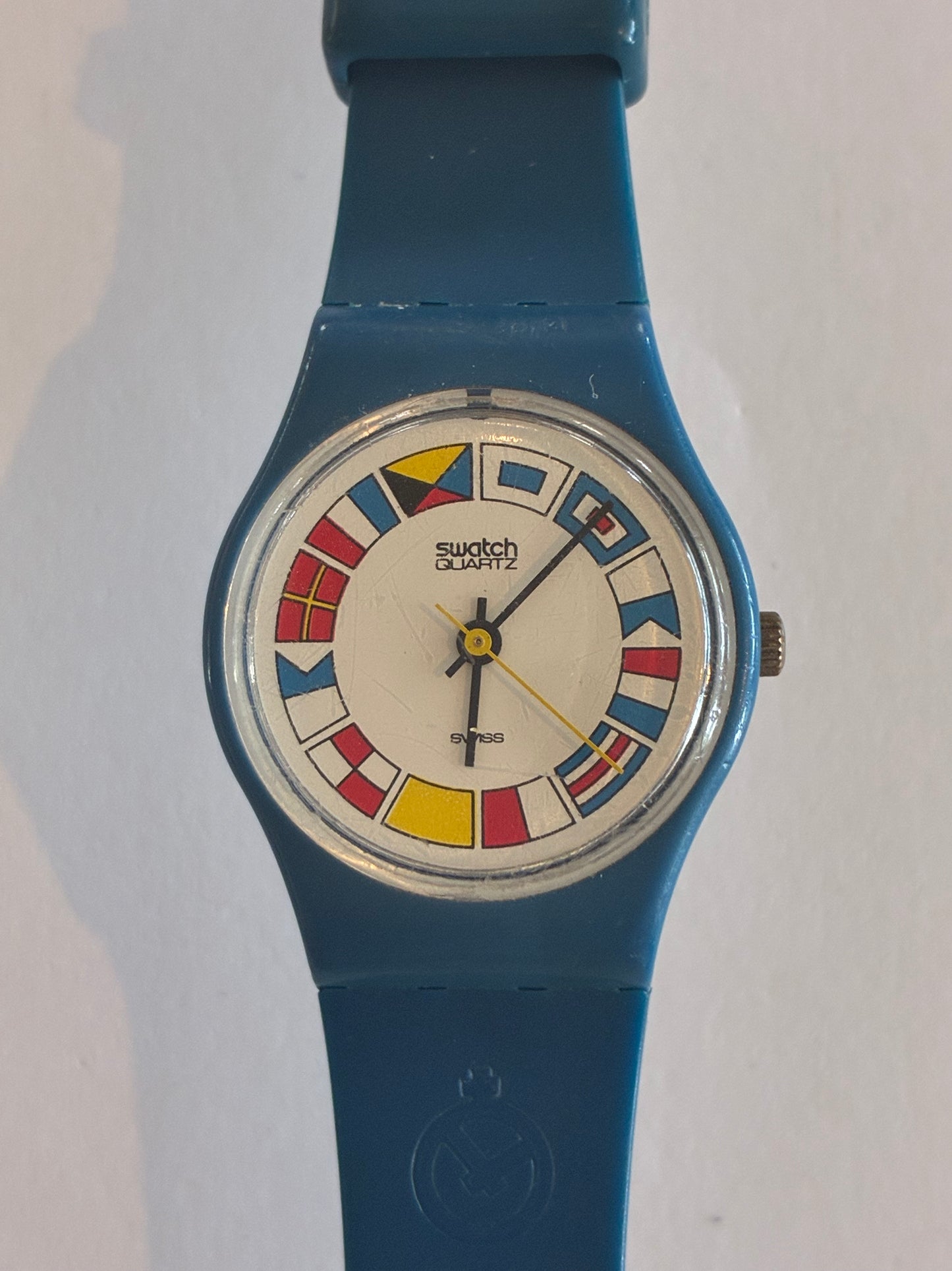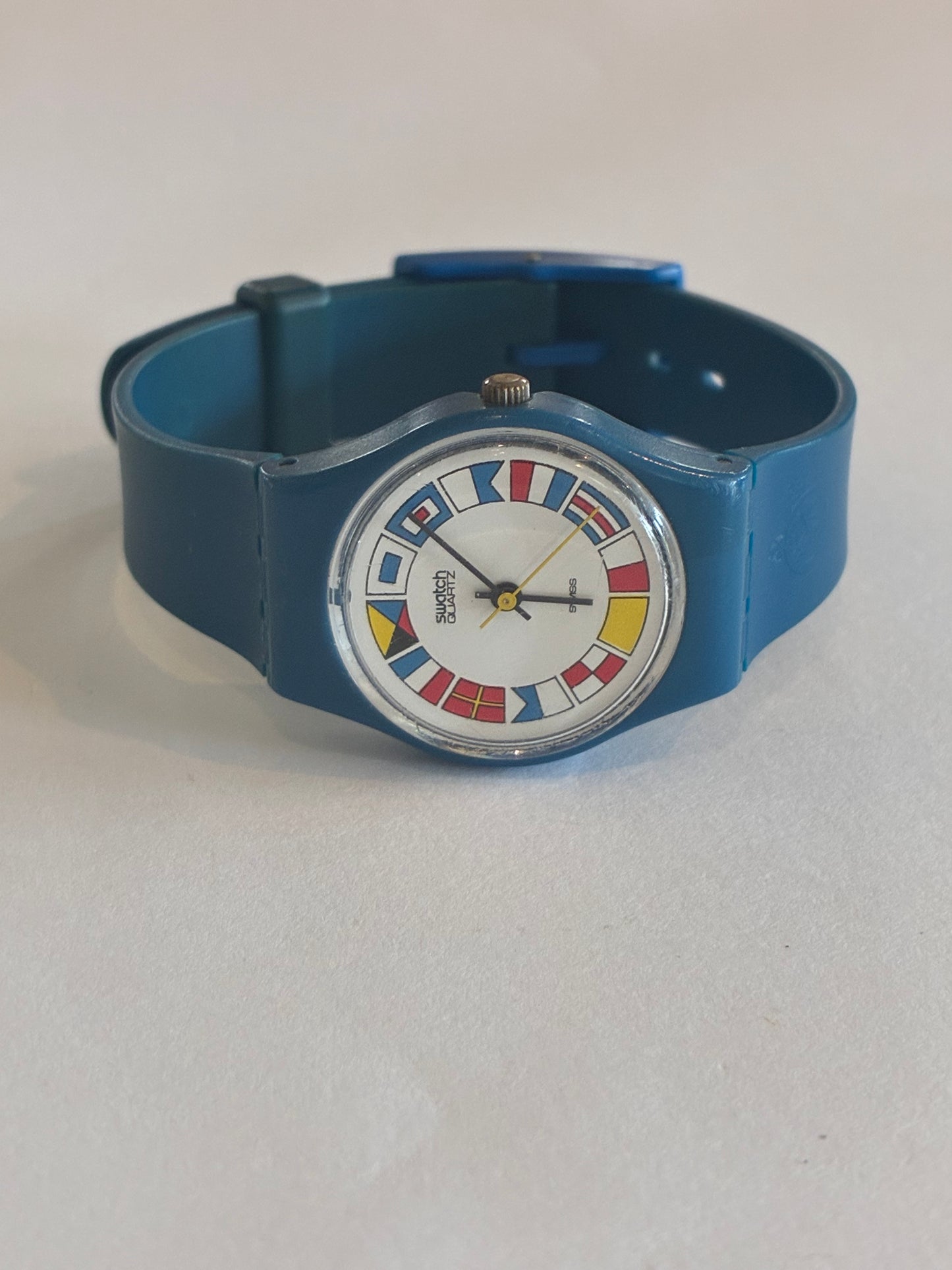 Vintage Swatch 1980s 12 Flags Watch. Return to a simpler time with great fashion with this rad Swatch Watch! The white face features twelve different flags for numbers and the blue plastic band gives it that super 80s flare and feel! An awesome addition to any outfit! Watch is in very good vintage condition, plastic band is free of cracks and face shows minor signs of scuffing.