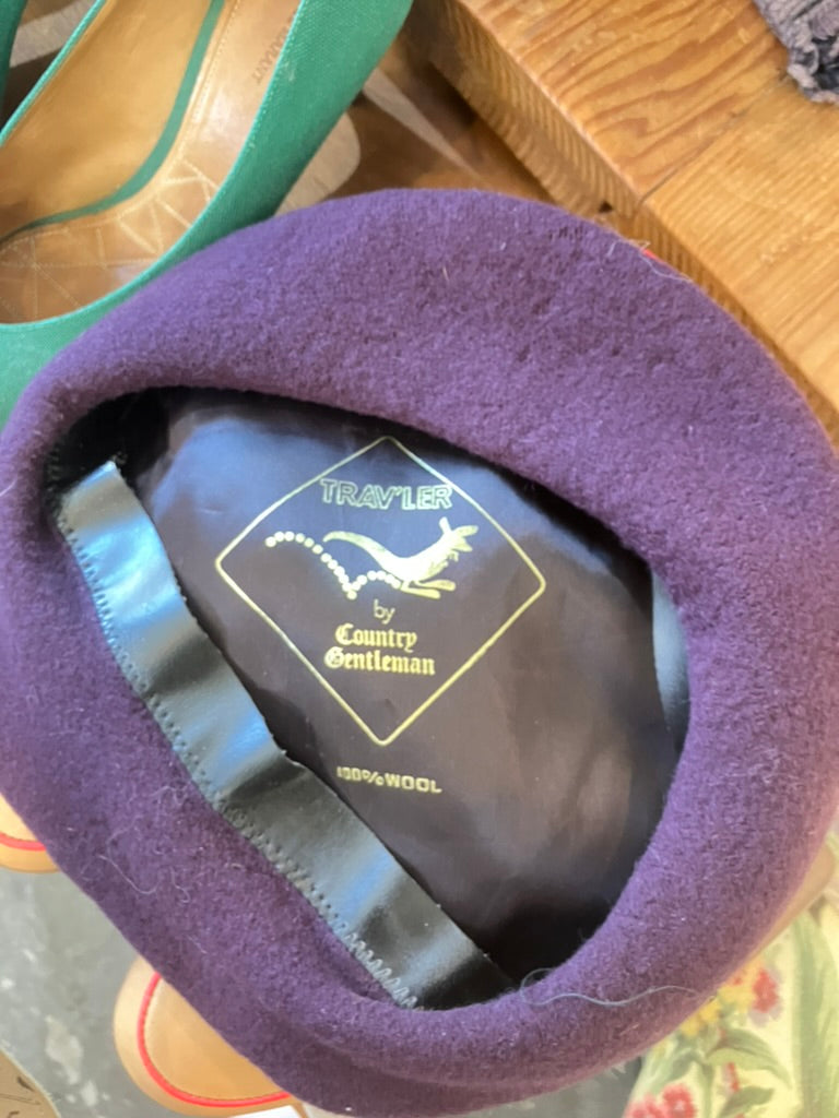 Vintage Trav’ler Eggplant Beret. A classic rimmed hat in a fun shape with a crease on the head and bow detail. 100% wool. As is, displaying some wear.