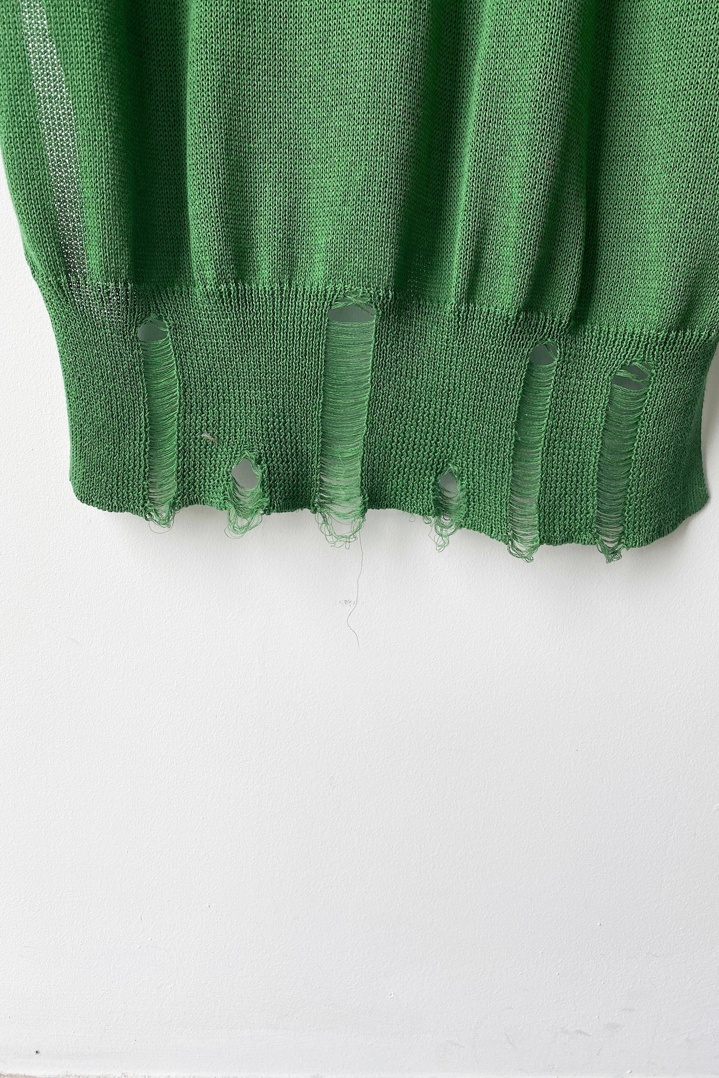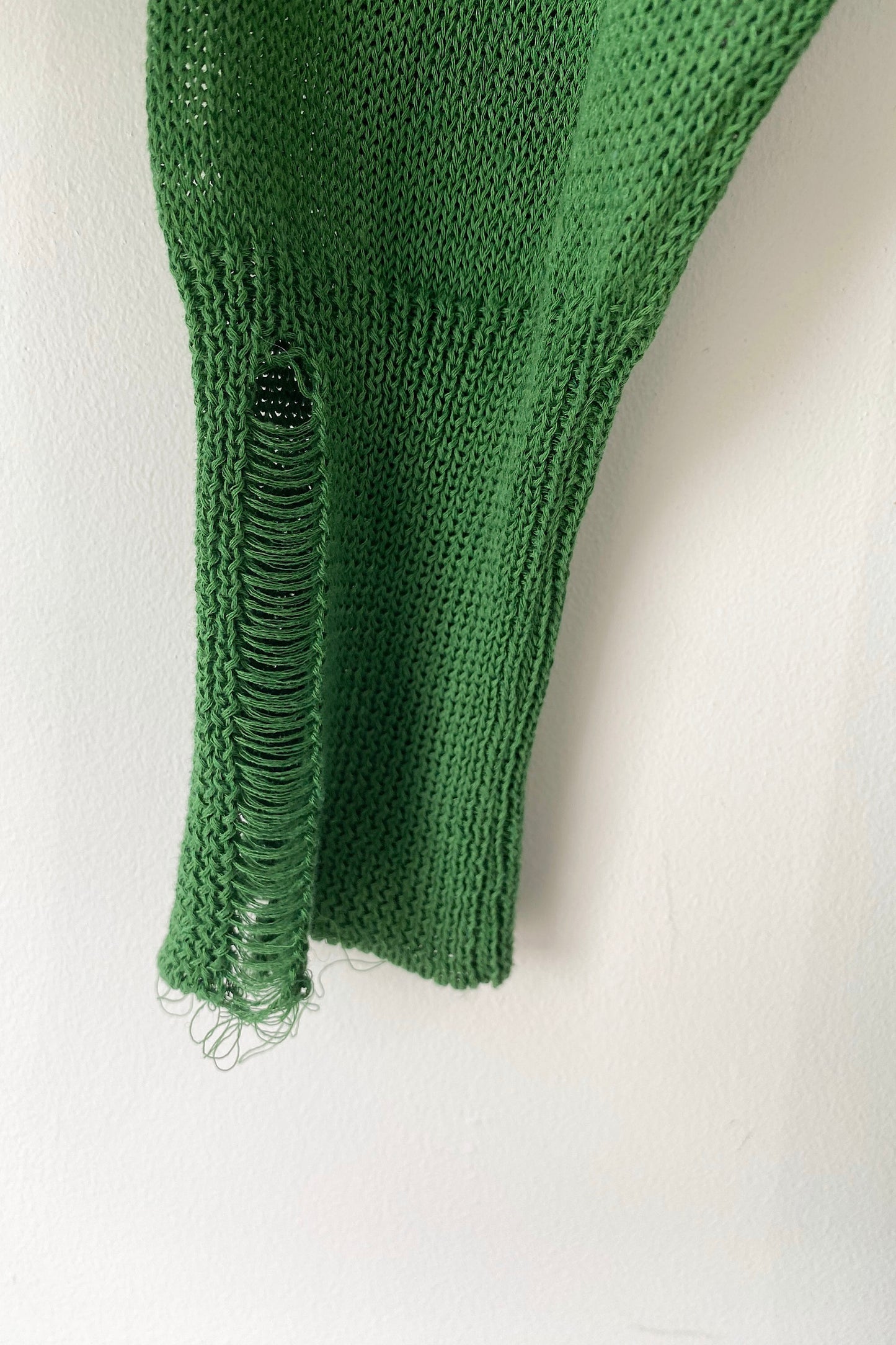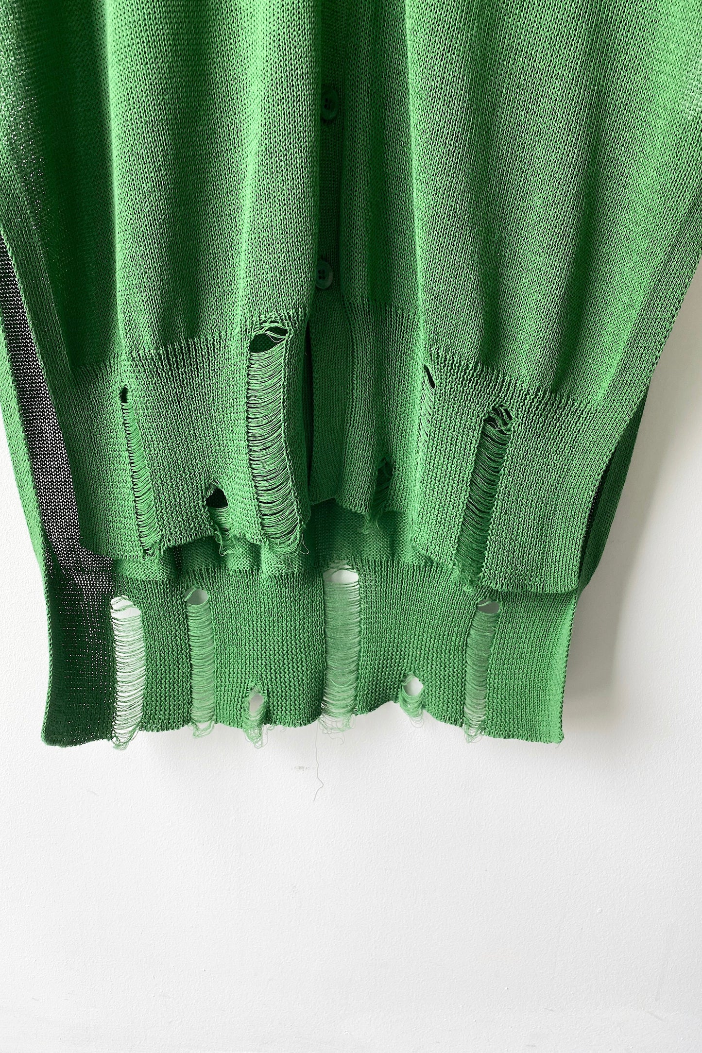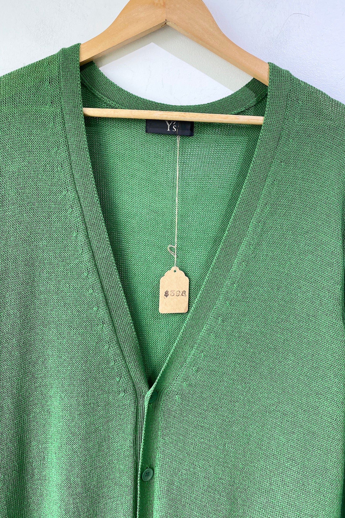 Y's Yohji Yamamoto Green Long Cardigan. Fantastic condition. Extra long cardigan with button closure and distress detail at cuffs and hem. 52% cotton 25% polyester 23% linen, dry clean only. Marked as size 2, fits M/L best. Made in Japan.