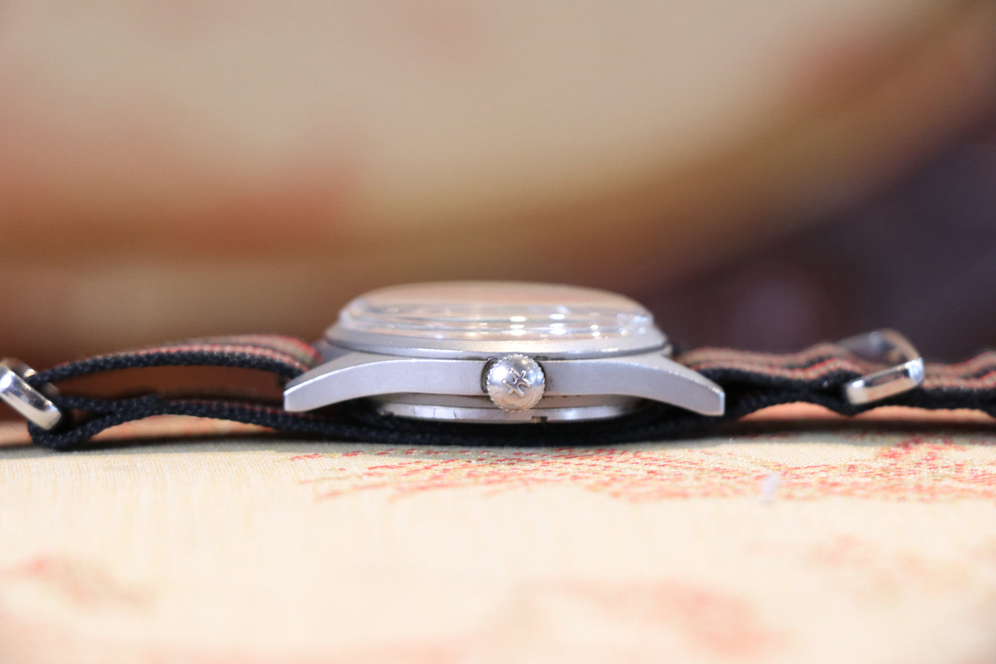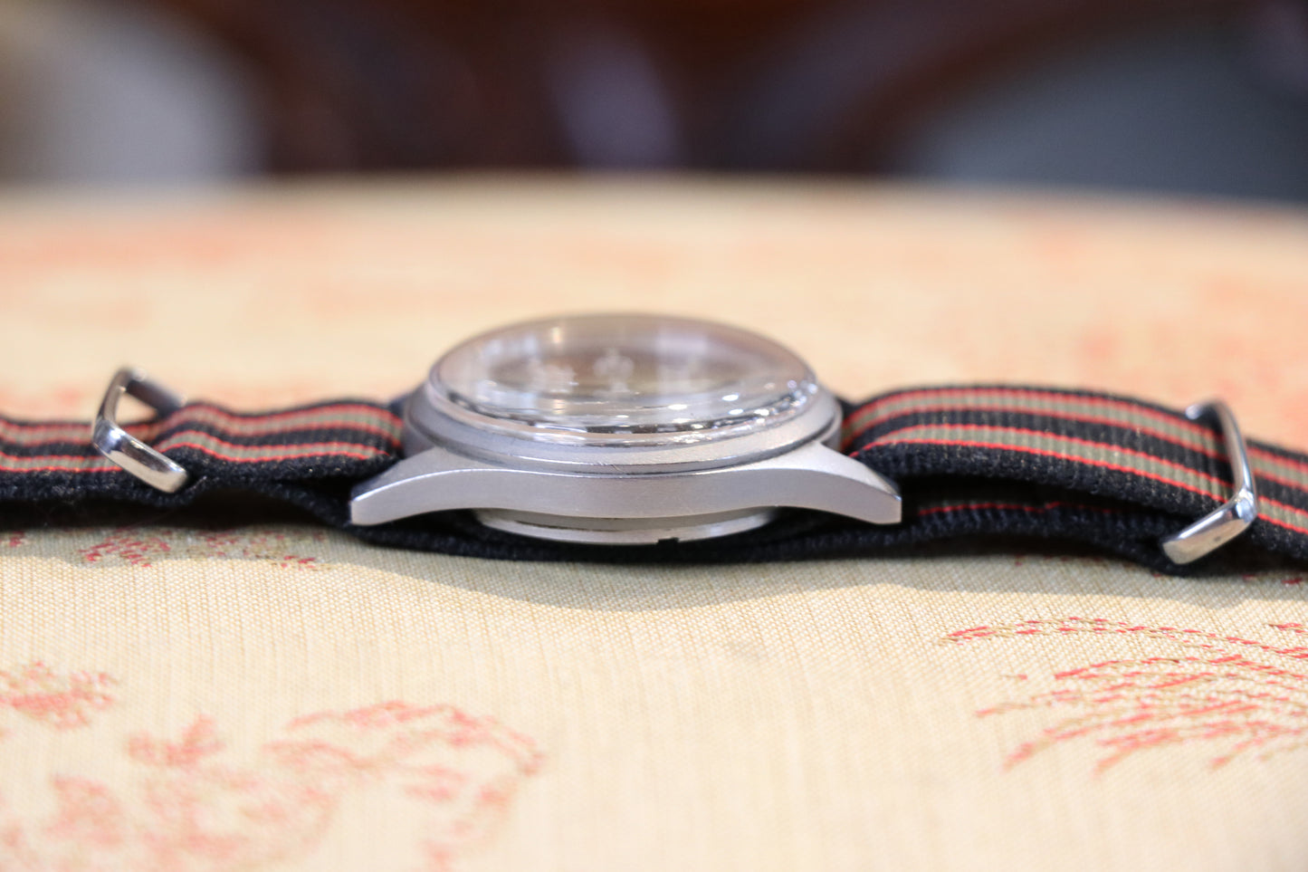 Case is in quite good shape with light age-appropriate patina and fresh crystal, mounted on new NATO strap. Face measures approx. 1 and 1/4" diameter, adjustable band is approx. 7/8" wide.