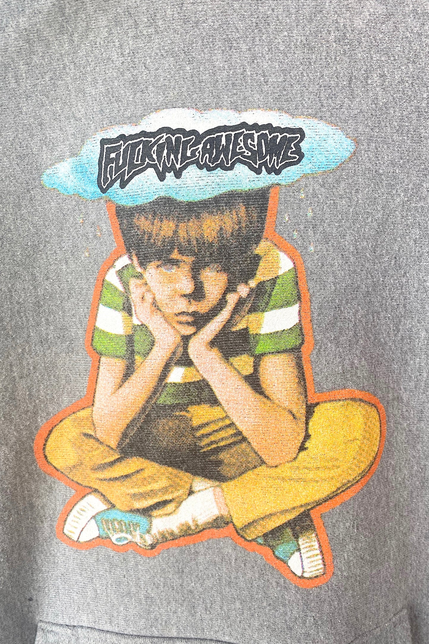 Fucking Awesome Grey Hoodie. Good condition, has a rip at hood opening. “Fucking awesome” and seated boy graphic printed hoodie with front pocket. 70% cotton 30% polyester, machine was cold. Marked as size M.