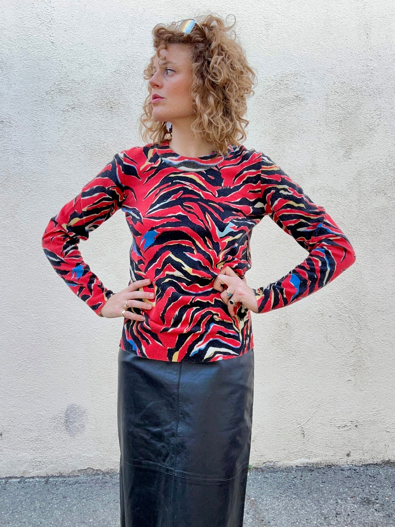 Be cozy and colorful in this Animal Print Sweater by Balenciaga. A blend of wool, cashmere, and silk makes this sweater extra soft. Ribbed knit trim on the collar, cuffs, and hem add some texture and structure to this vivid piece.