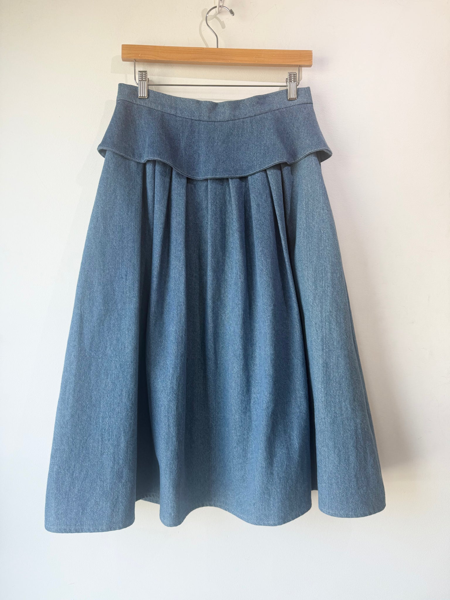 This Batsheva denim skirt features elegant pearl buttons and a heavy fabric ideal for winter. Its sturdy design makes layering effortless and stylish for colder days.