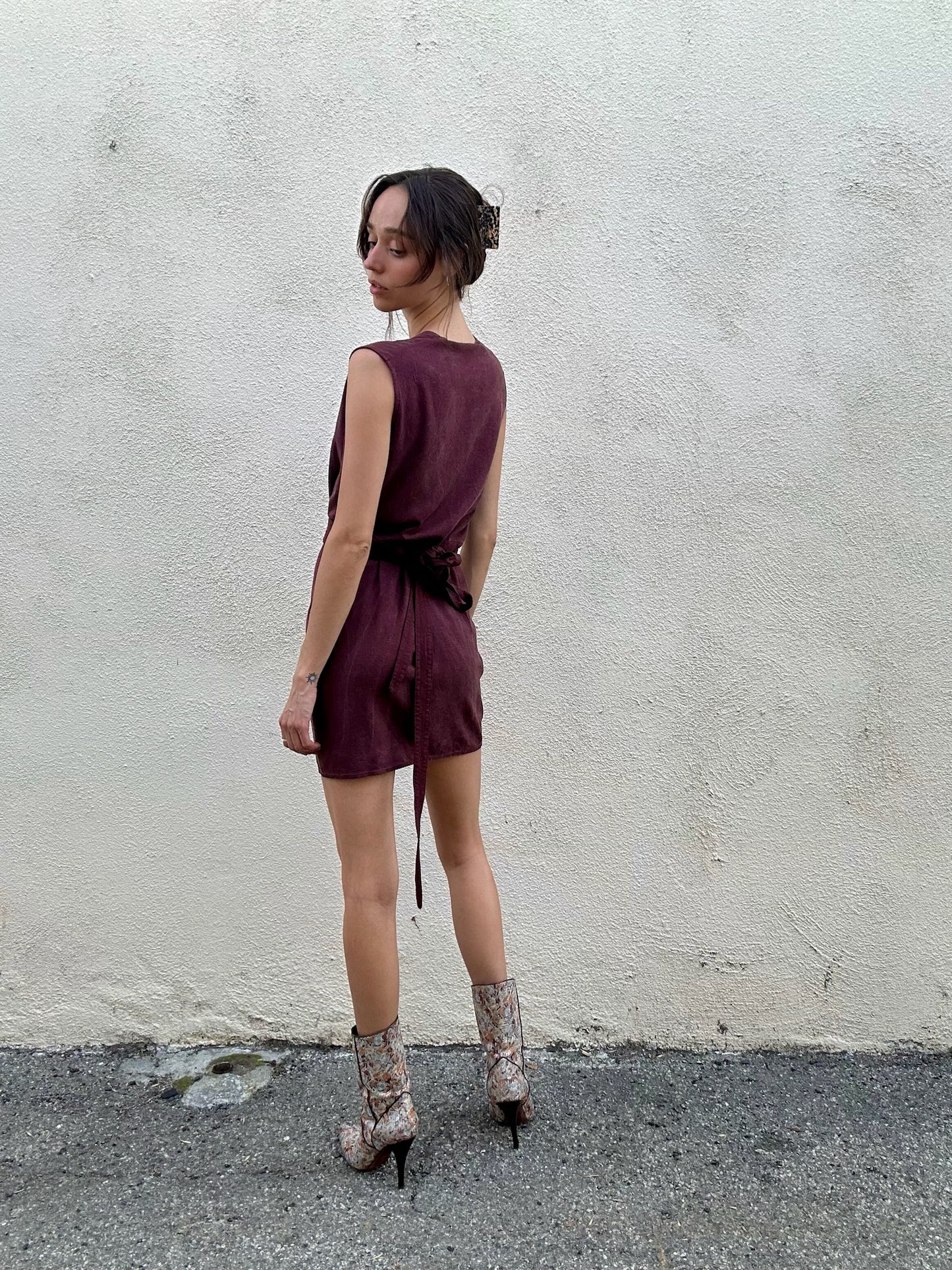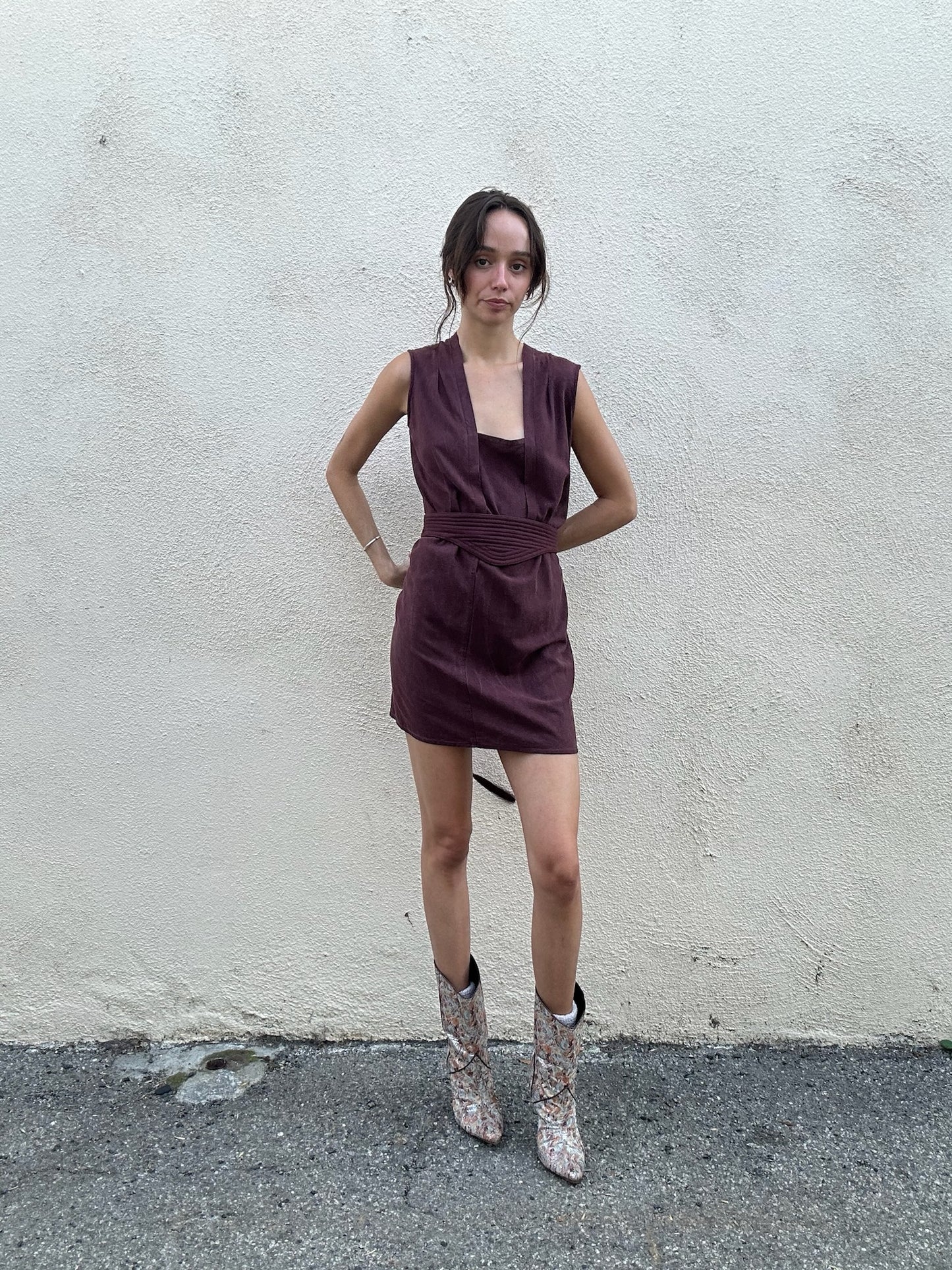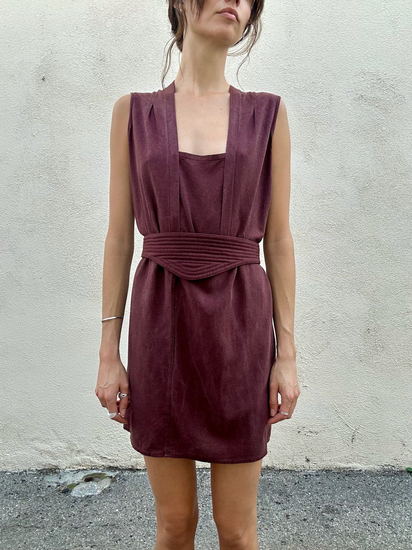 Electric Feathers Maroon Raw Silk Dress. Adorable little shift dress with folded panel detailing on the front and a square neckline. Mini length, sleeveless. In good used condition. 100% raw silk, dry clean or hand wash only. Marked size S.