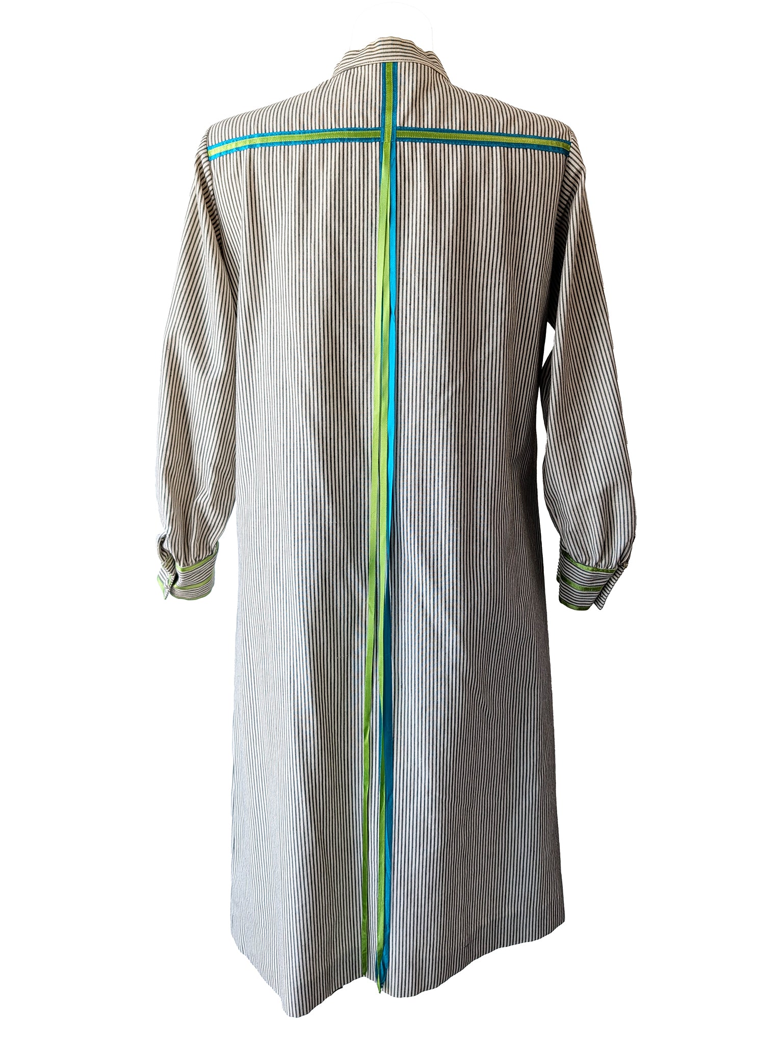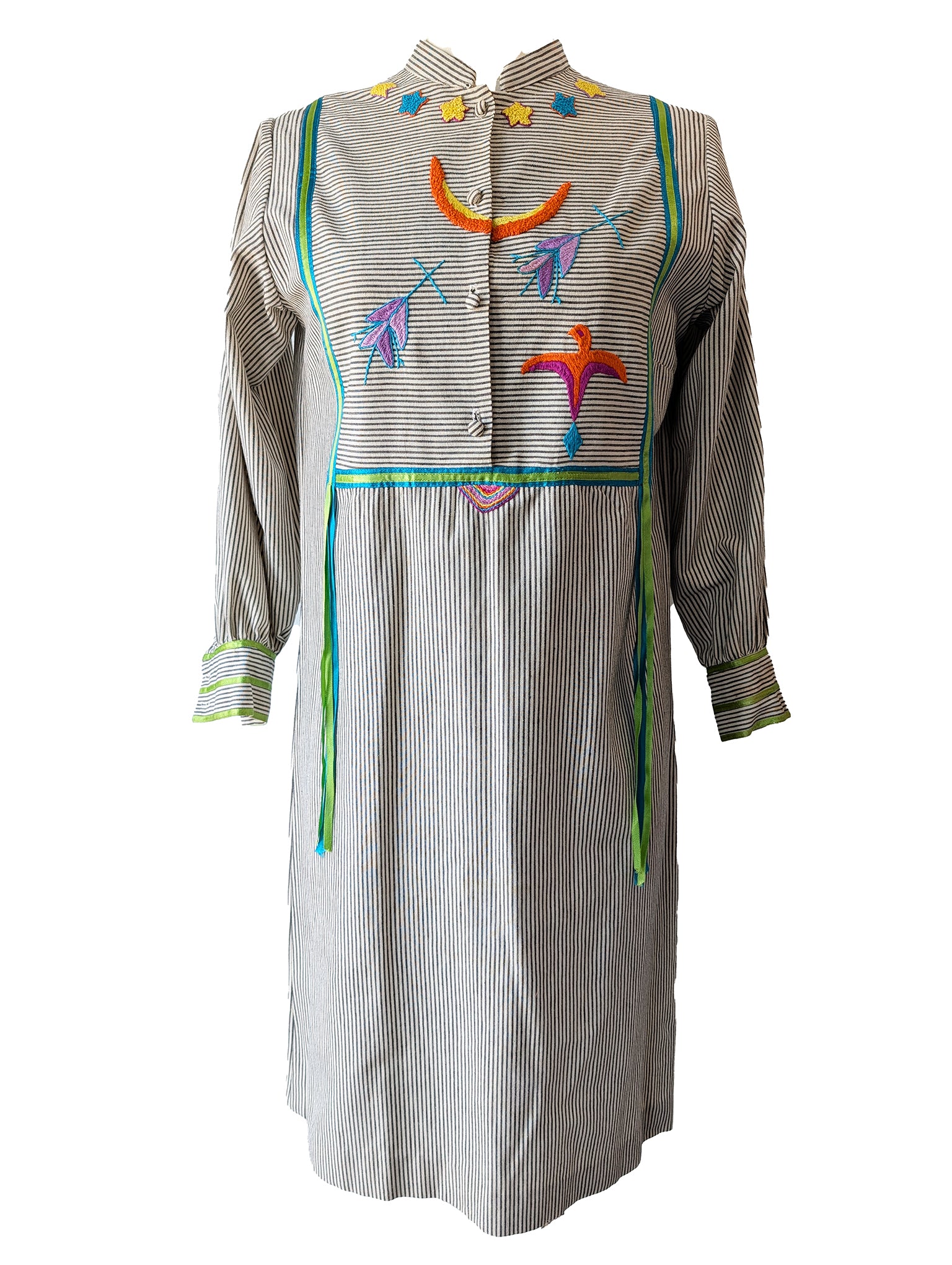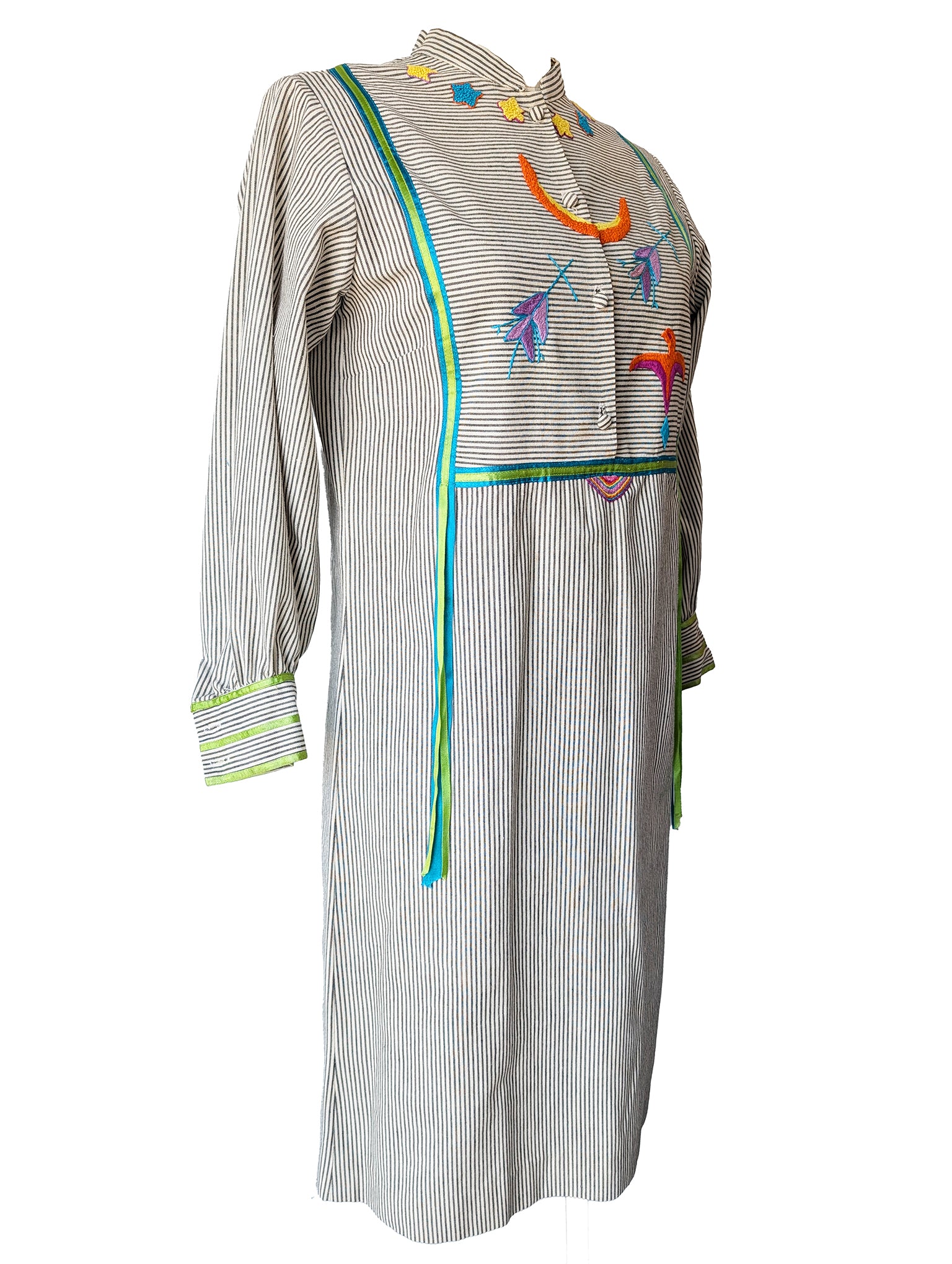 Classic stripes meet joyful motifs in this hand-embroidered Josefa dress. Brightly stitched moons, stars, and birds pop against soft, weighty black-and-white cotton, each shape unique in that unmistakably handmade way. Finished with fluttering contrast ribbon trim, fabric-covered buttons, and stripe-play cuffs, it’s a piece that celebrates the hand that made it and the personality that wears it. Dress is in excellent worn condition and is free of notable flaws.