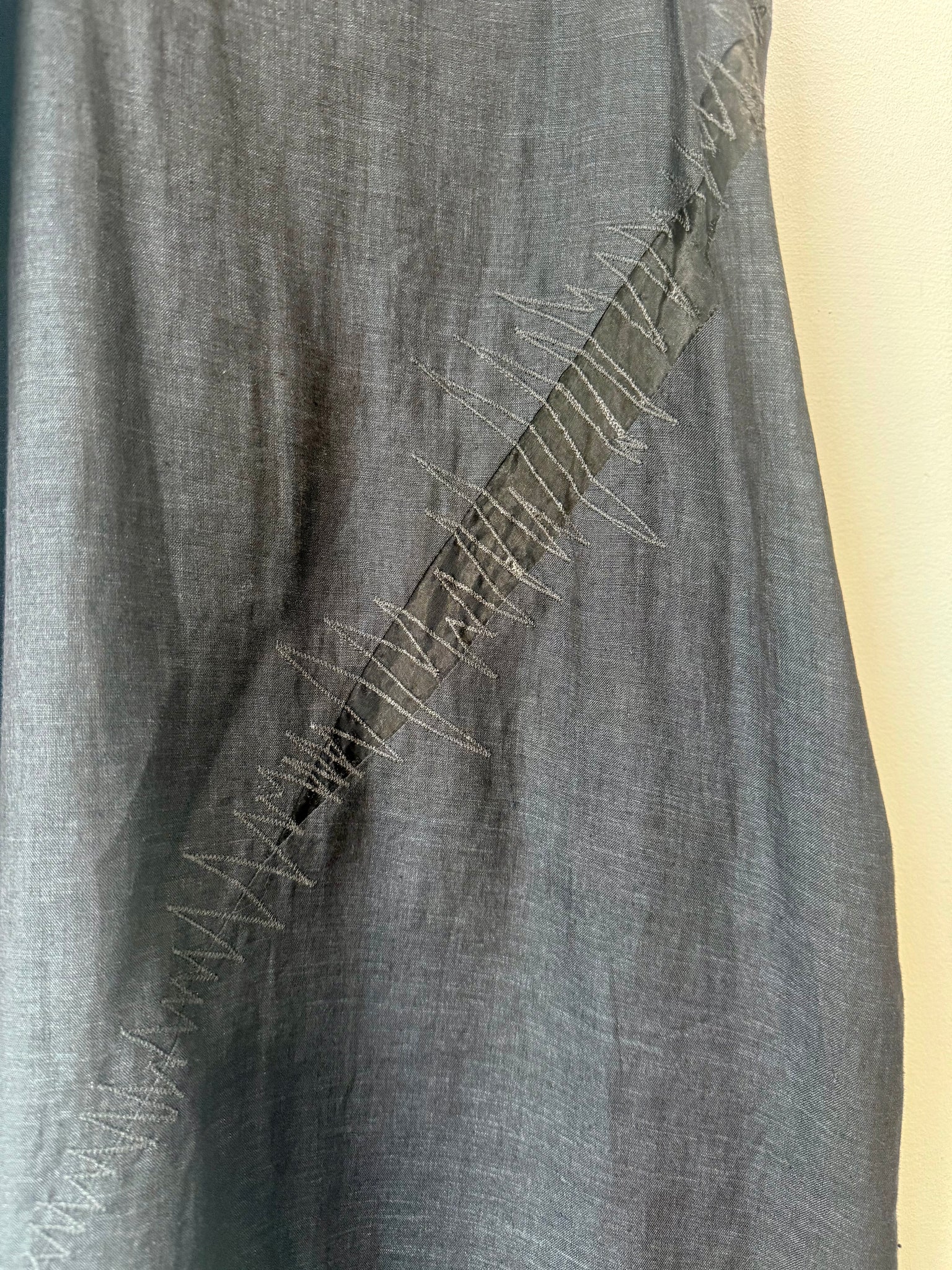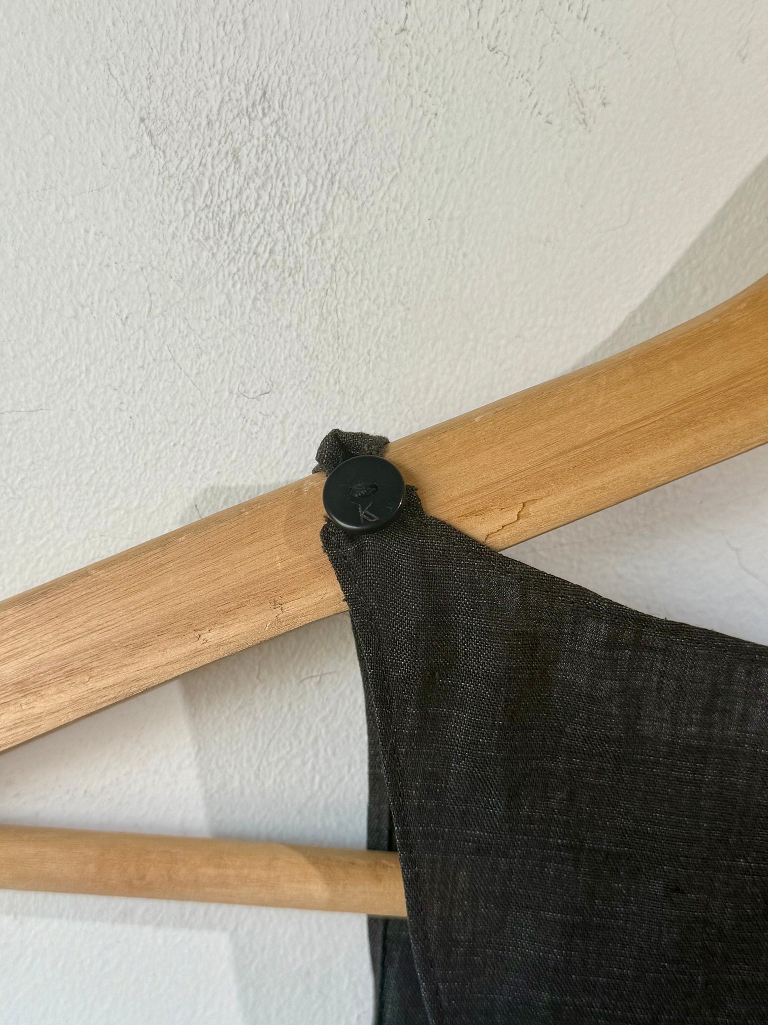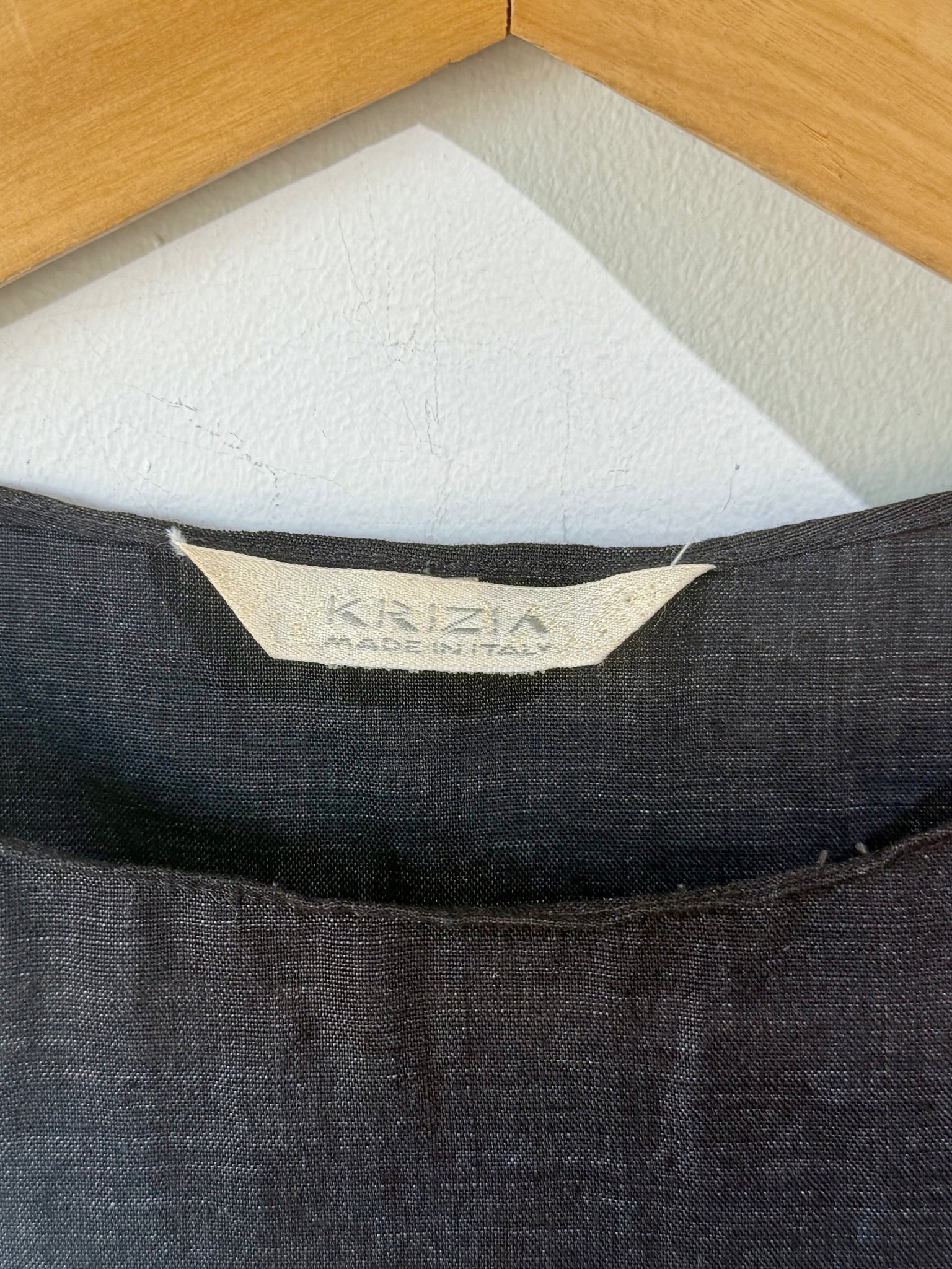 Elevate your wardrobe with this charcoal linen Krizia dress, showcasing a striking diagonal zigzag motif enhanced by sheer mesh accents. The left-side zipper and button-fastened strap ensure a secure fit, while quality linen construction delivers timeless sophistication. Minor imperfection: small tear on right hip area.