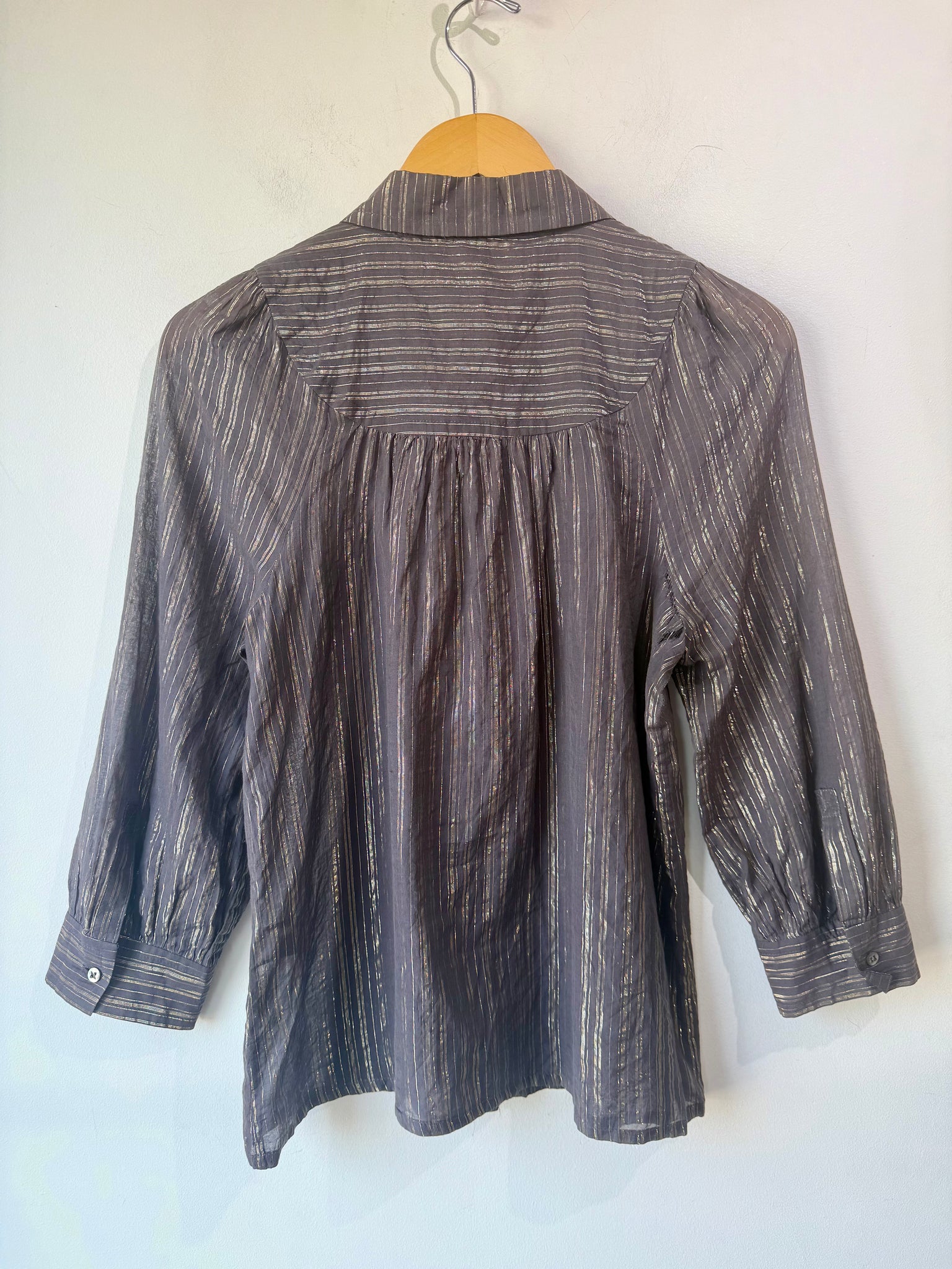 Vintage Marc Jacobs blouse in soft ash grey with shimmering metallic stripes. Features a charming peter pan collar and button-front closure with relaxed, semi-sheer fabric. Labeled size 6, fits XS-S. Note: includes a repair on the left shoulder and a small rip in the right underarm seam—perfect for vintage lovers who appreciate character and authenticity.