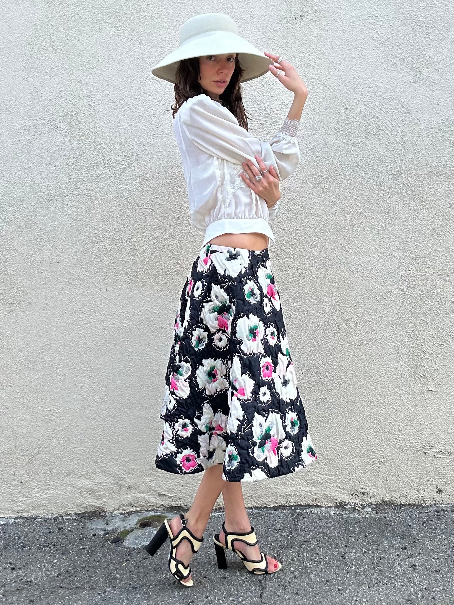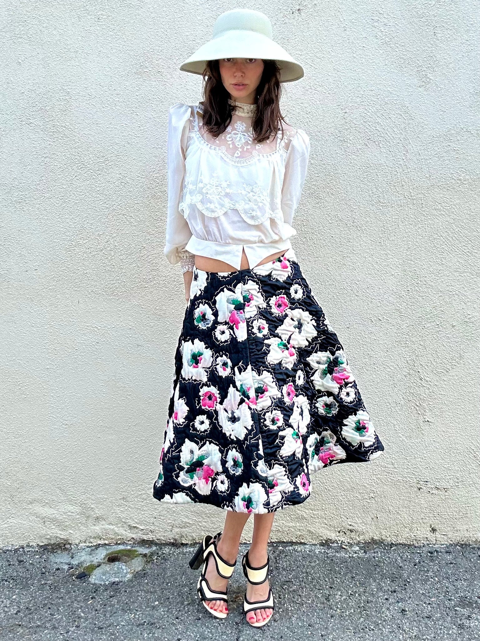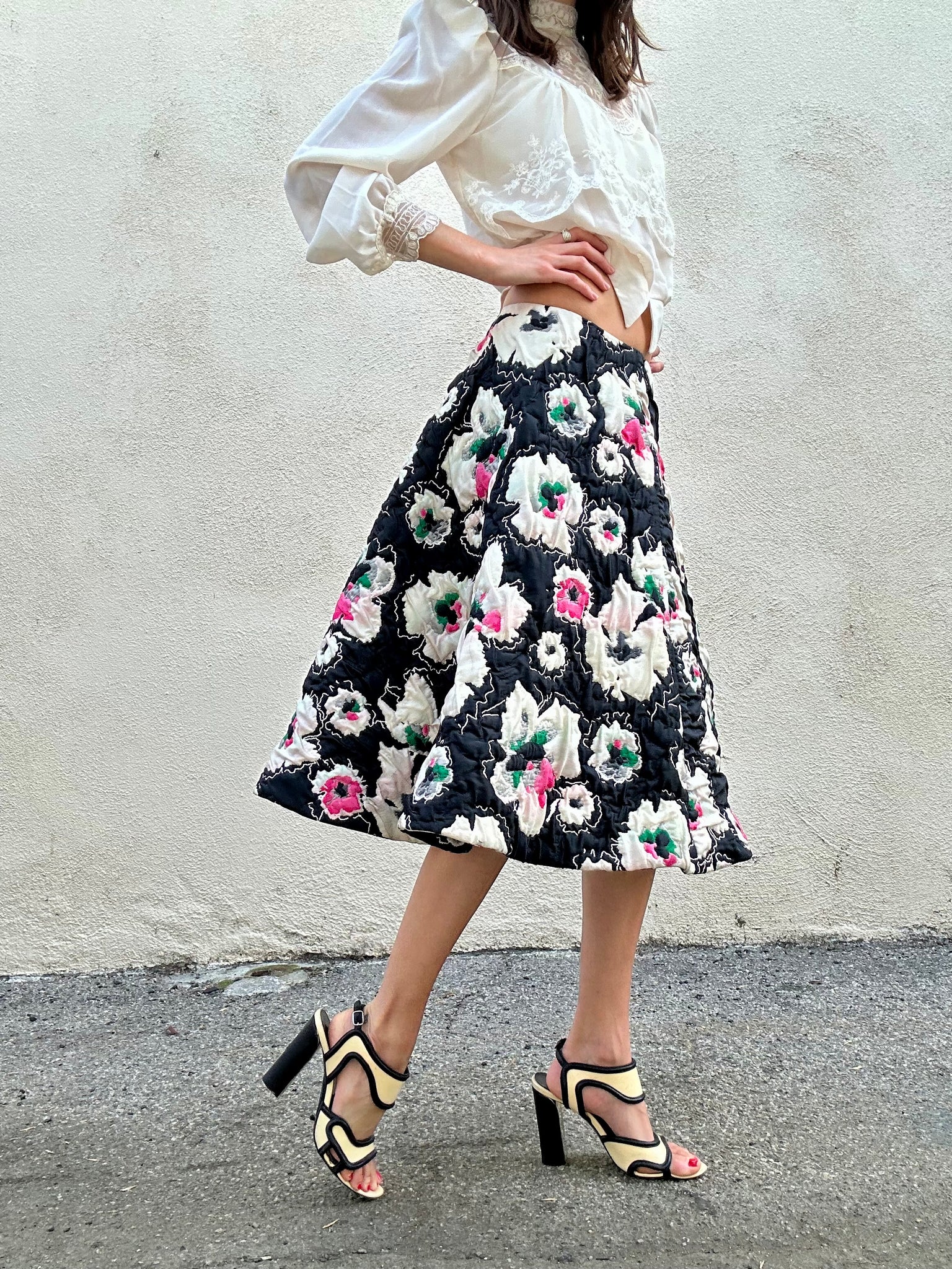 Marni Black Floral Quilted Circle Skirt, fits like XS/S/M. A standout Marni piece with sculptural volume and bold floral quilting in black, ivory, pink, and green. Full circular silhouette with swing and structure, finished with a smooth waistband and side zip. Romantic yet graphic, soft but strong. Pairs beautifully with crisp blouses or cropped knits.