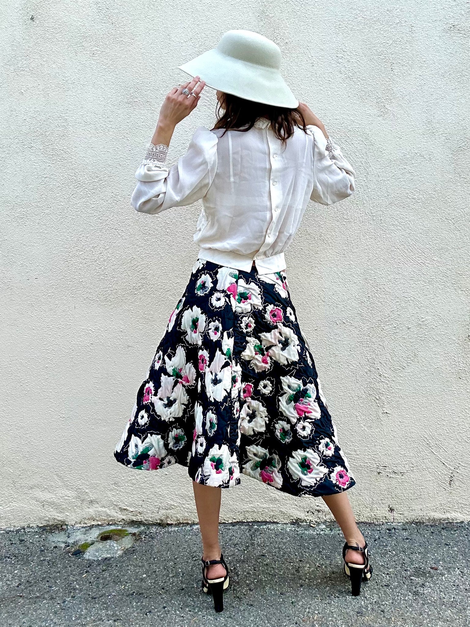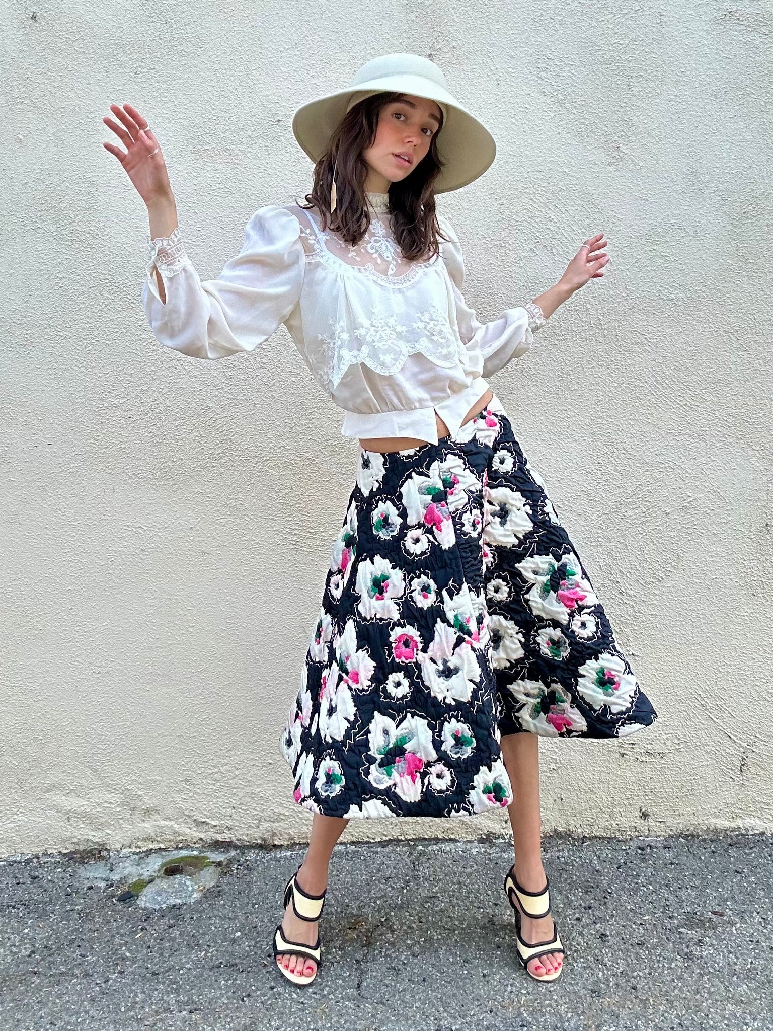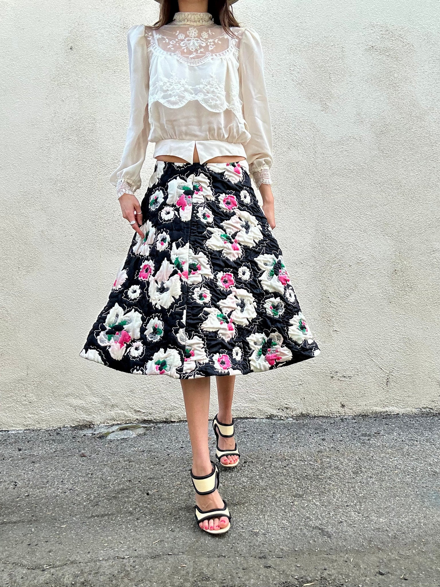 Marni Black Floral Quilted Circle Skirt, fits like XS/S/M. A standout Marni piece with sculptural volume and bold floral quilting in black, ivory, pink, and green. Full circular silhouette with swing and structure, finished with a smooth waistband and side zip. Romantic yet graphic, soft but strong. Pairs beautifully with crisp blouses or cropped knits.