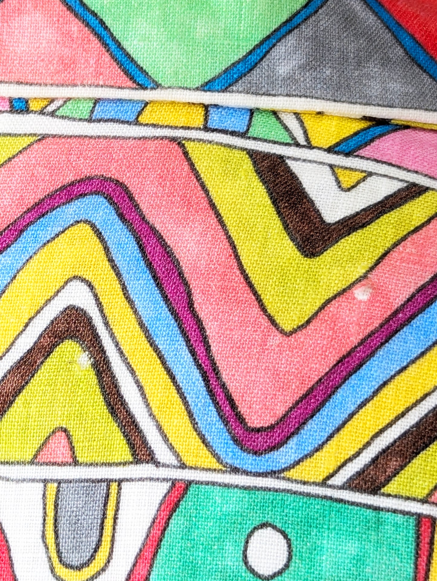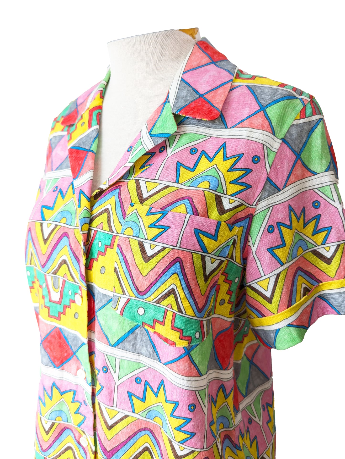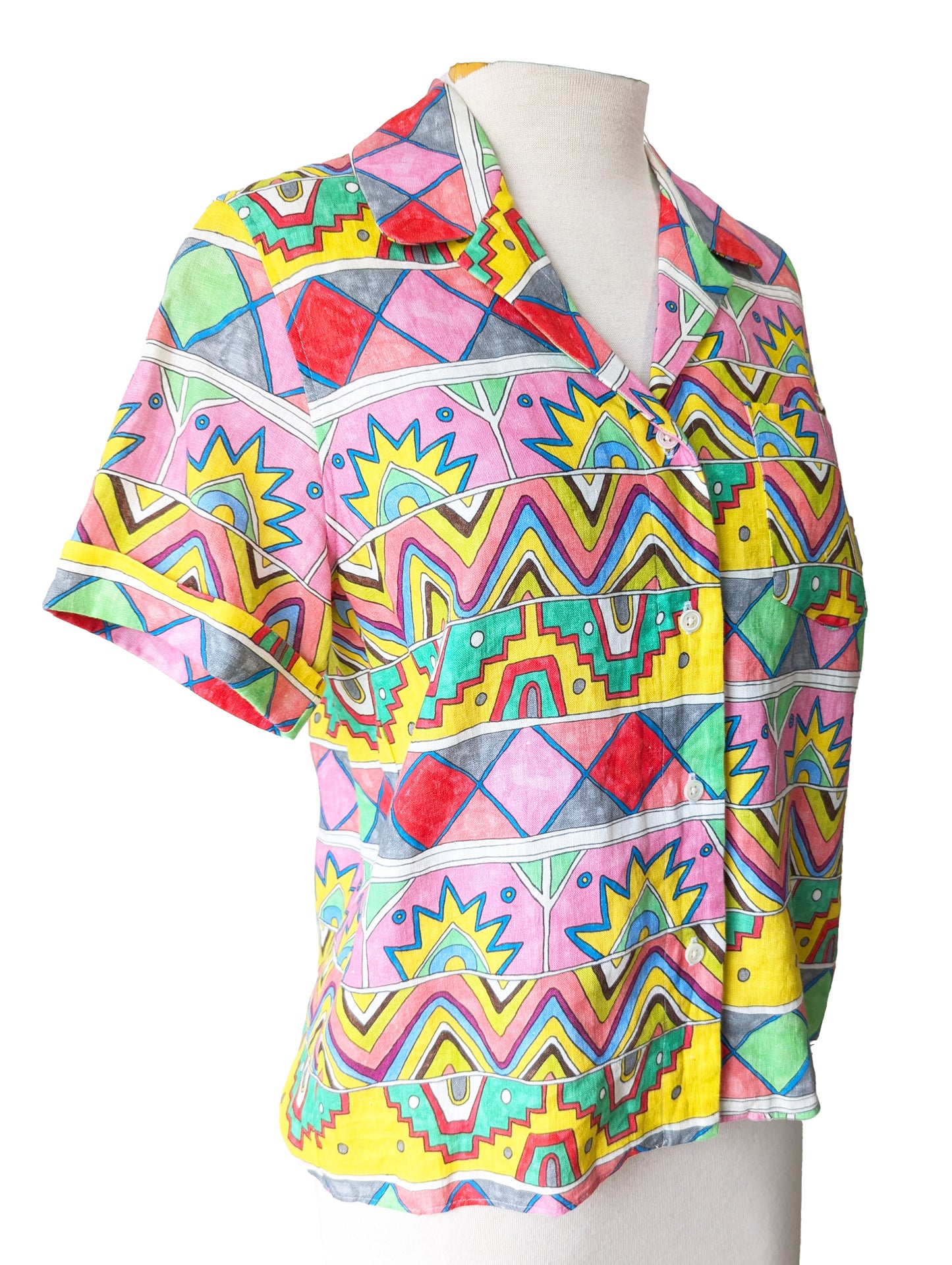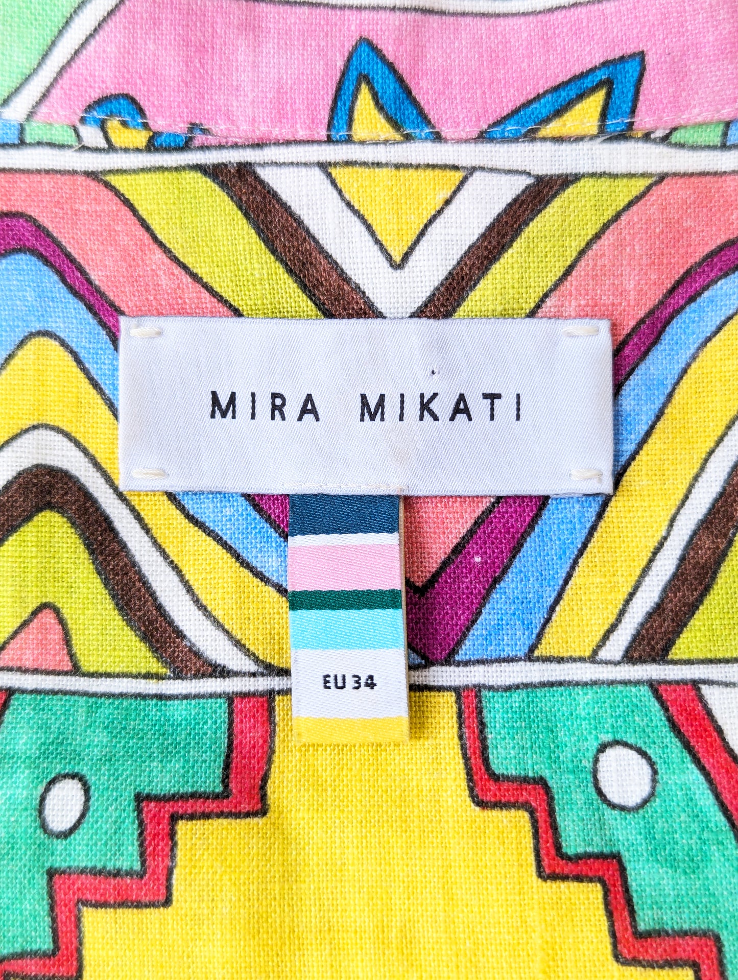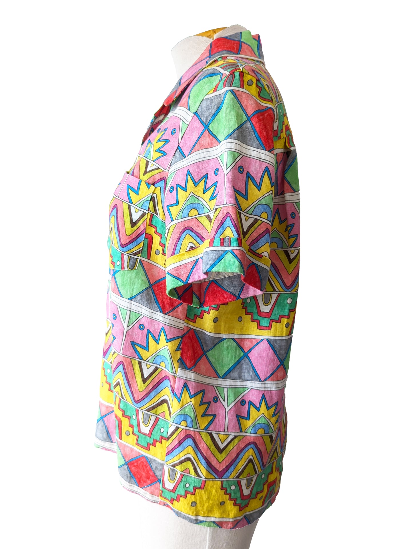 A riot of color and pattern, this Mira Mikati shirt takes Southwest motifs and gives them a kaleidoscopic spin. Made of soft linen, it’s cut with an easy, relaxed fit and finished with a button front and single chest pocket. The hand-drawn style print makes it less “casual Friday” and more “casual spotlight.” Shirt is in excellent condition and has tiny printing flaws on the back (pictured).