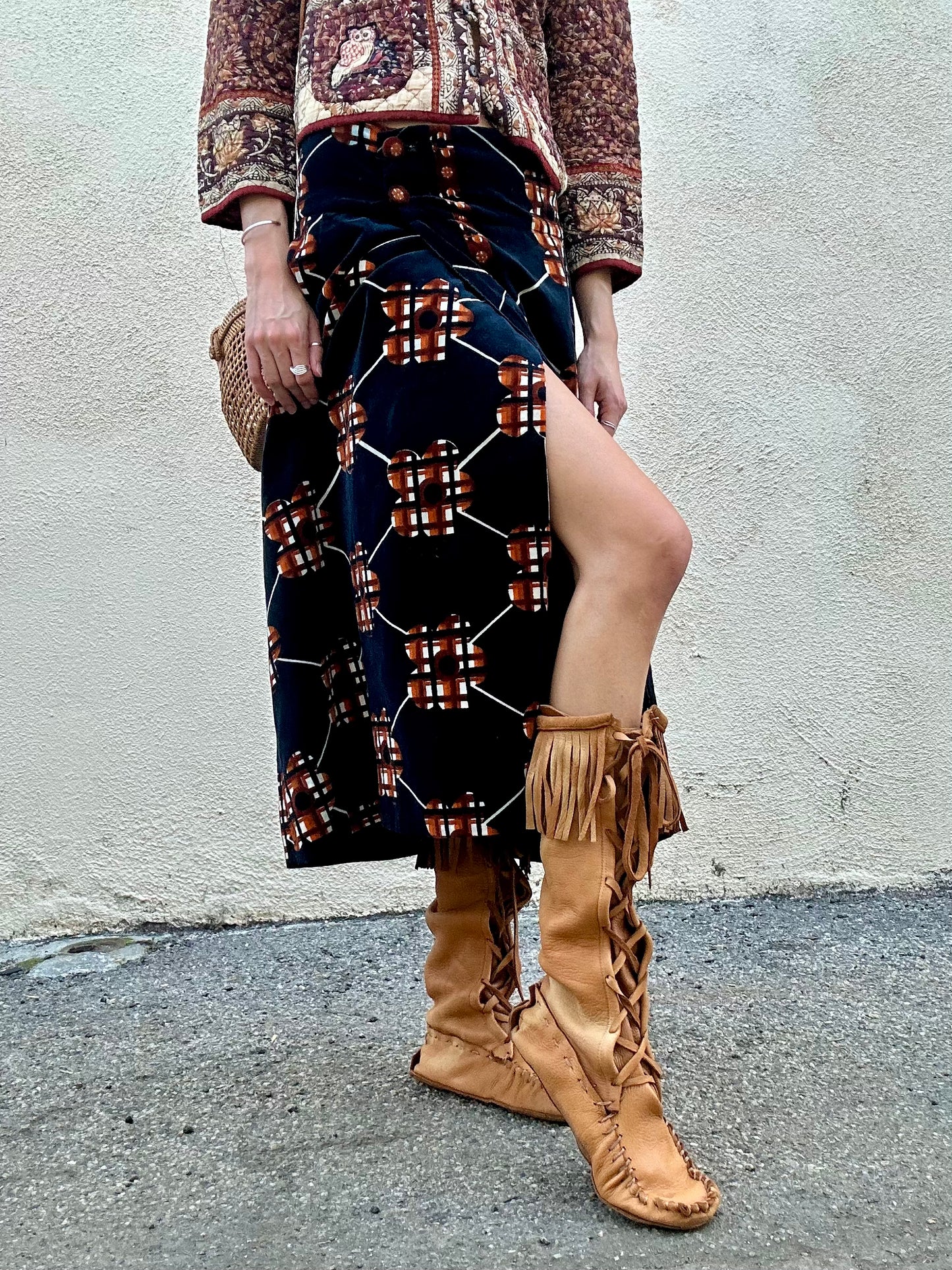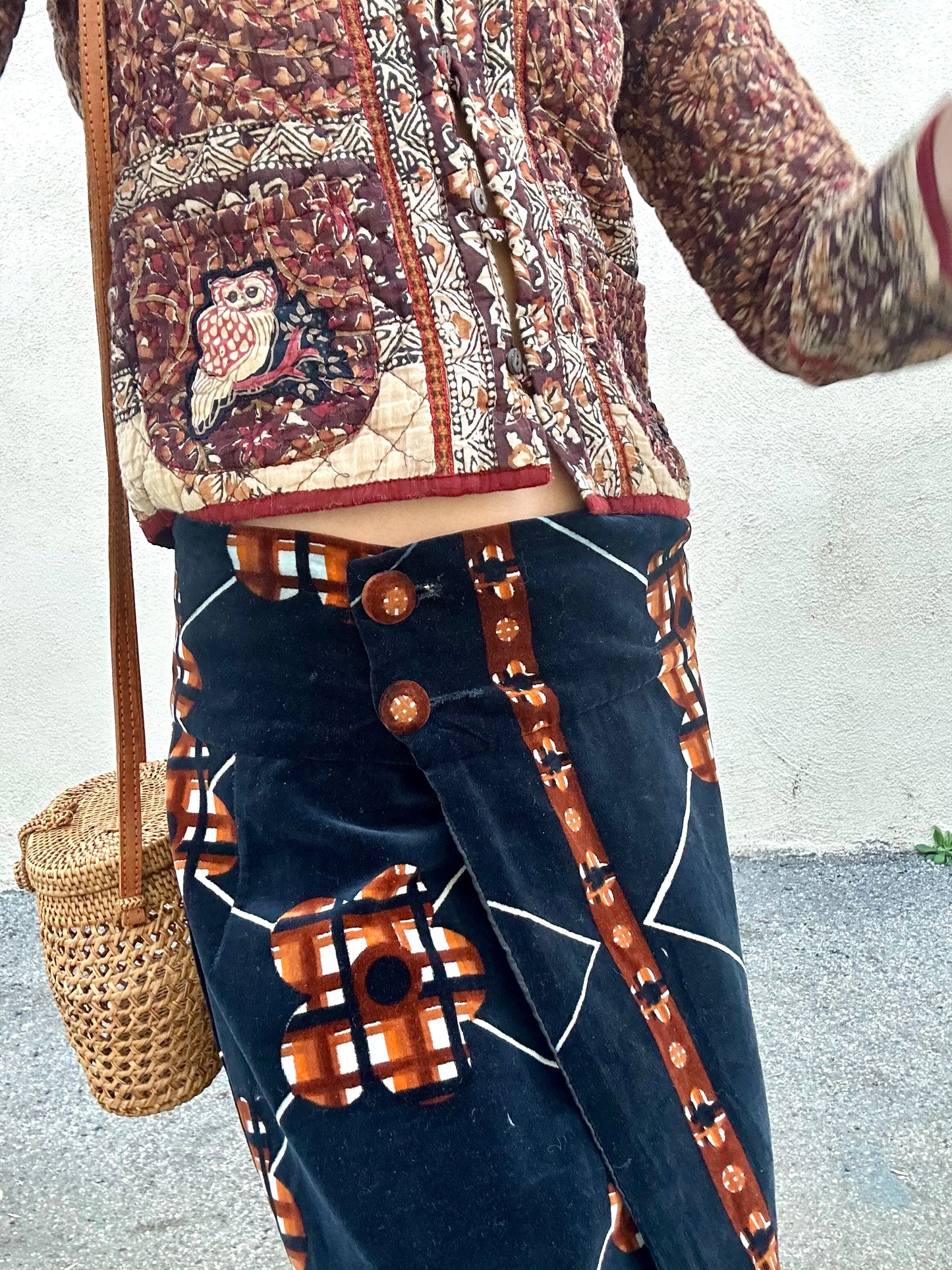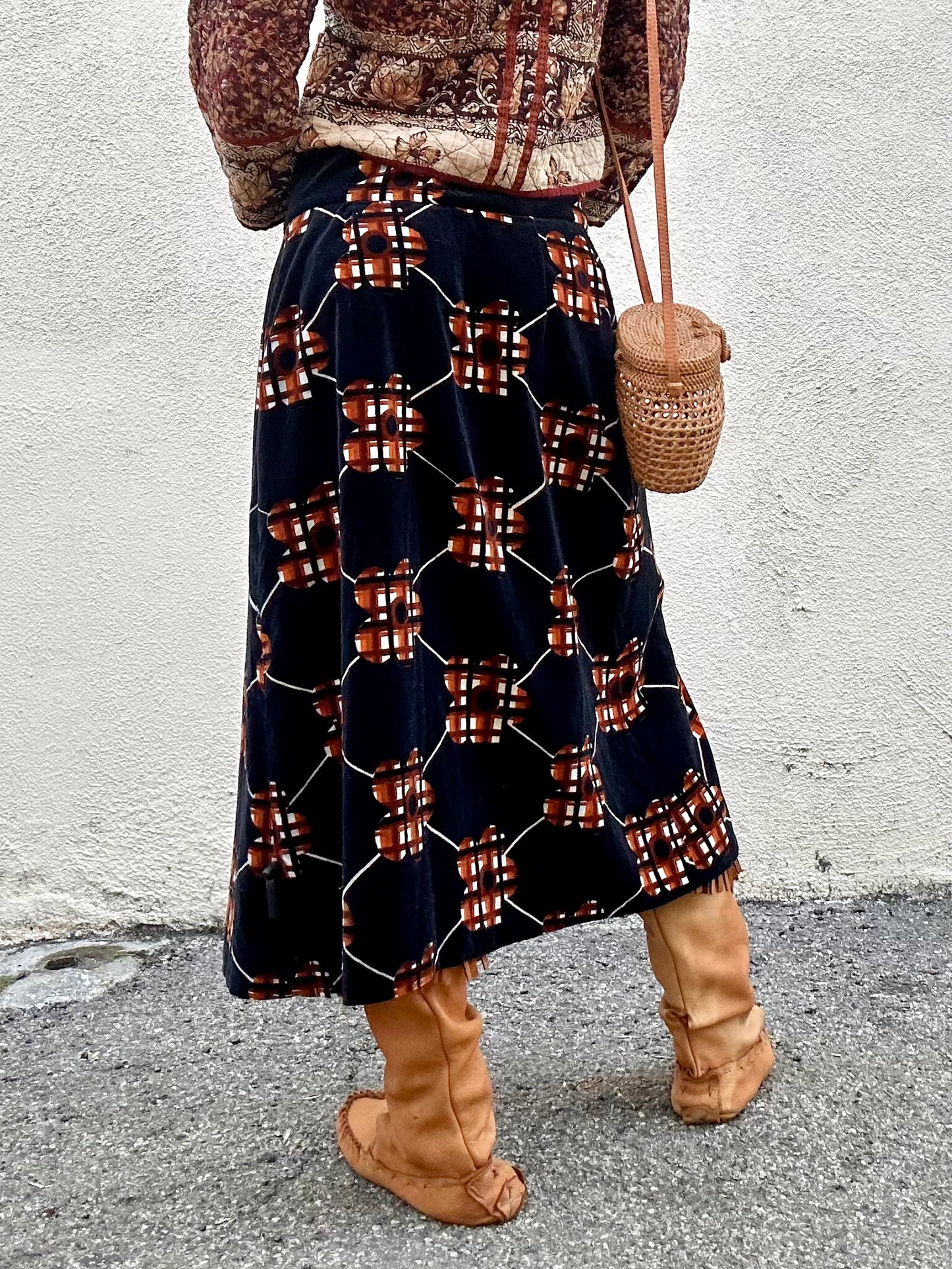 Navy Velvet Wrap Skirt with Brown Plaid Flowers. Add a touch of whimsy to your wardrobe with fun and funky piece! This playful midi length wrap skirt features a unique lattice and plaid flower design, finished off with a fun two-button closure. Skirt is in very good vintage condition. There are faint pinprick marks on the right seat where a dart was taken out as well as a small section where seam was repaired (see photo). Otherwise, garment is free of stains, tears and defects. Fully lined.