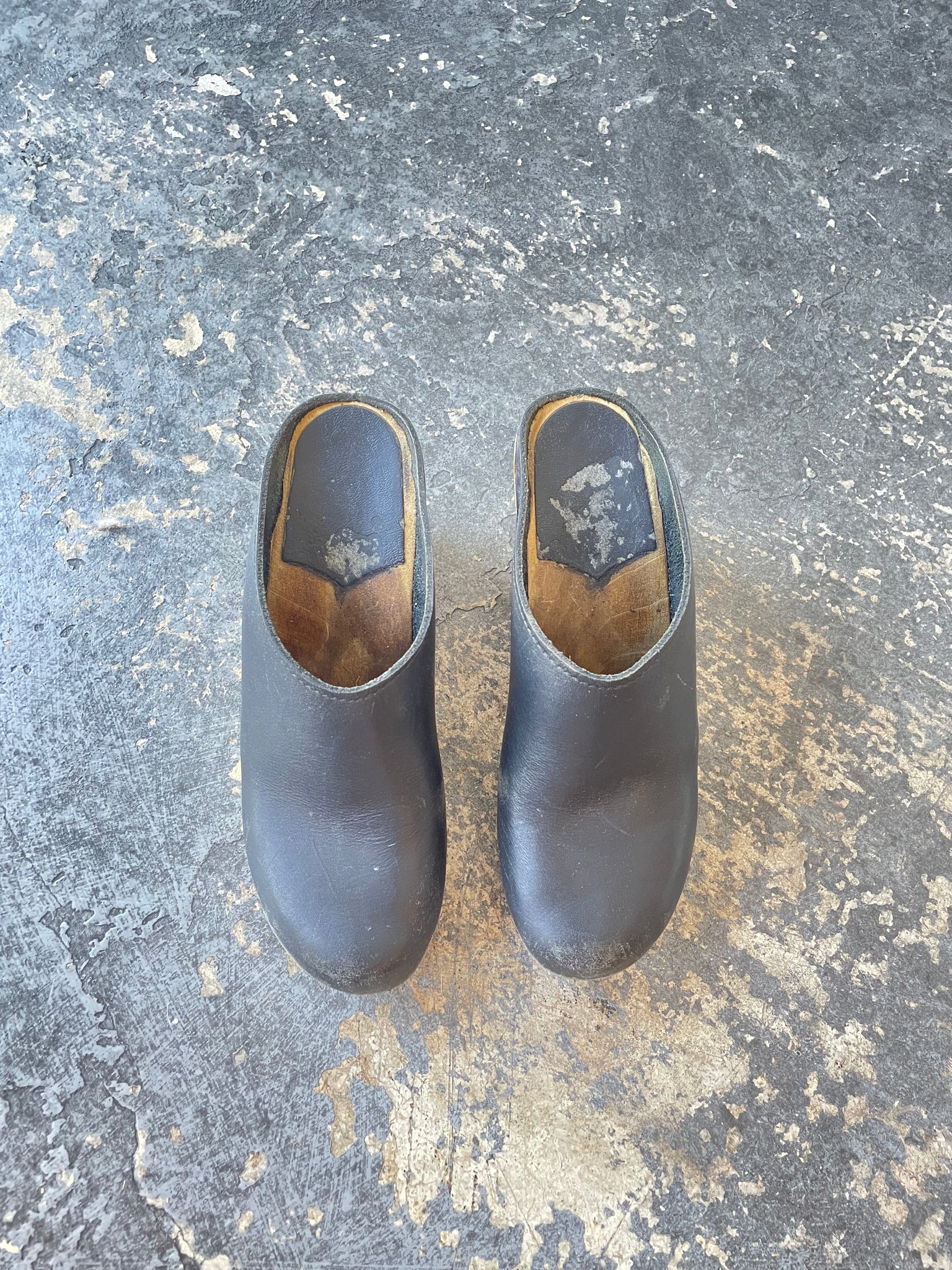 No.6 Black Leather Wedge Clogs, Size 37. American size 7. Classic No.6 silhouette with a black leather upper and natural wooden wedge sole. Open back with a rounded toe and staple detailing along the base. Comfortable lift, easy slip-on style. Sold as is: light surface wear and small scuffs consistent with age and use. Structurally sound with plenty of life left.