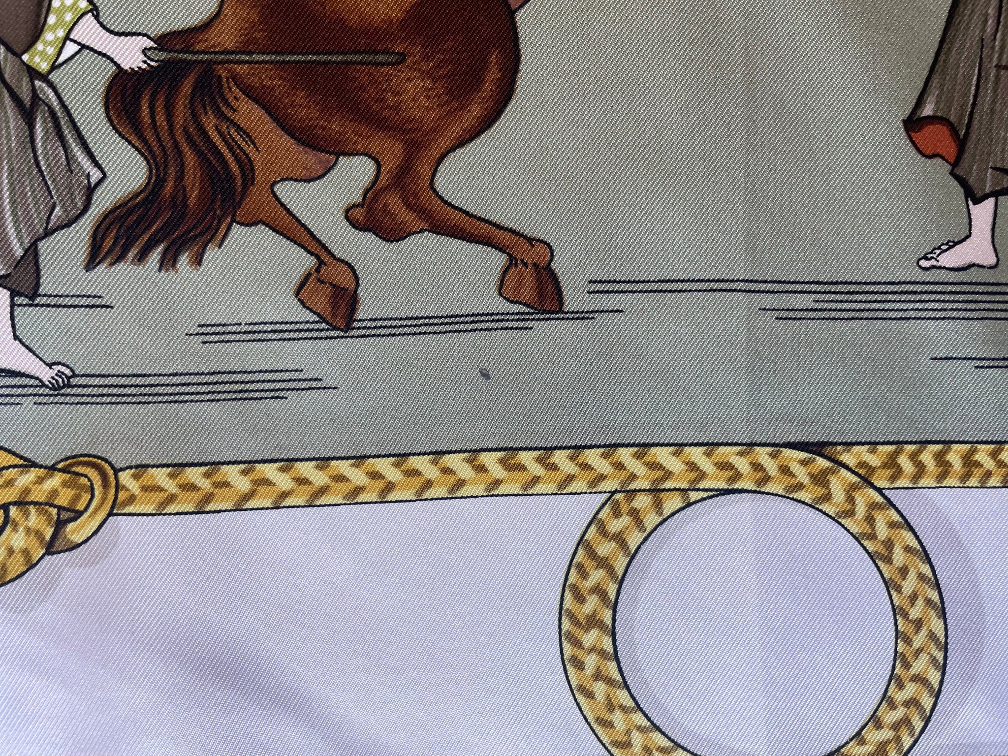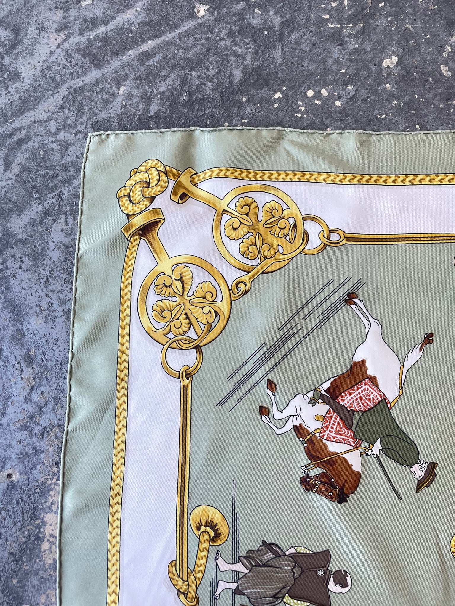 Hermès “Équitation Japonaise” Green Silk Scarf by Françoise de la Perrière (1969). Vintage Hermès carré featuring an equestrian motif inspired by Japanese riding traditions, designed by Françoise de la Perrière and first issued in 1969. Rich green silk twill with hand-rolled edges, measuring approximately 35 x 35 inches. Beautiful vintage condition with crisp color and light, natural wear consistent with age.