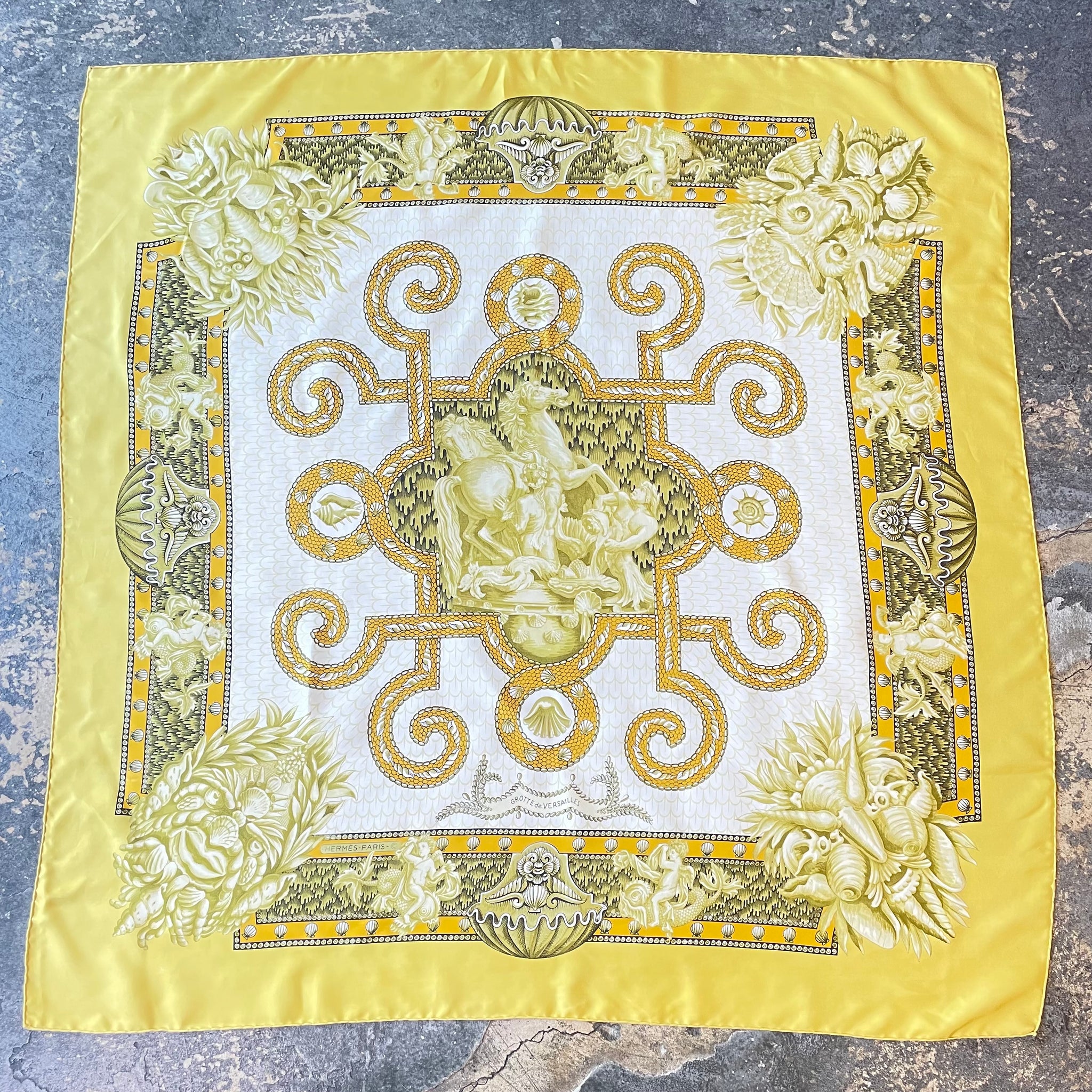 Hermès “Grotte de Versailles” Yellow Silk Scarf by Maurice Tranchant. Vintage Hermès carré in a rich golden-yellow tone featuring the baroque grotto motif at Versailles: horses, fountains, ornate scrollwork, and symmetrical framing. Designed by Maurice Tranchant and first issued in 1969. 100% silk twill with hand-rolled edges, measuring approximately 35 x 35 inches. Sold as‐is with slight vintage wear visible in photos, which is reflected in the price.