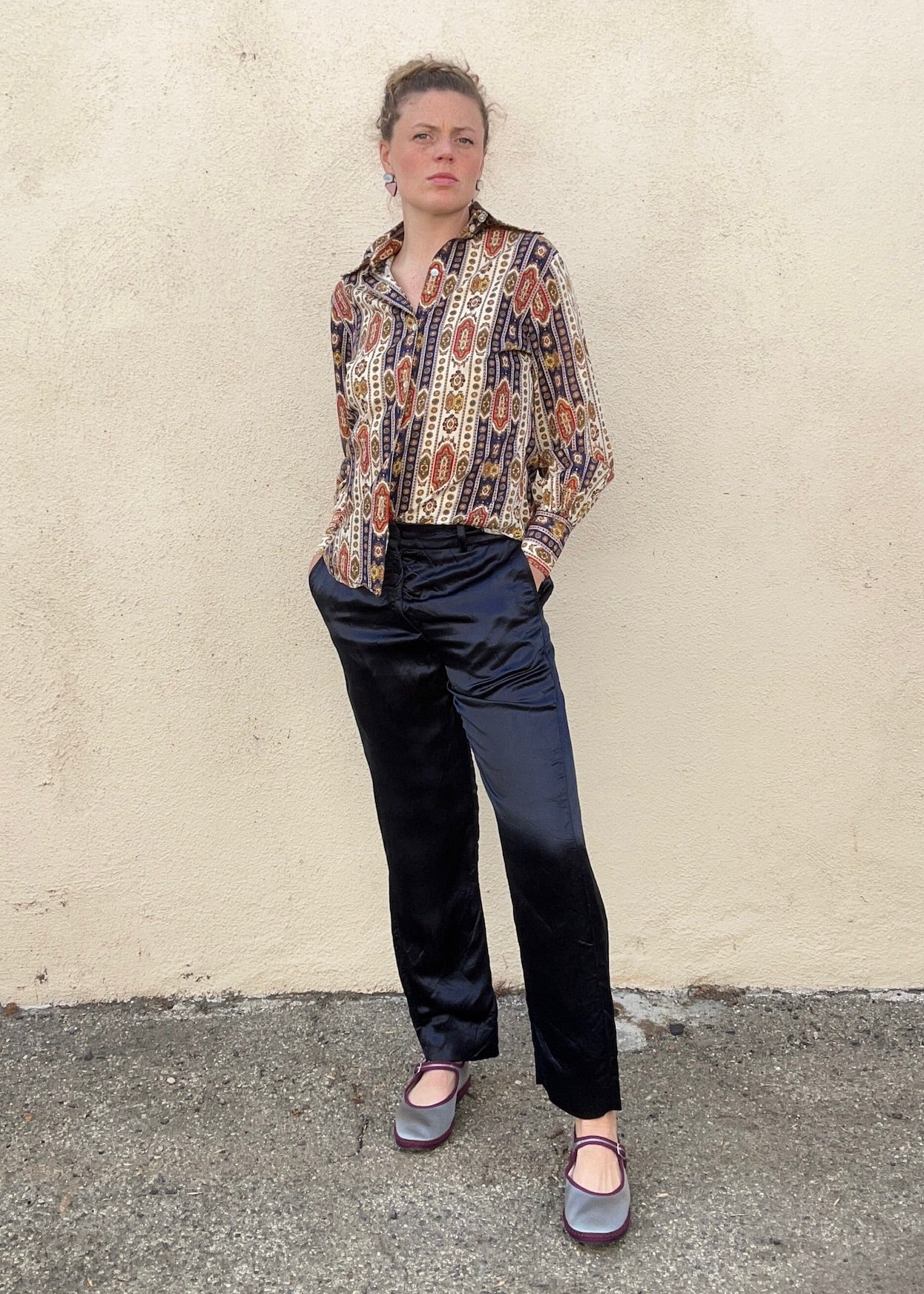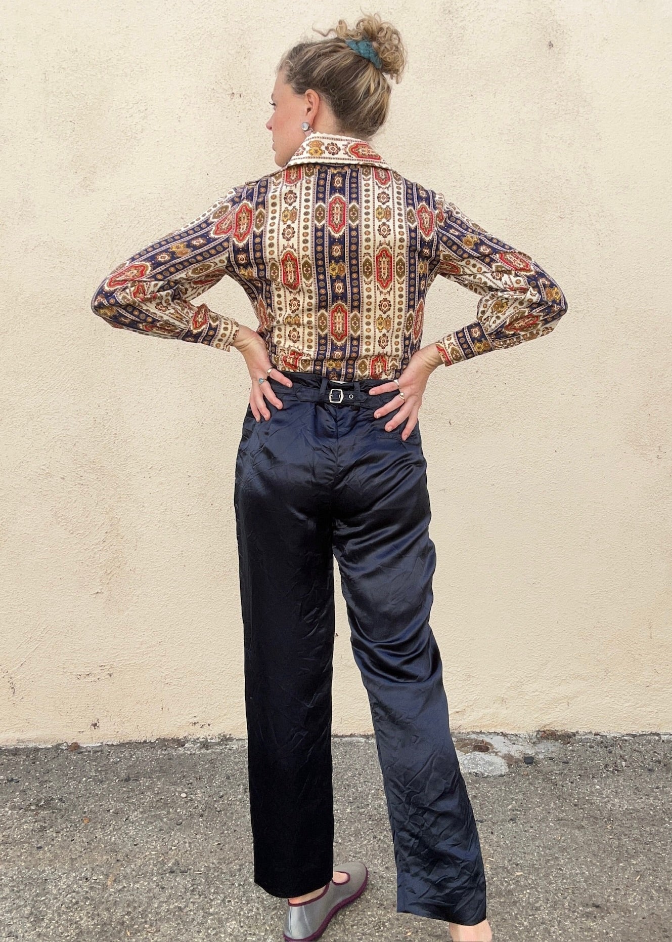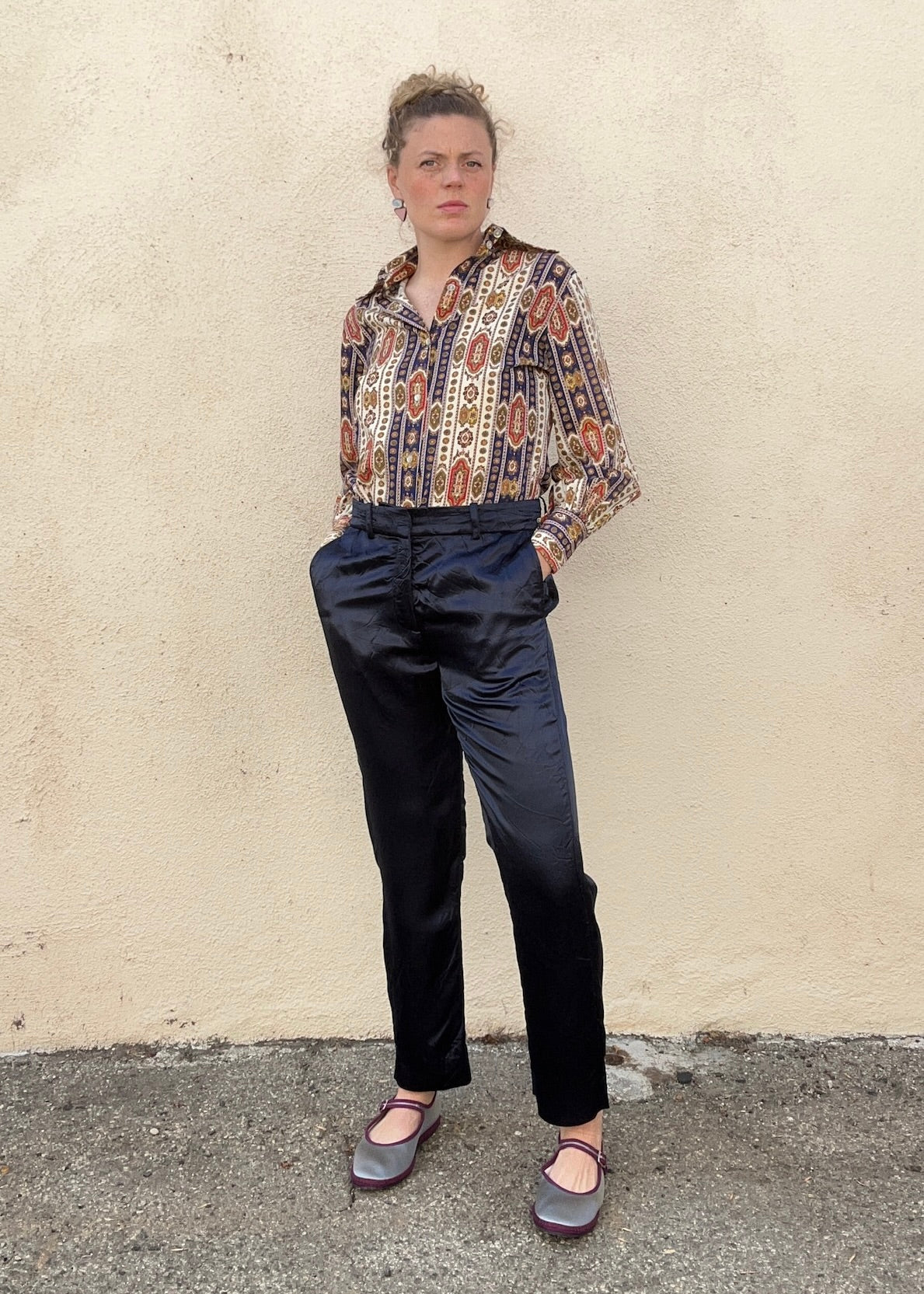 This vintage blouse feels like something discovered at a Paris flea market and immediately thrown on with gold hoops and a sense of purpose. The fabric—likely cotton or a cotton blend—has a soft, natural hand and features an intricate bohemian print in navy, brick red, olive, and cream. The shape is a classic ‘70s-style button-down with a sharp collar, relaxed fit, and subtle balloon sleeve that tapers to a button cuff.