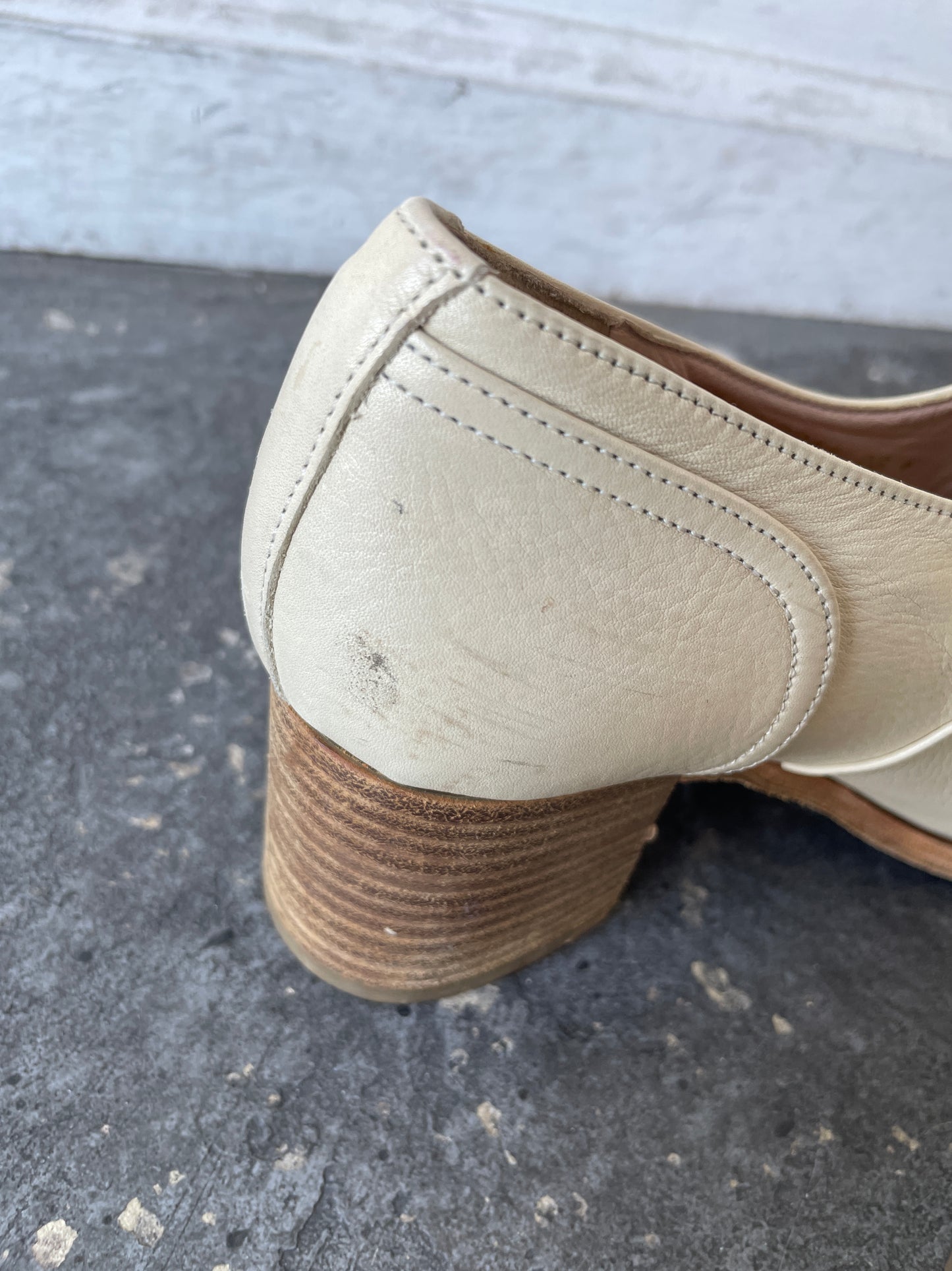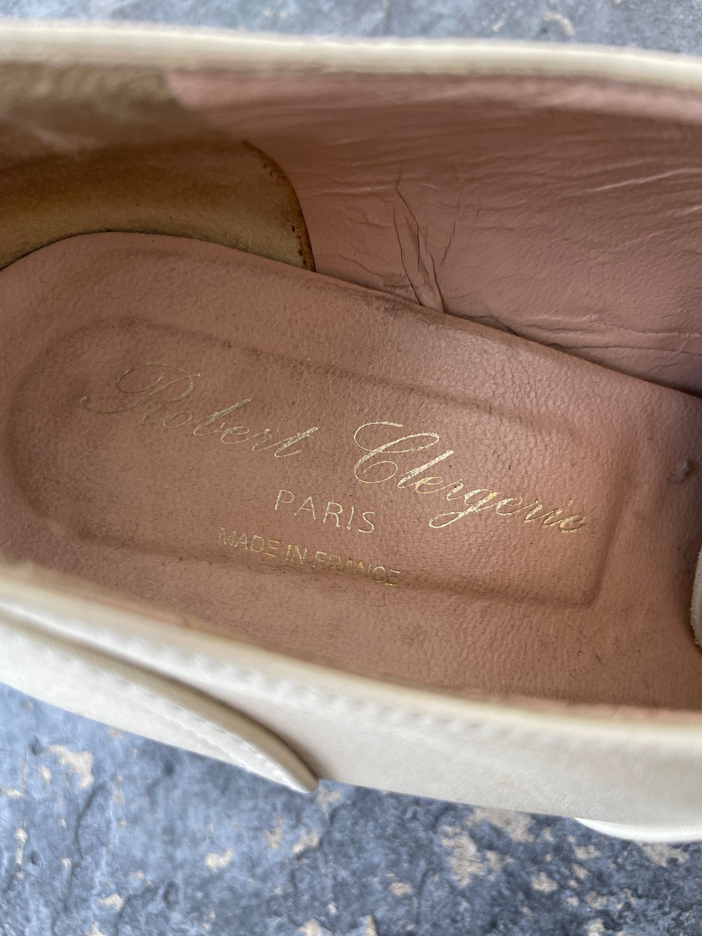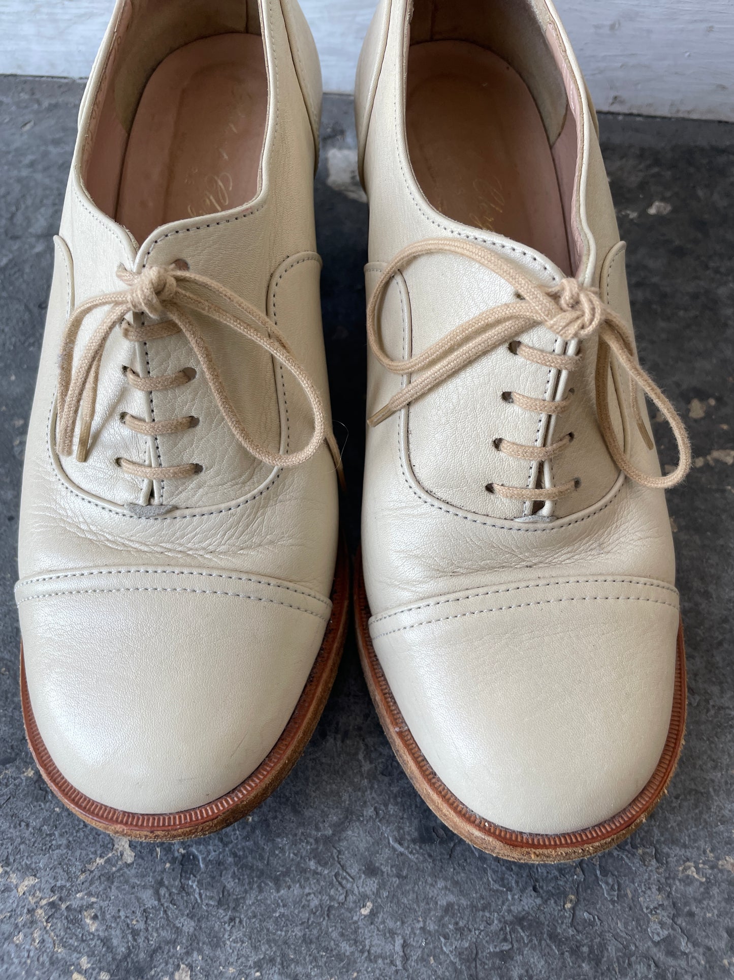 Vintage Robert Clergerie White Spectator Heels. A stylish pair of vintage style heels. Features a wonderful cream colored leather and laced design. Low heel for comfort. Leather upper leather sole. In very good condition some wear. Made in France. Size 7.5.
