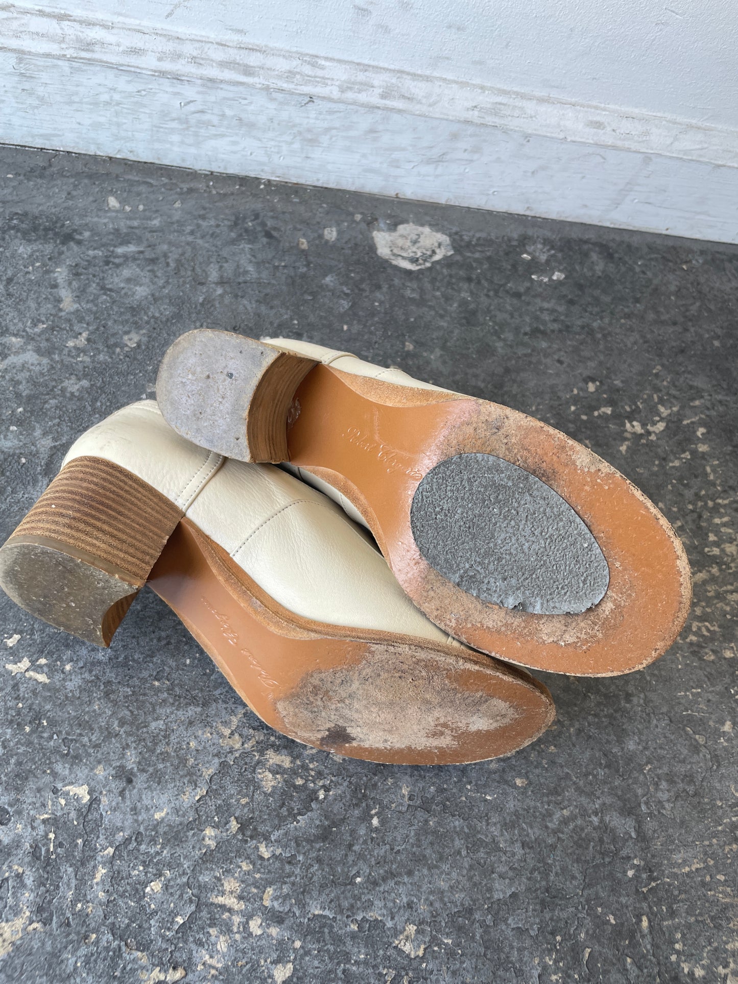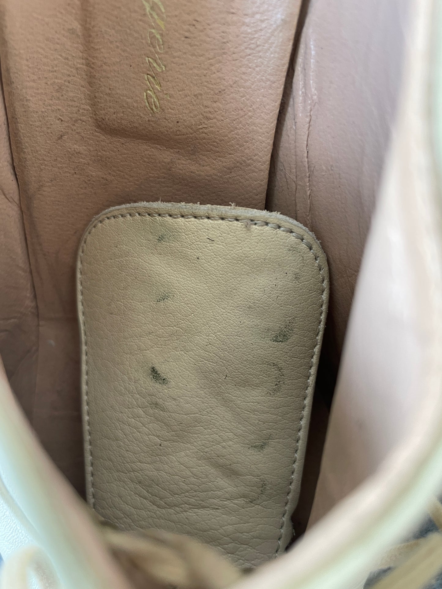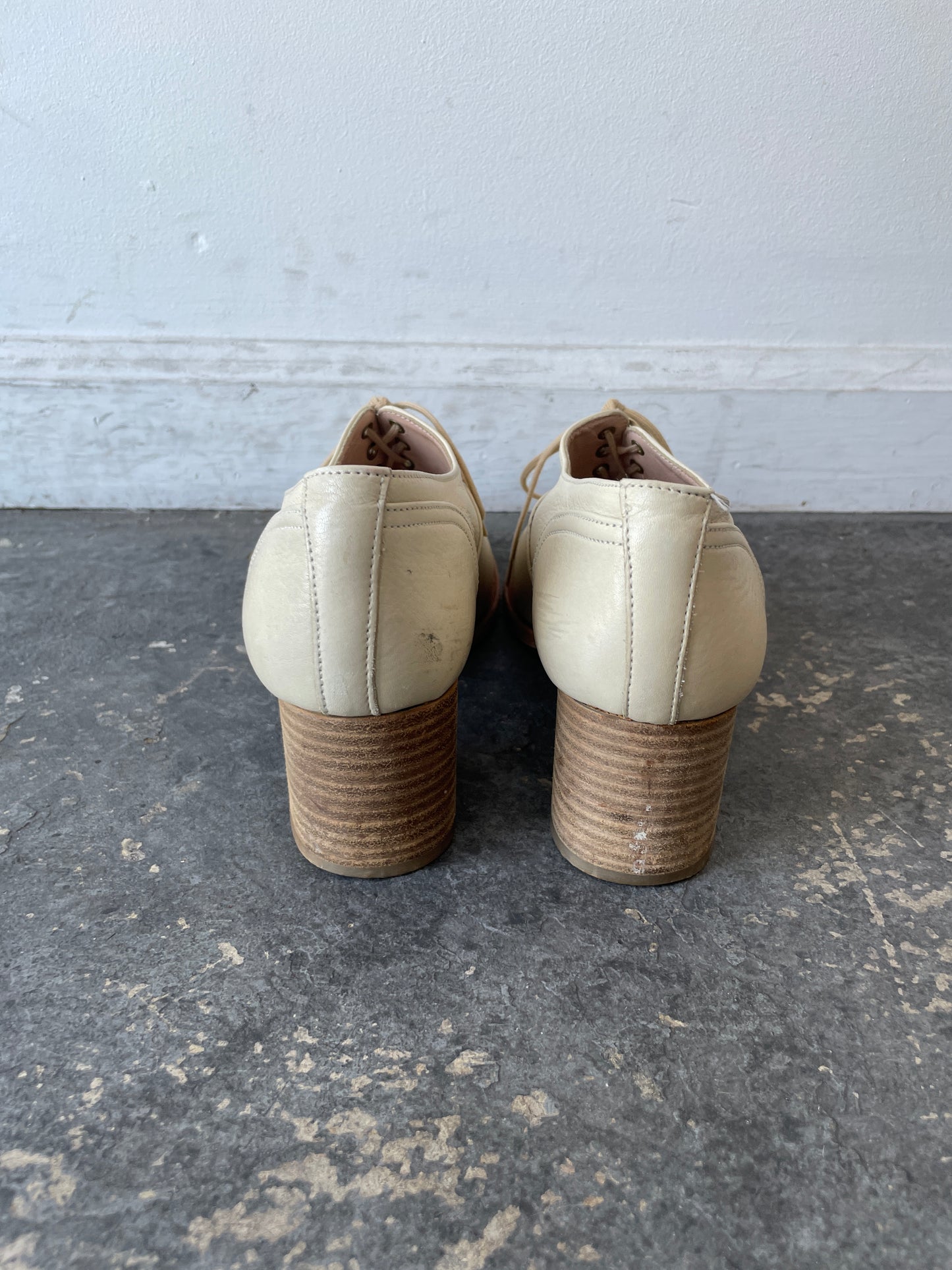 Vintage Robert Clergerie White Spectator Heels. A stylish pair of vintage style heels. Features a wonderful cream colored leather and laced design. Low heel for comfort. Leather upper leather sole. In very good condition some wear. Made in France. Size 7.5.