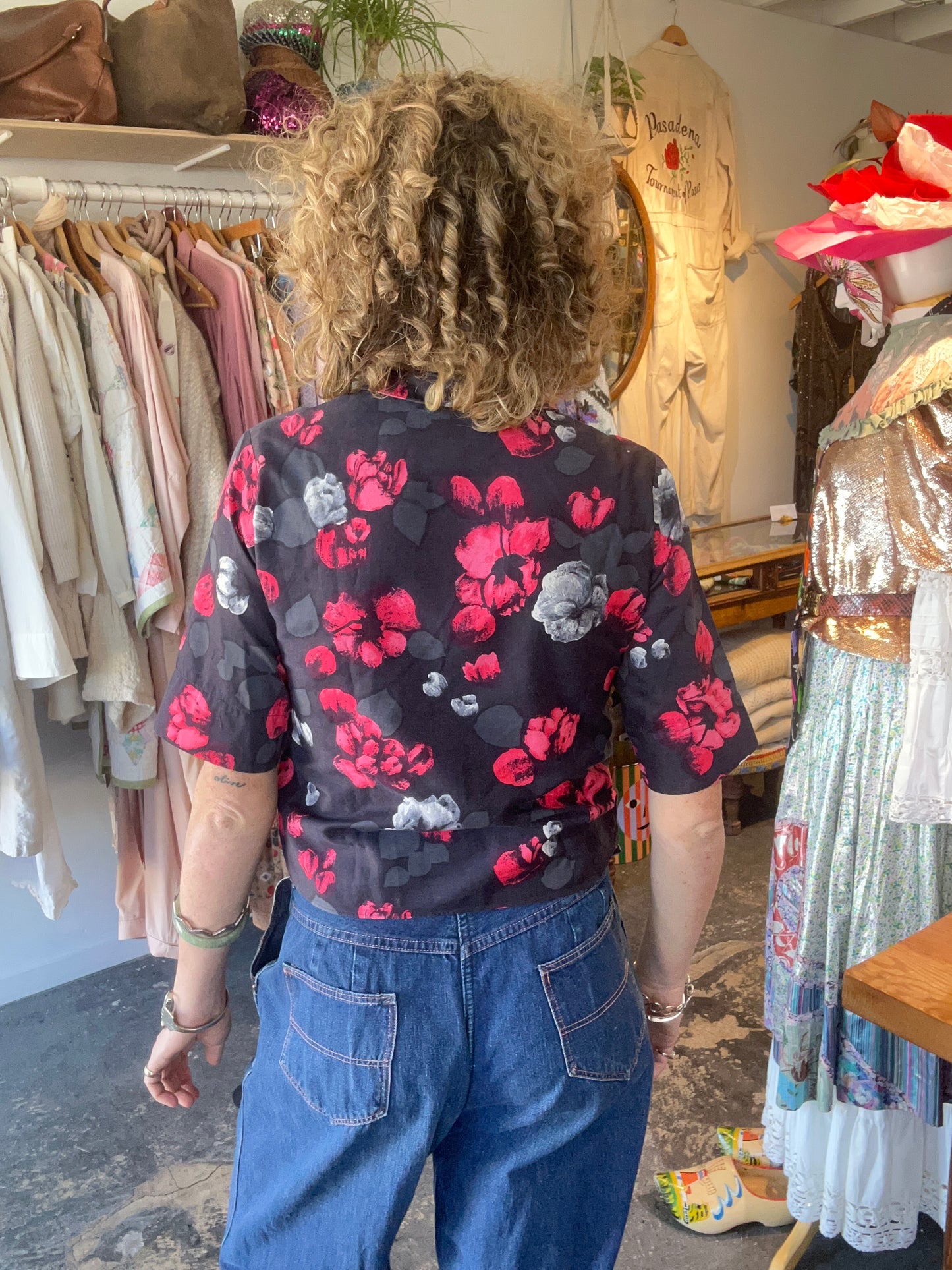 Vintage Rose Pattern Black Short Sleeve Button Down. A lovely little top with a painterly, abstract pattern of large rose petals and buds throughout. Small shiny buttons fasten up the front. Small collar, cropped fit. Unmarked size, best fits a small. Unmarked materials, feels like cotton. In good vintage condition.