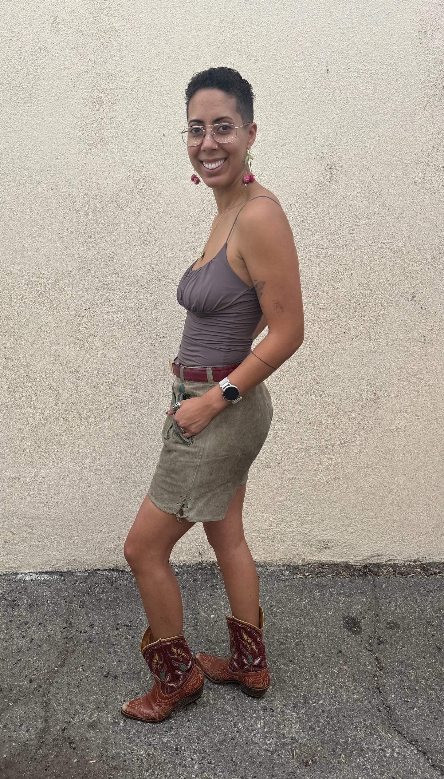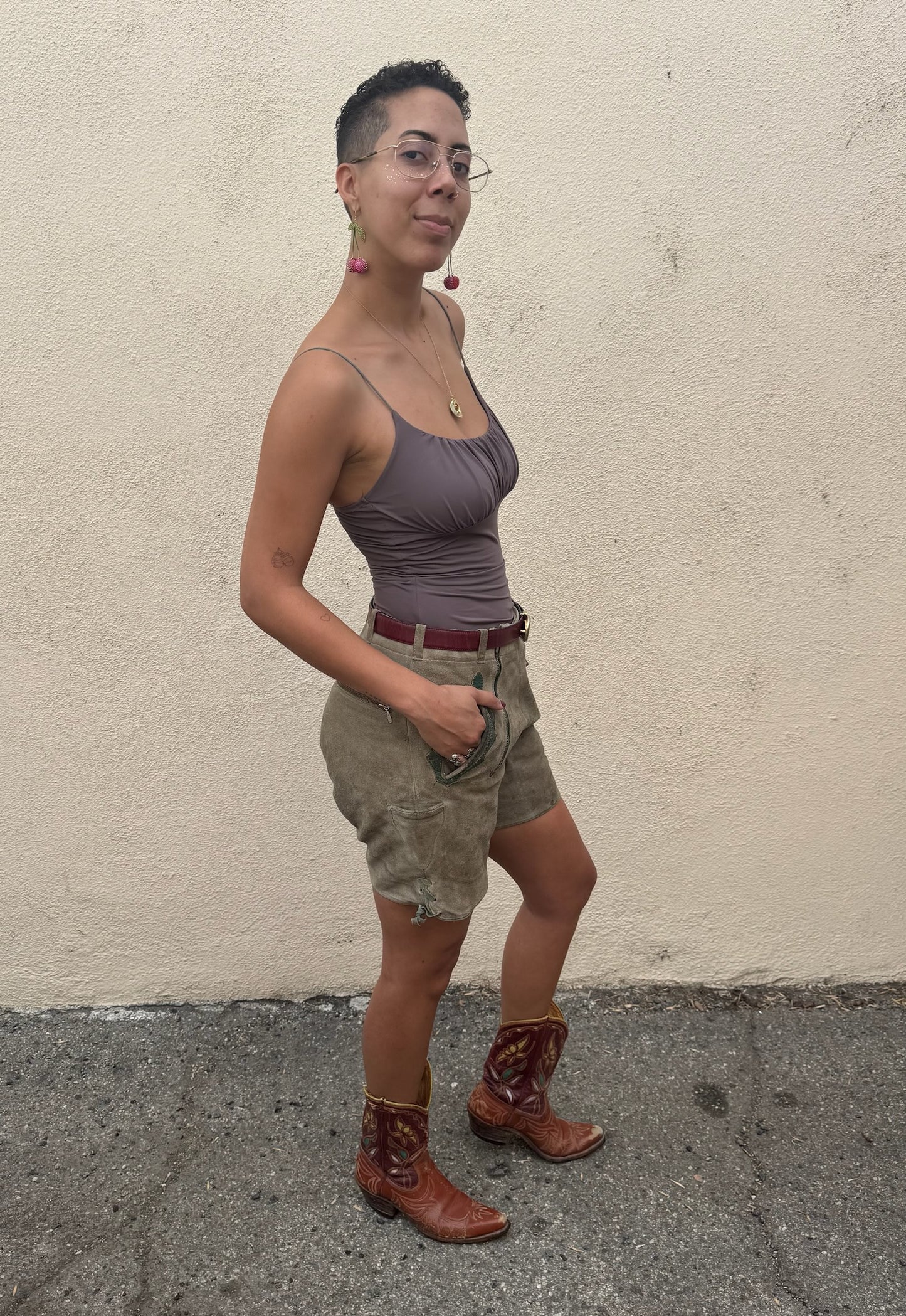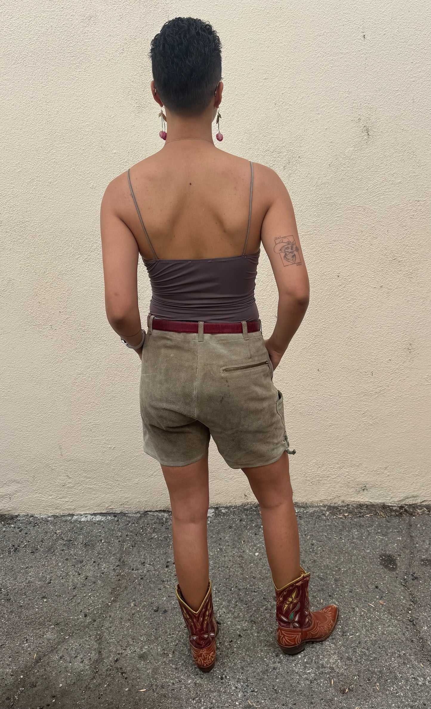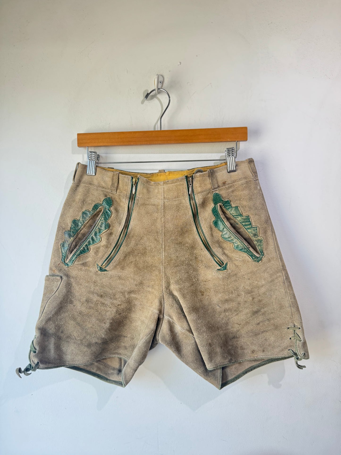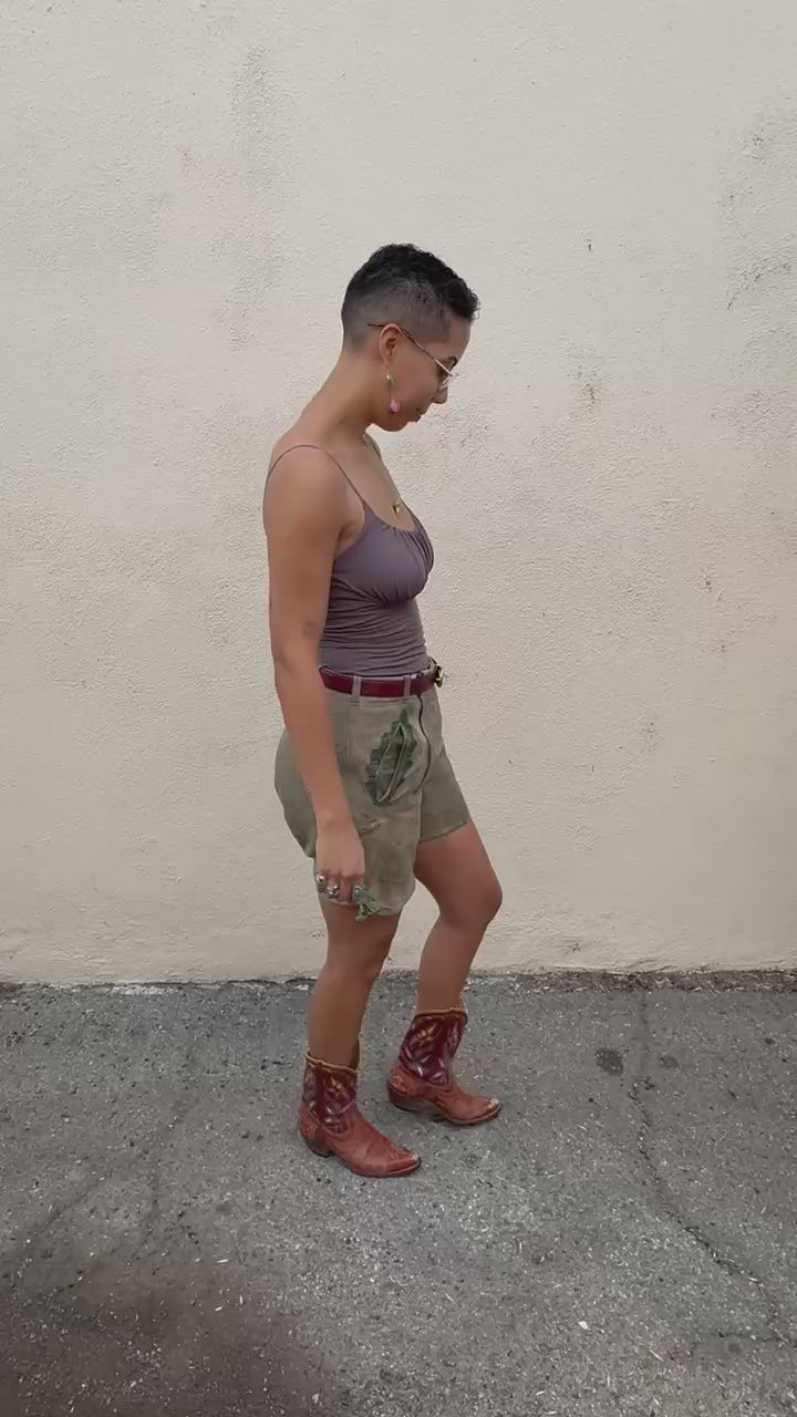 Vintage Lederhosen Suede Shorts, Size M. Fit note: Best for size M. Leather will mold slightly to body over time. Worn vintage with natural patina consistent with age which adds to the charm. Midrise fit. Traditional Bavarian leather shorts with classic green leather trim and double waist front zip closure. Soft, broken-in suede leather with that authentic alpine energy, perfect for festival season, a costume moment, or styling with a tee and boots for unexpected everyday edge. Adjustable buttoned suspender loops (suspenders not included).