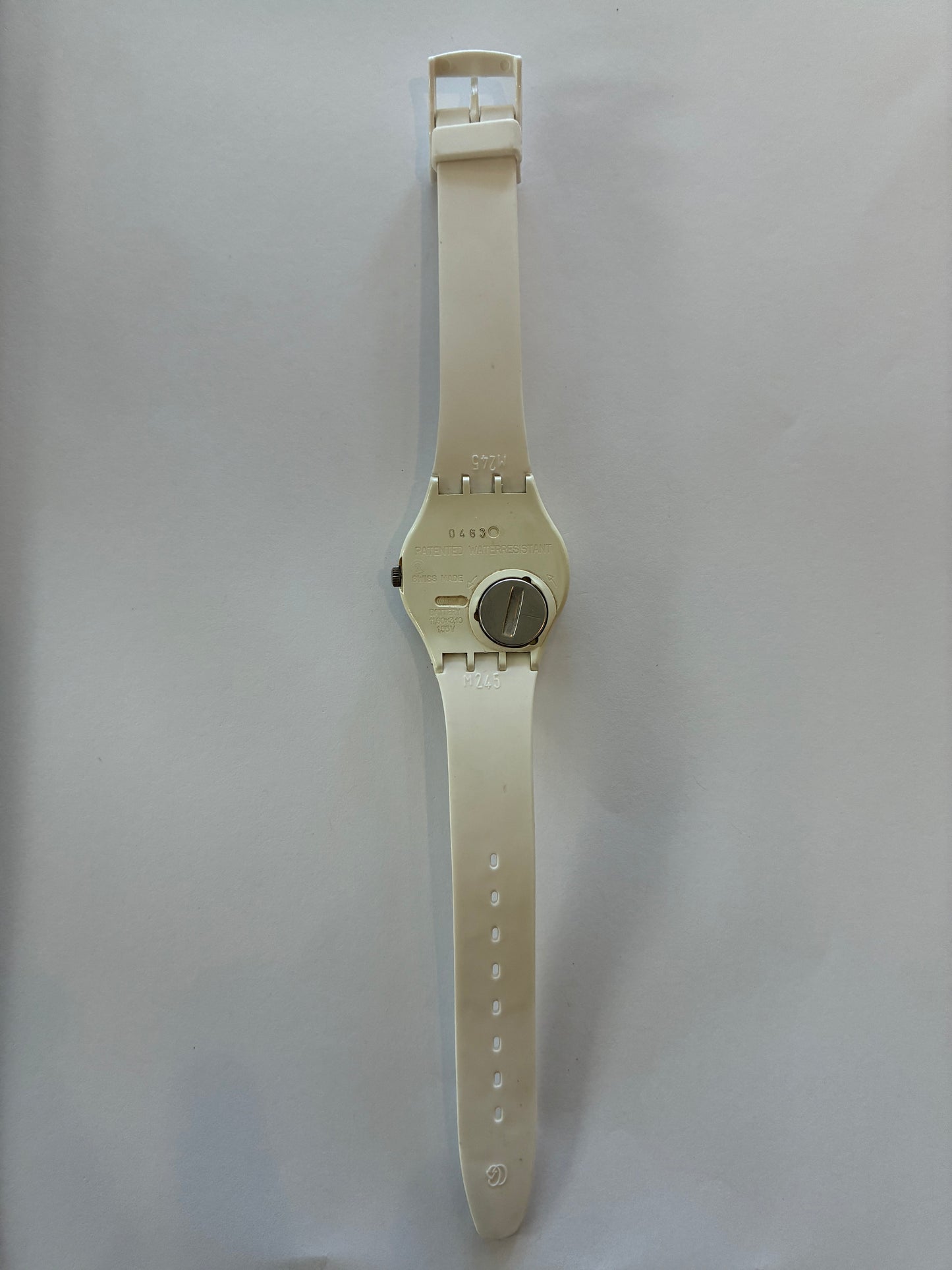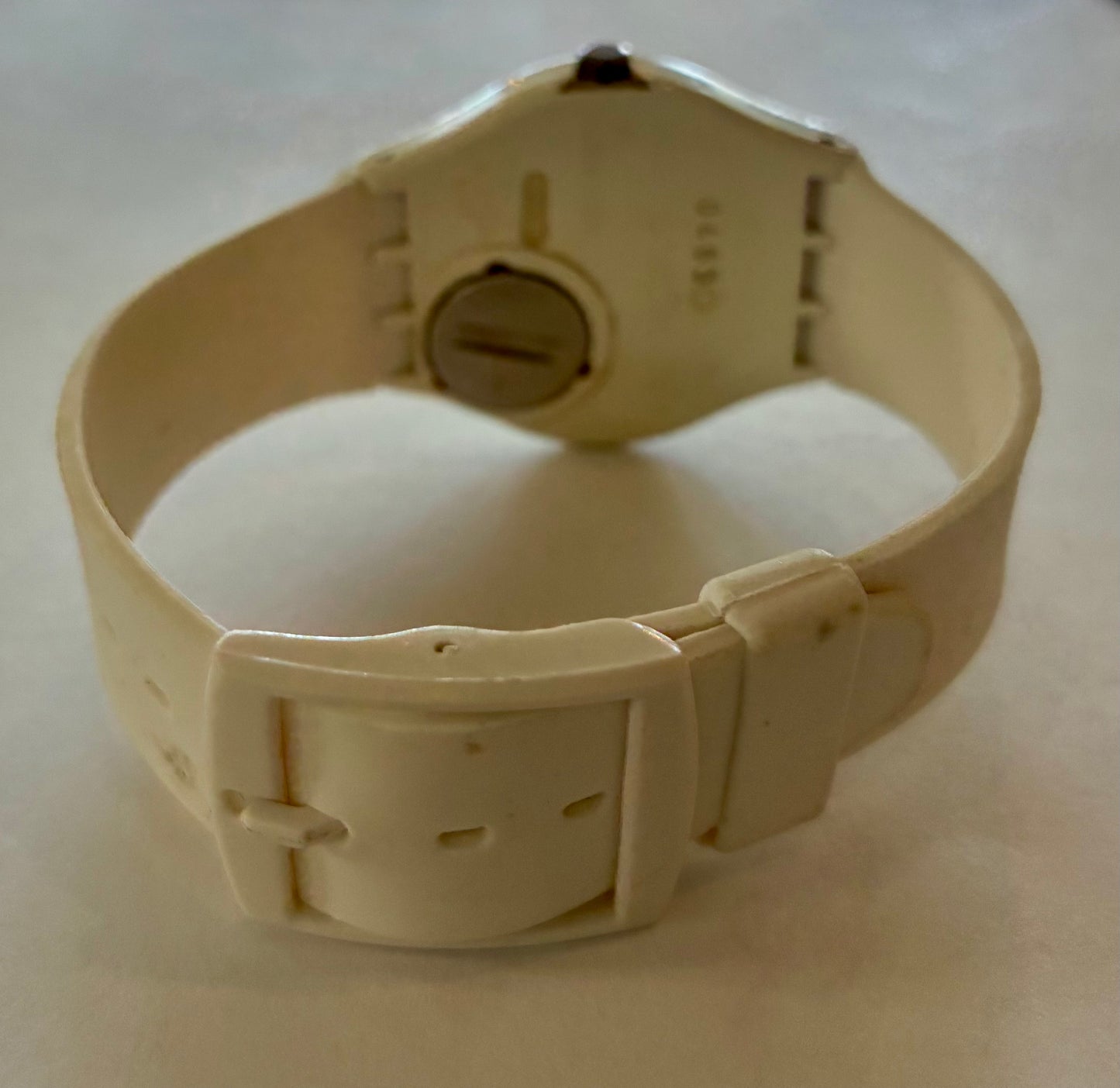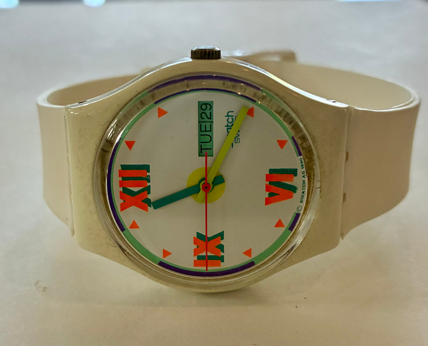 Vintage Swatch 1980s Short Leave Watch. Fun and functional, this vintage Swatch Watch features a white face with neon orange Roman numerals paired with turquoise and neon yellow hands. Date is displayed in a digital window at three o'clock and the white plastic band is a sign of the times! Watch is in excellent vintage condition, band is free of cracks, creases and stains, face is free of scratches.