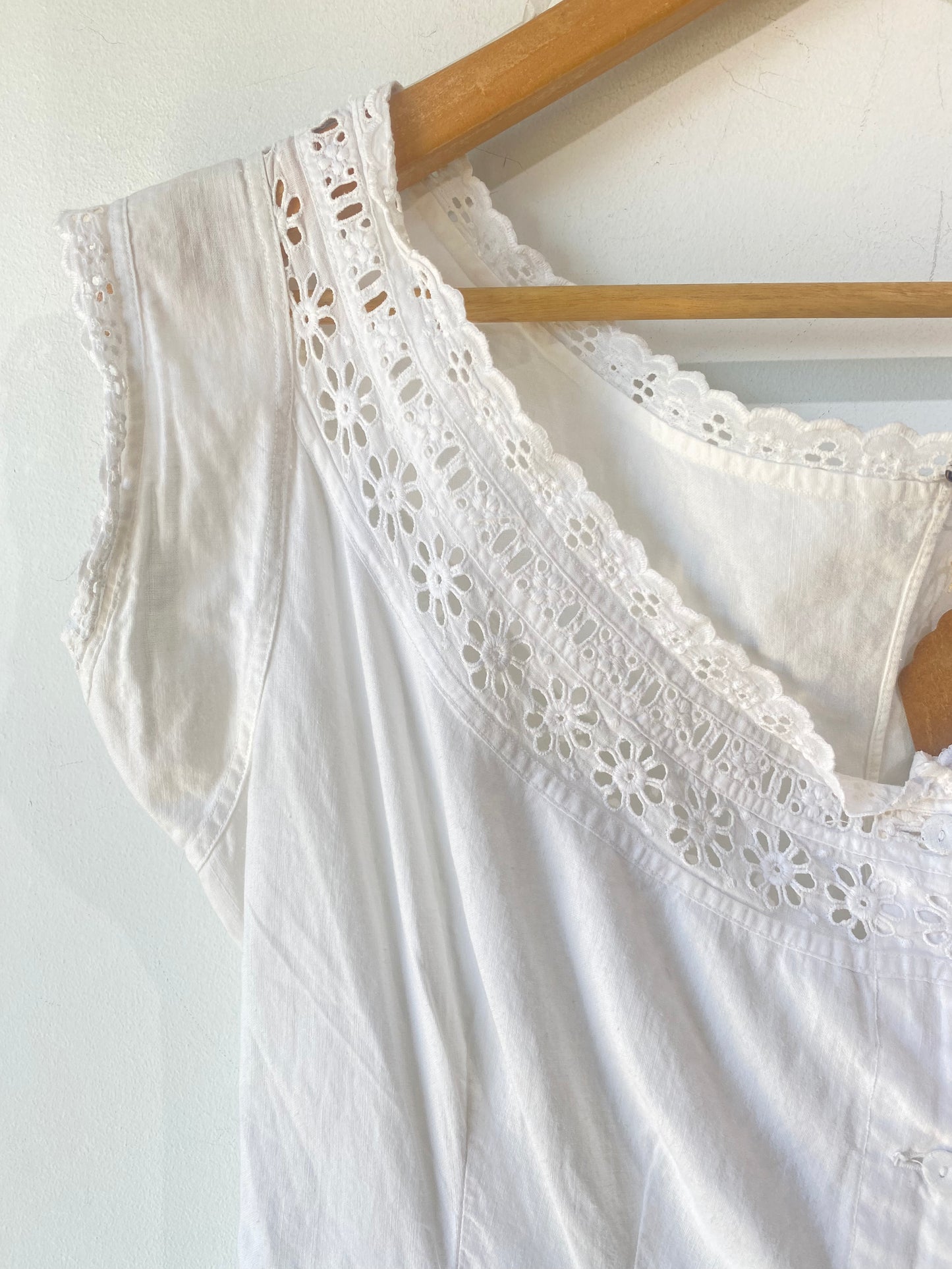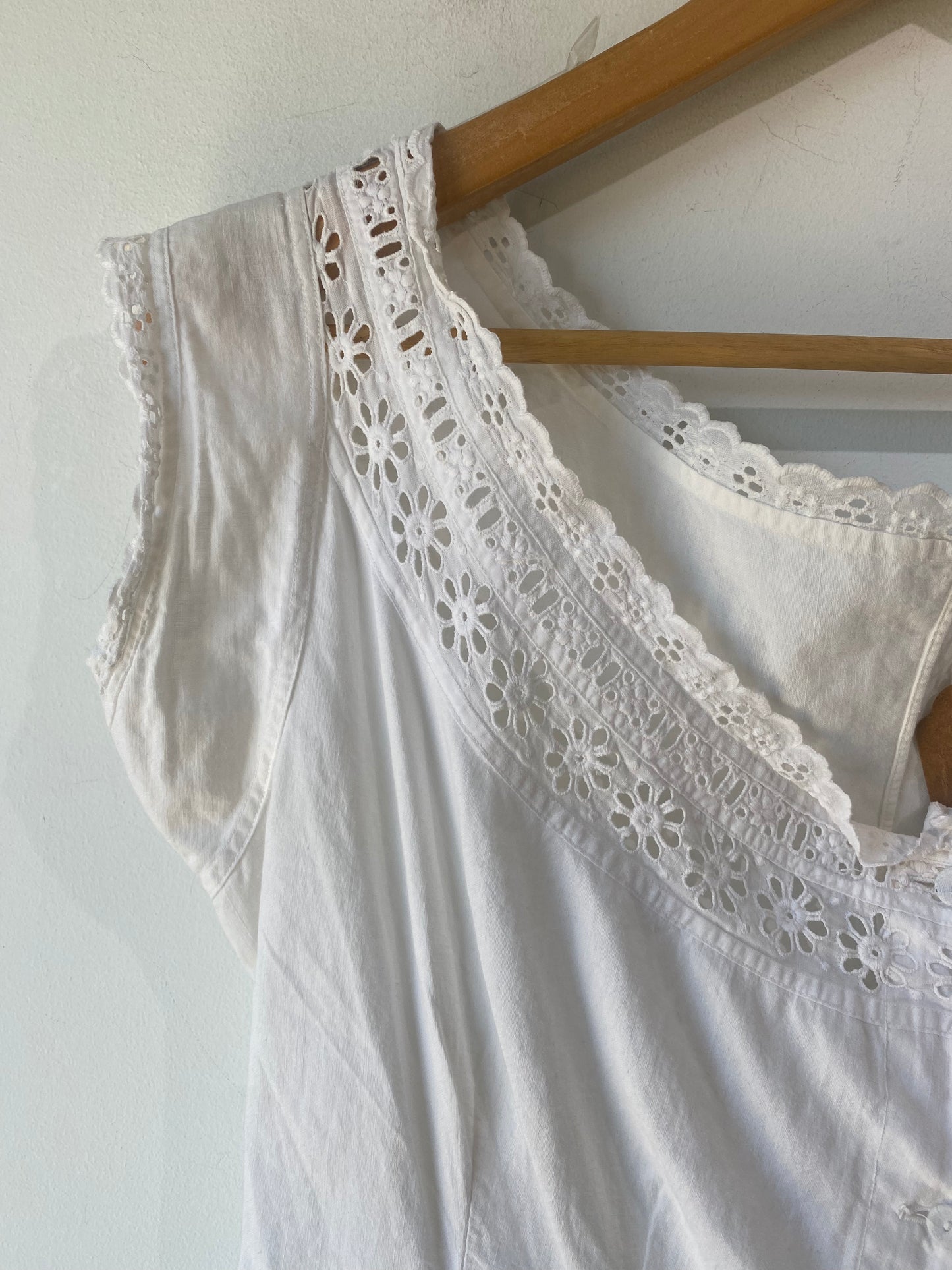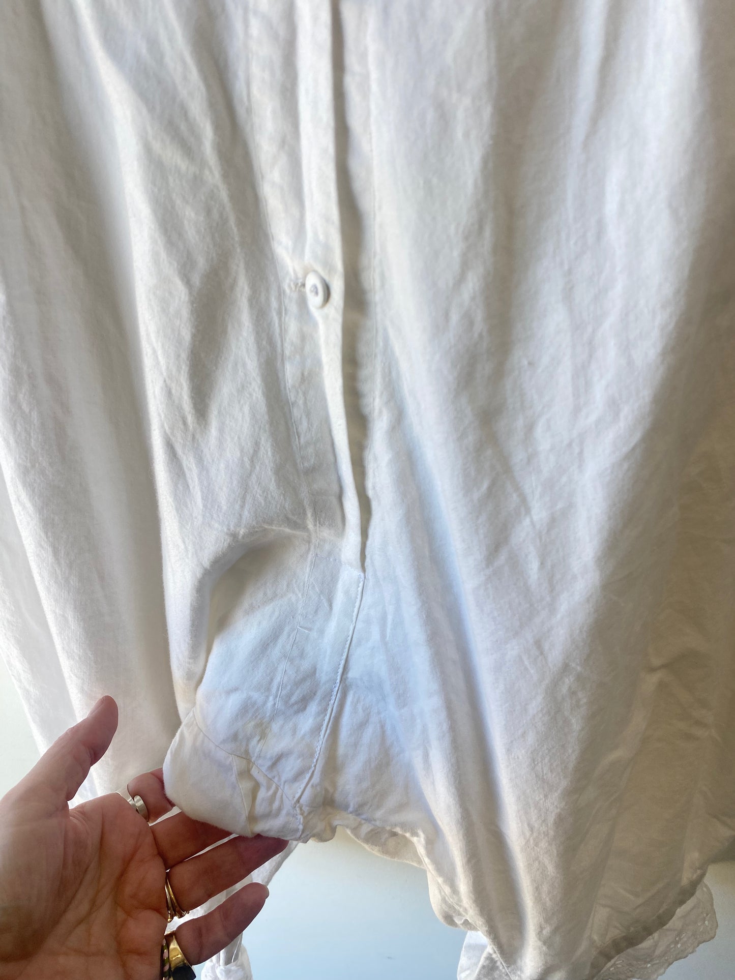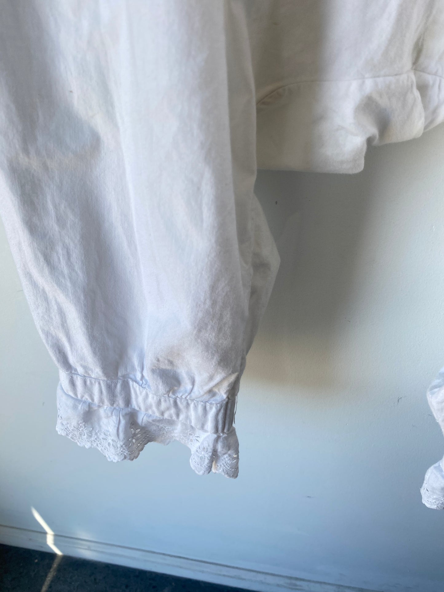 A rare and utterly charming relic from the Victorian era, this one-piece undergarment (often called a “combination suit”) was the original playsuit before playsuits were even a thing. Made of crisp white cotton with delicate crochet lace trim at the neckline, shoulders, and cuffs, it buttons down the front and gathers softly at the legs for a romantic, bloomeresque silhouette.