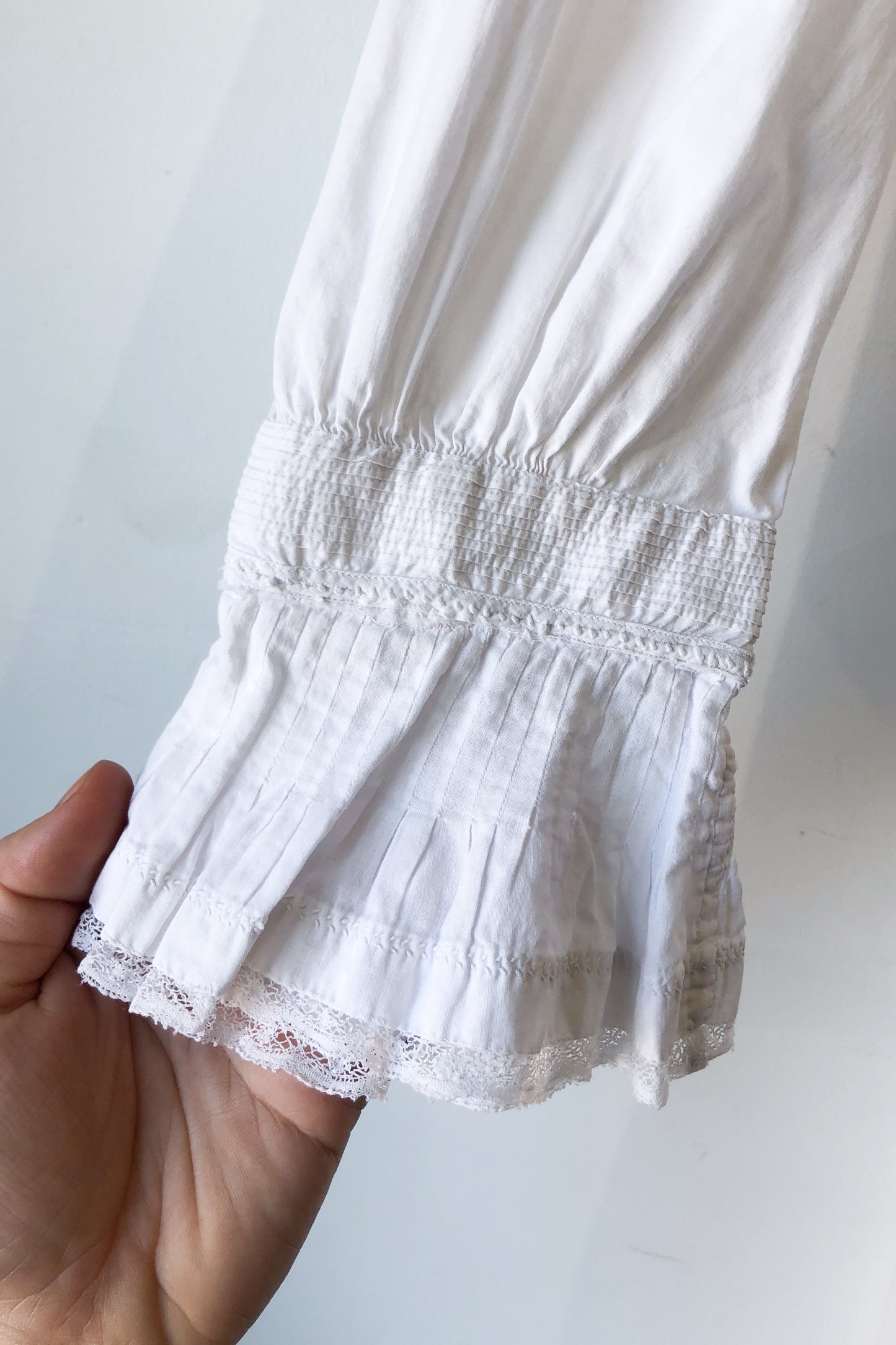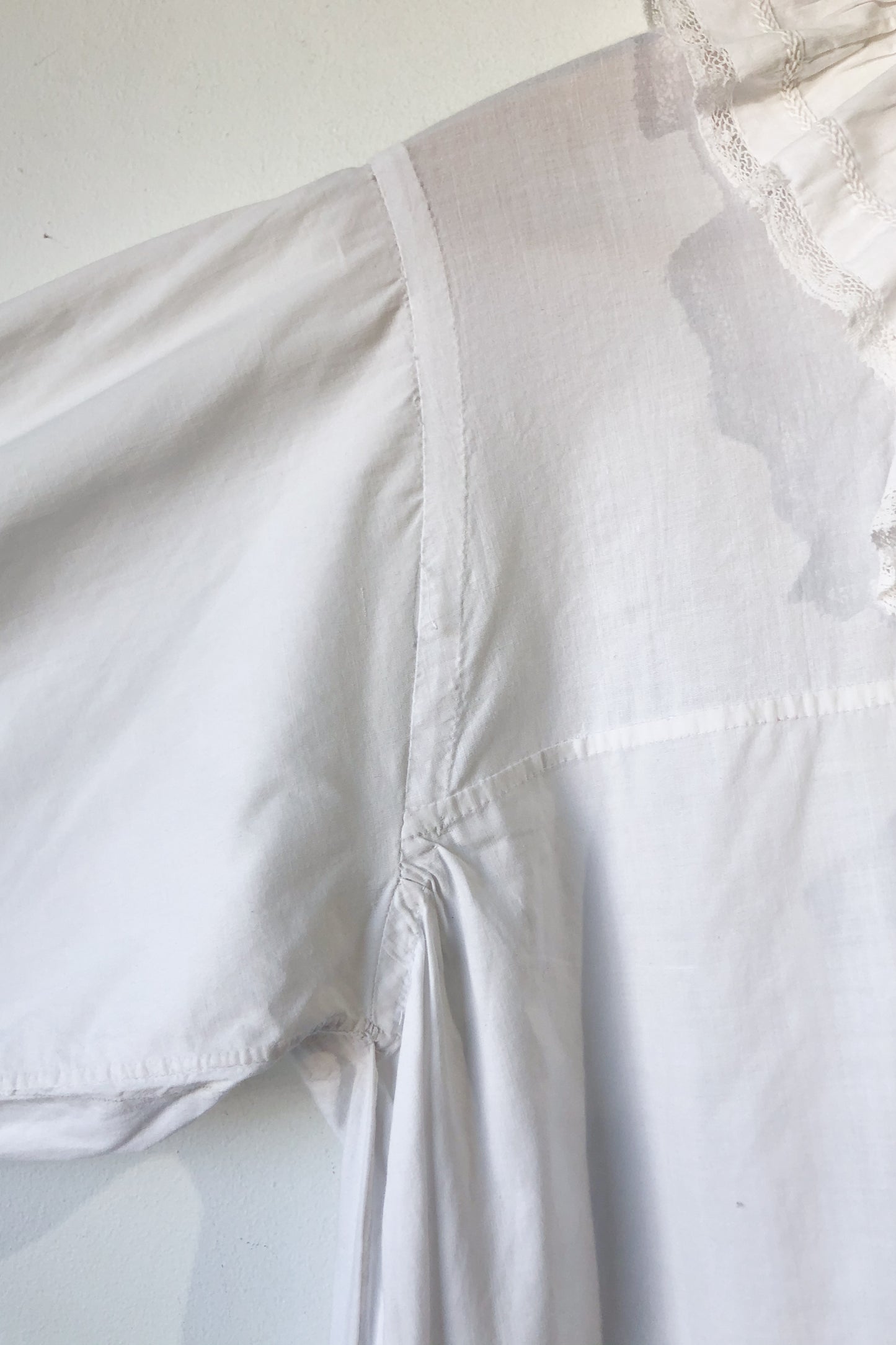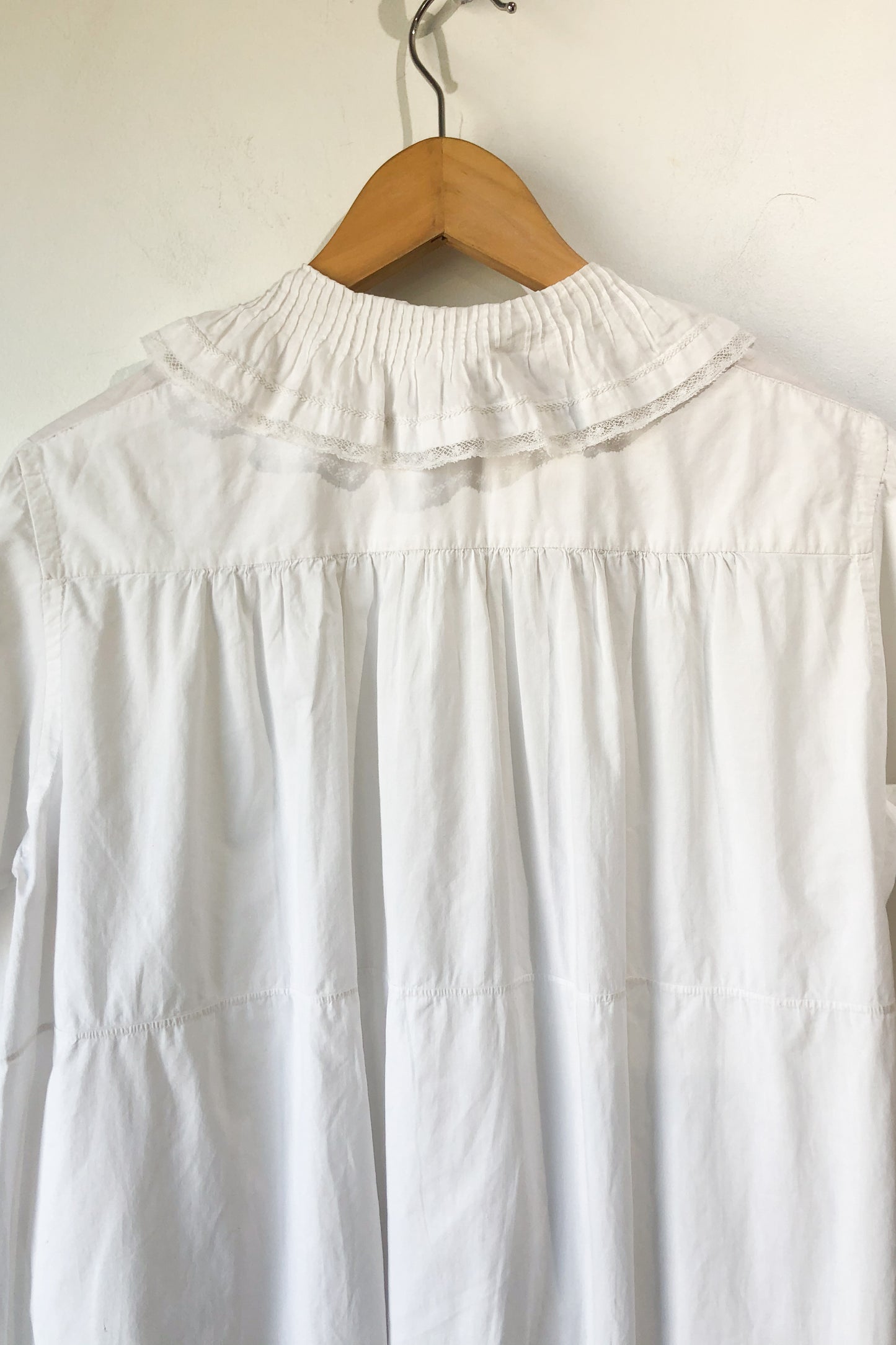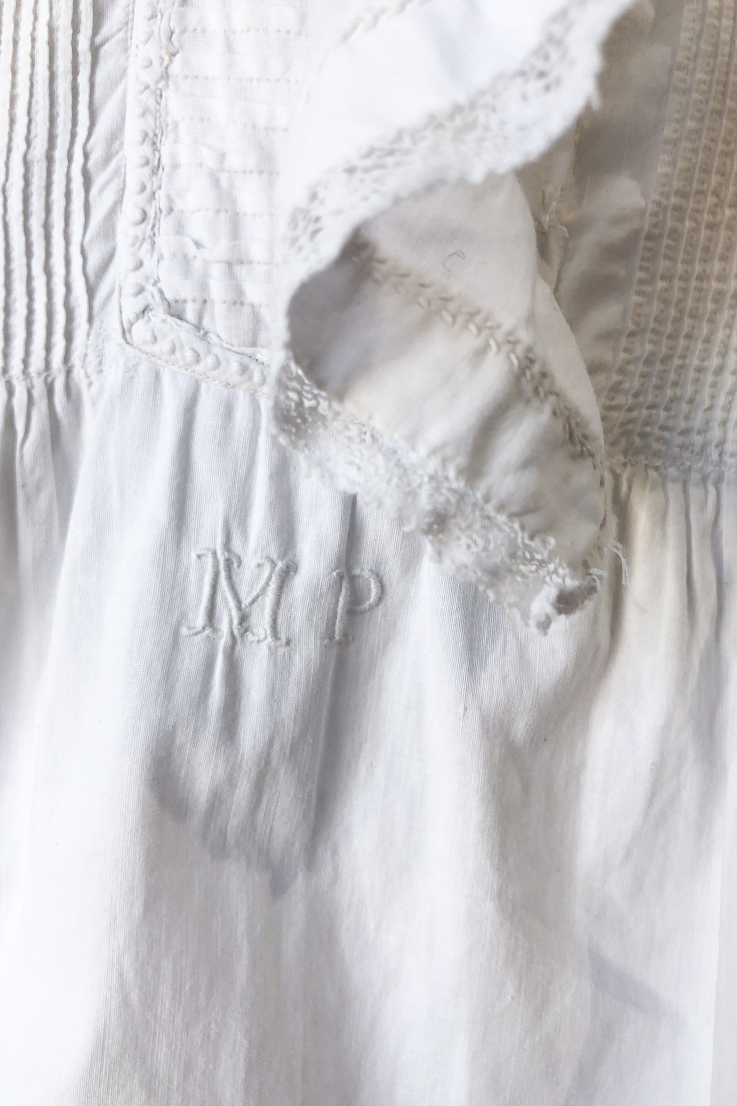 Vintage Victorian White Lace Trim Dress. As is, has some repairs and small holes. White cotton woven midi length nightgown with lace trim ruffle and pintucks throughout. Has small embroidered monogram at front body. No marked content, feels like cotton. Hand wash cold. No marked size, fits S/M best. Has a small armhole, 8".