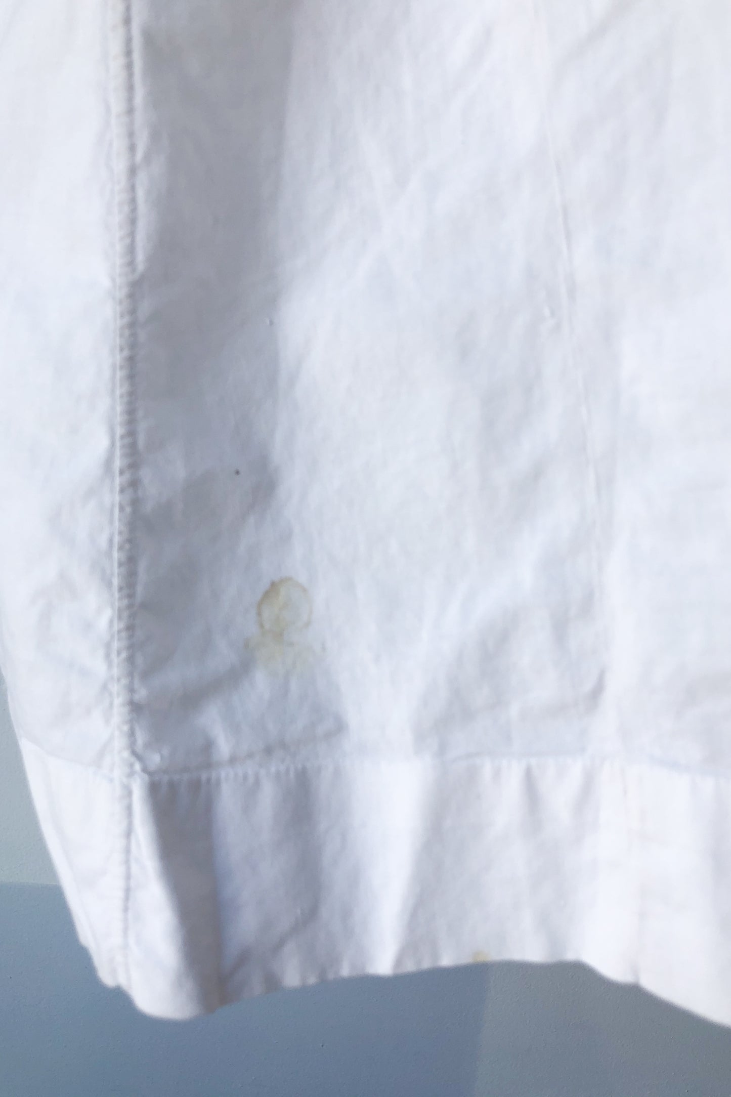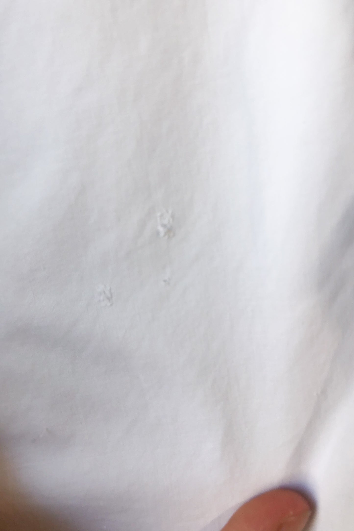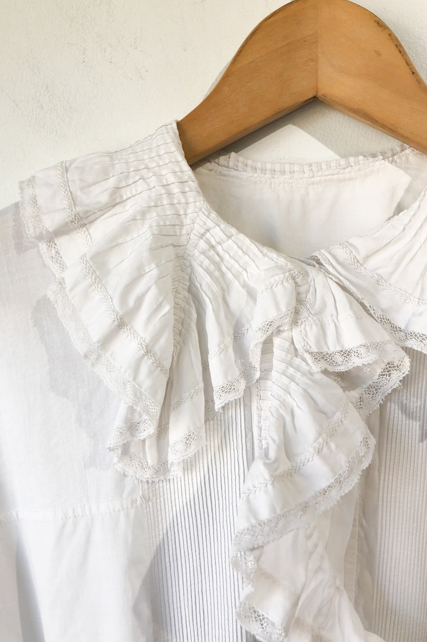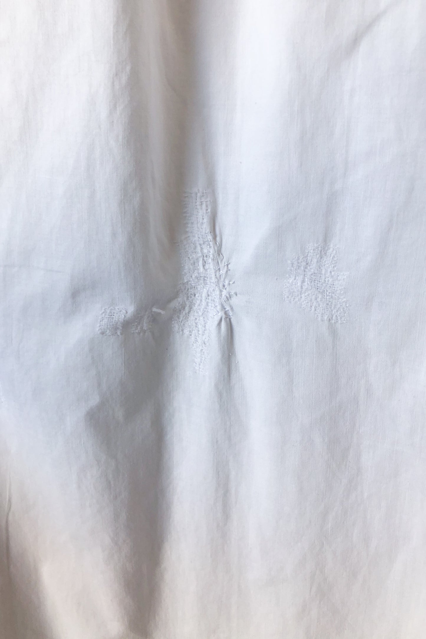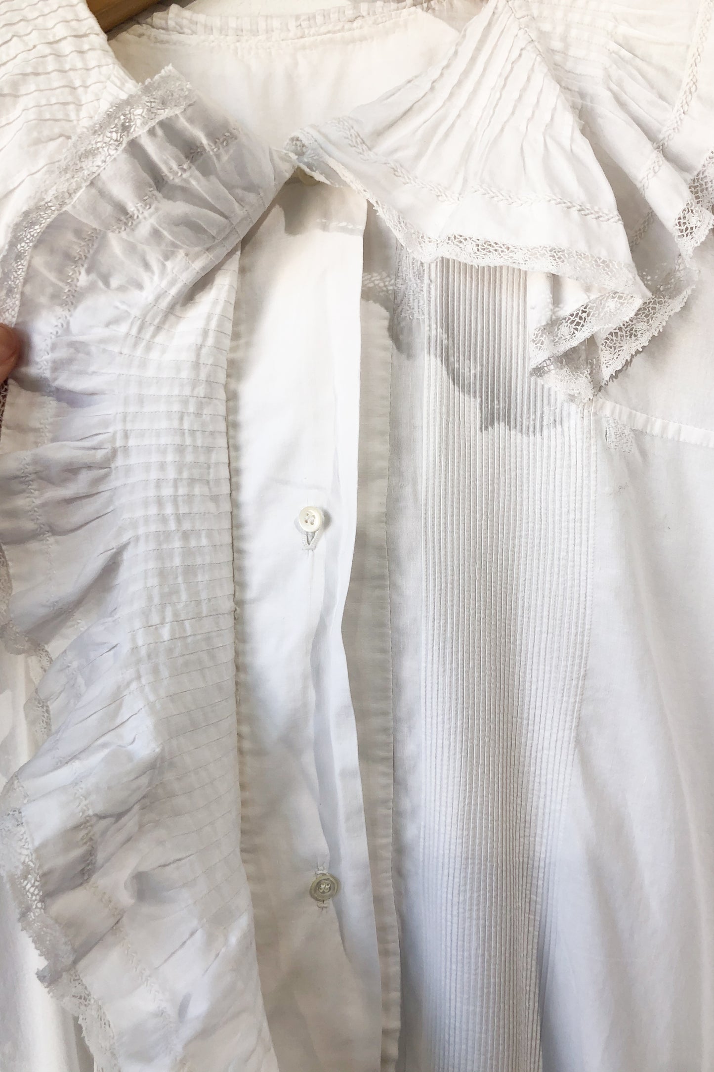 Vintage Victorian White Lace Trim Dress. As is, has some repairs and small holes. White cotton woven midi length nightgown with lace trim ruffle and pintucks throughout. Has small embroidered monogram at front body. No marked content, feels like cotton. Hand wash cold. No marked size, fits S/M best. Has a small armhole, 8".